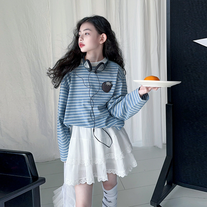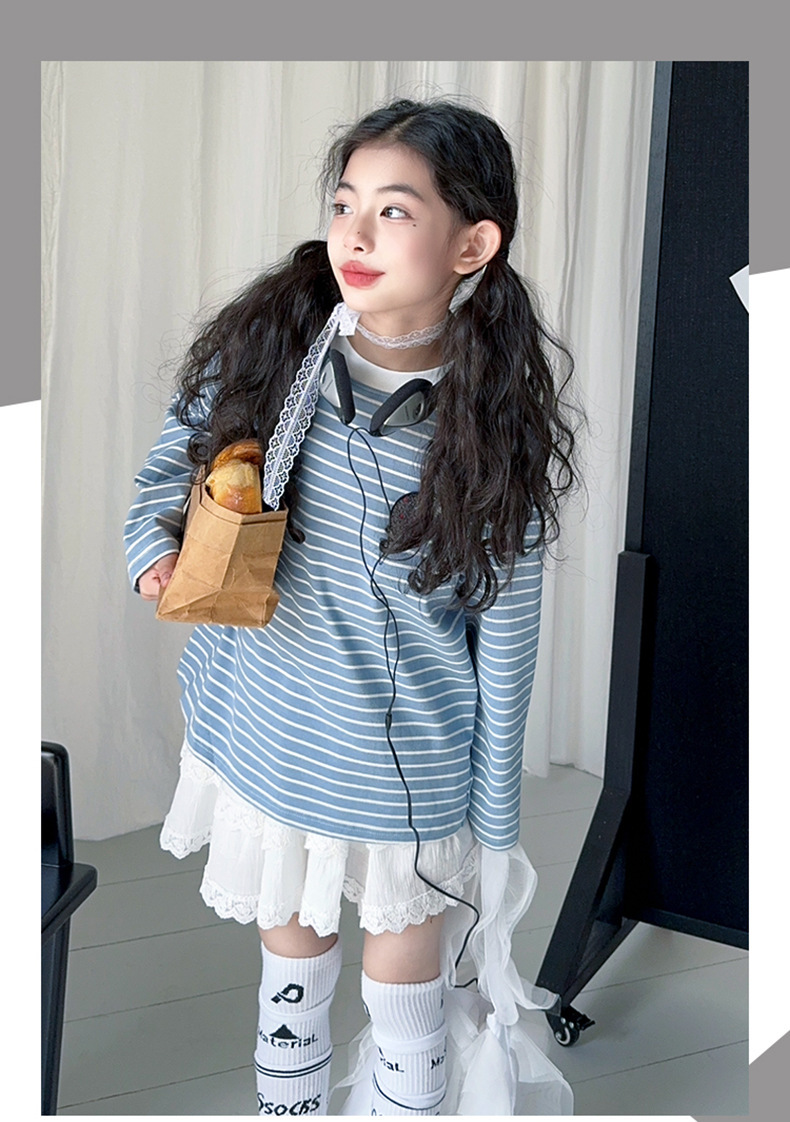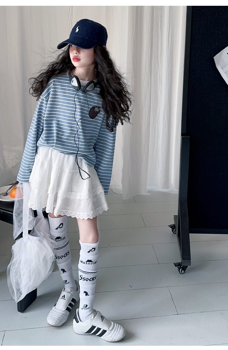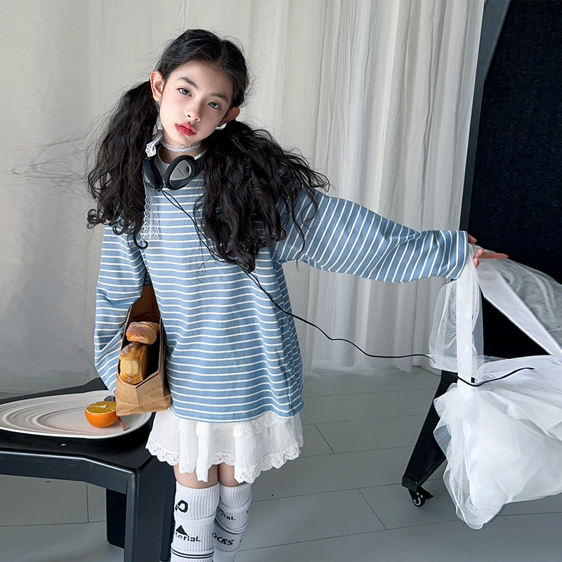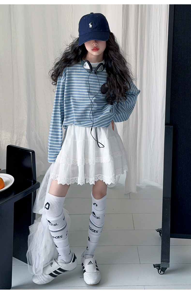 소녀의 줄무늬 티셔츠 스커트 세트 봄과 가을 소녀의 트렌디 한 쿨 루즈 탑 레이스 케이크 스커트