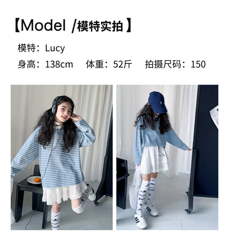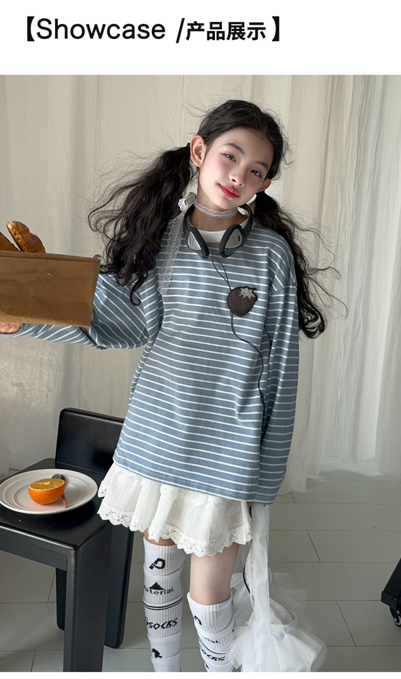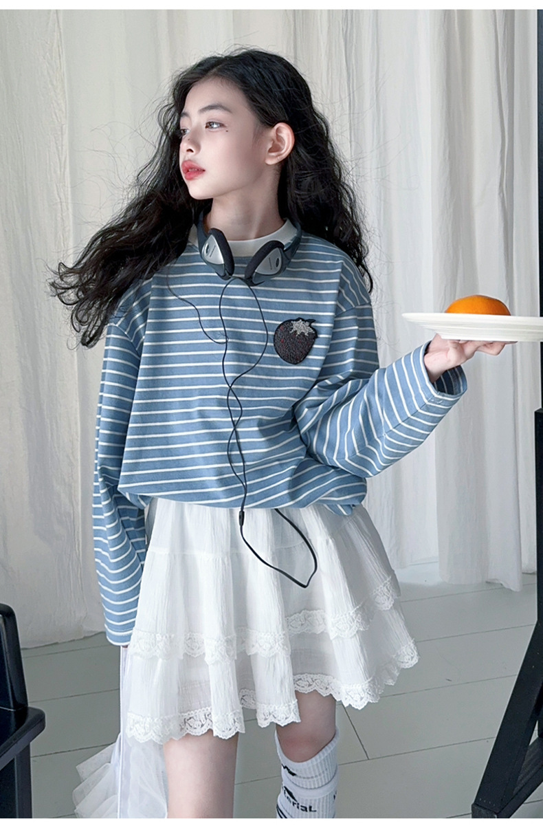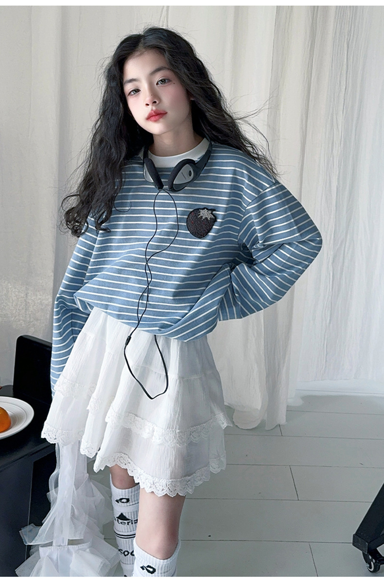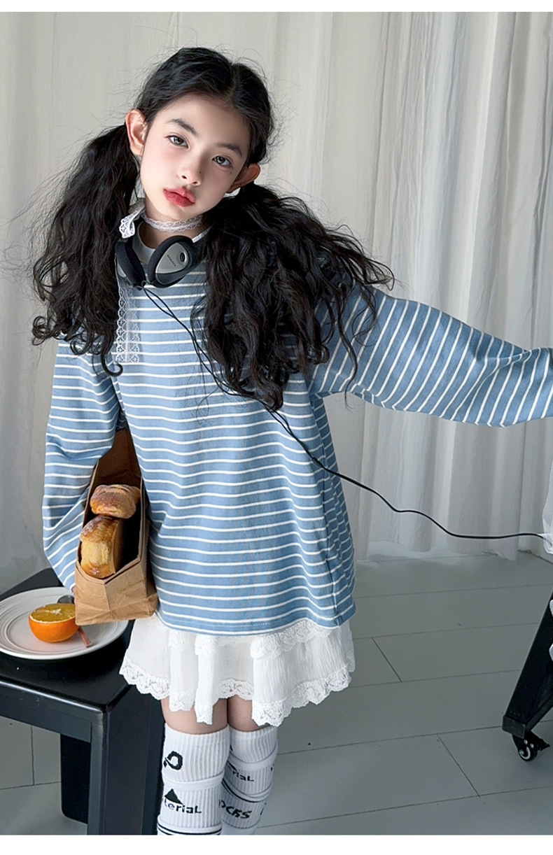 소녀의 줄무늬 티셔츠 스커트 세트 봄과 가을 소녀의 트렌디 한 쿨 루즈 탑 레이스 케이크 스커트