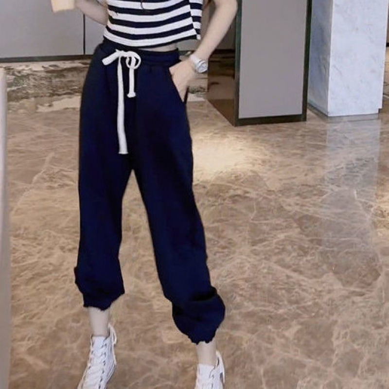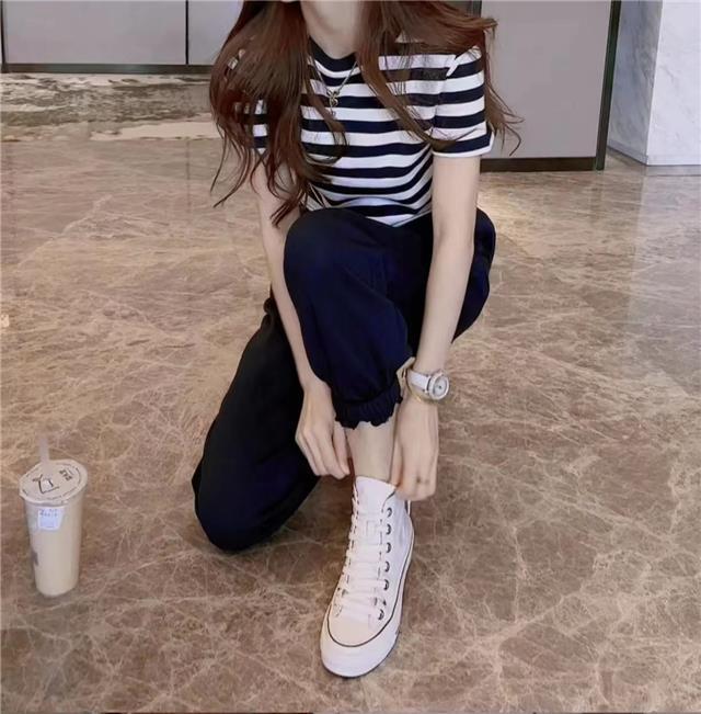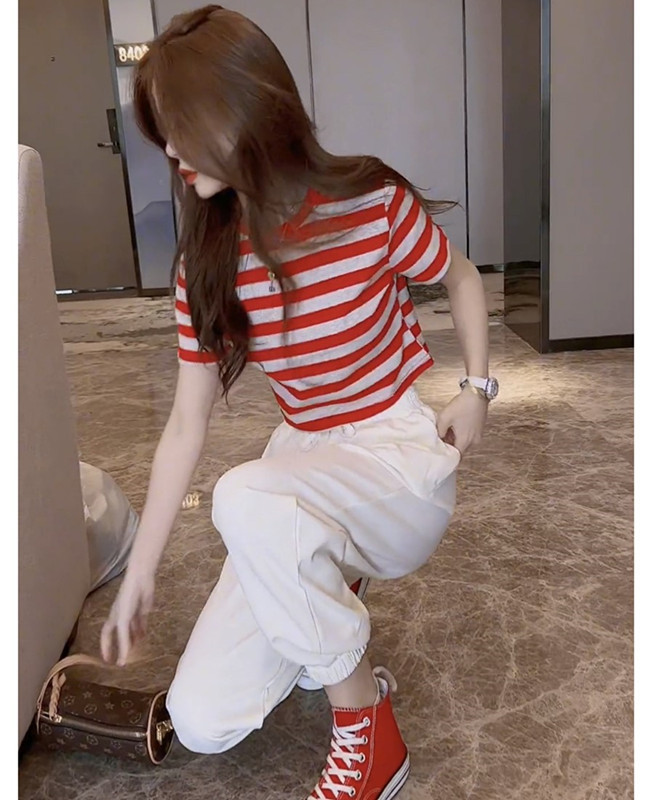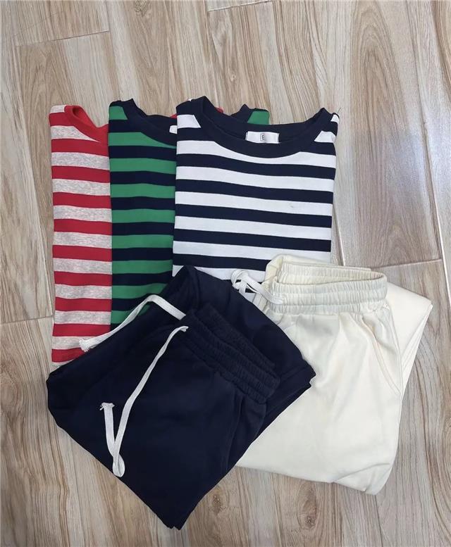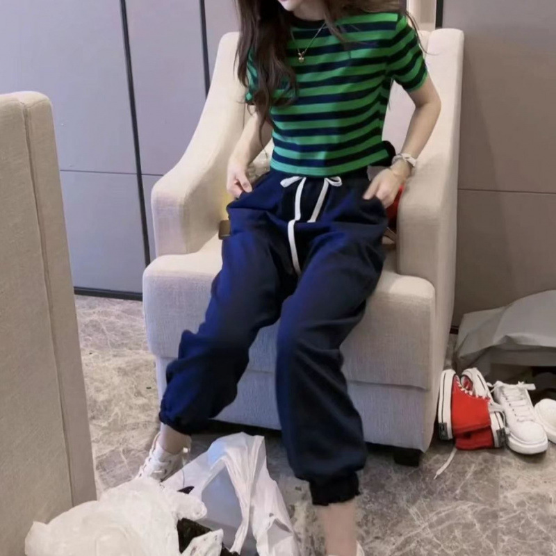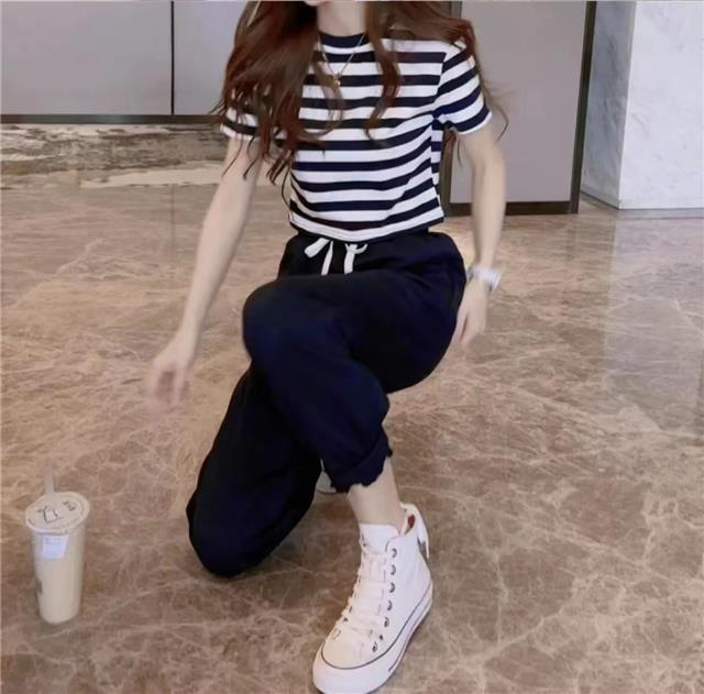 2025 여름 새로운 캐주얼 세트 여성 짧은 줄무늬 티셔츠 짧은 소매 슬리밍 캐주얼 스포츠 바지 투피스 세트