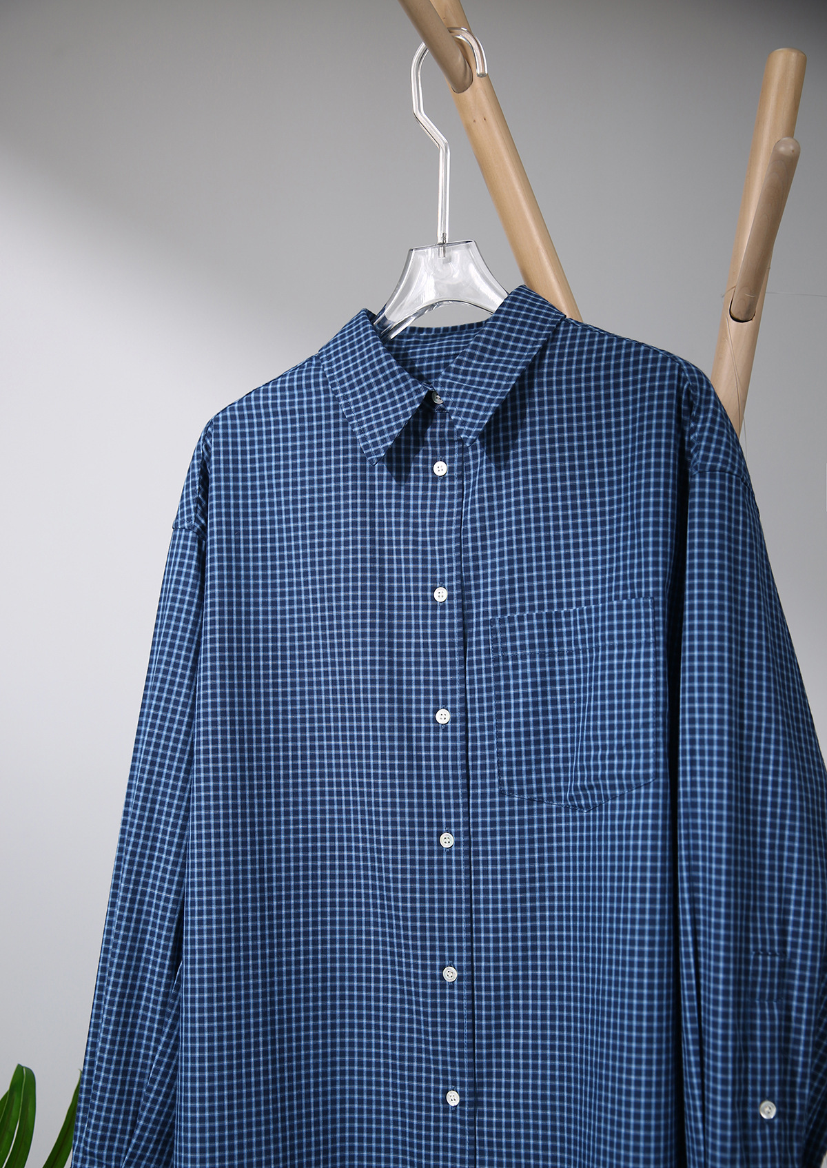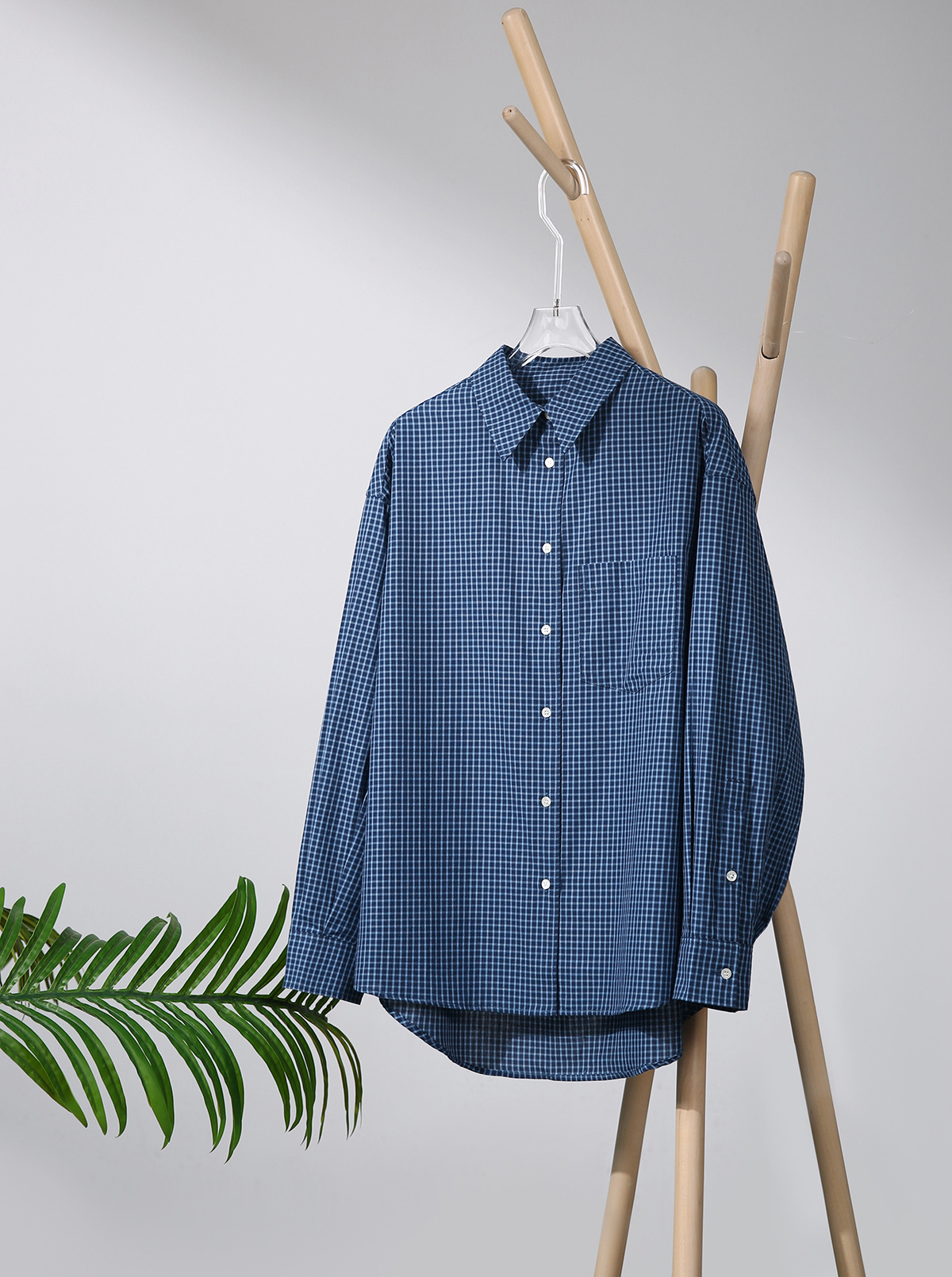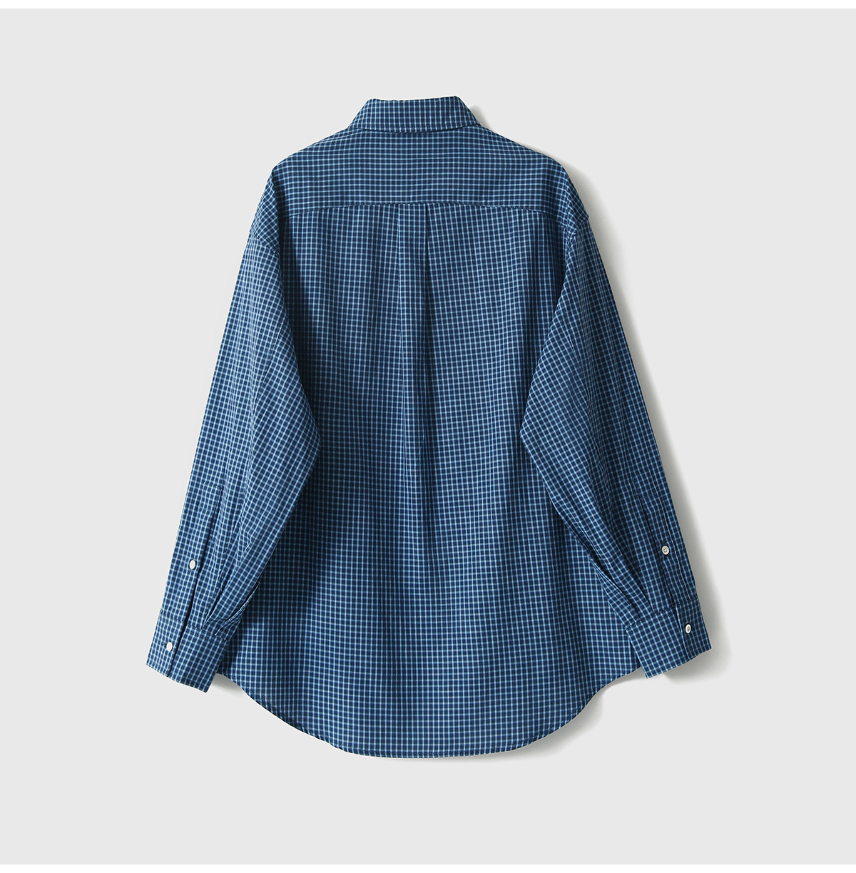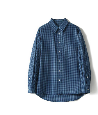 프랑스 스타일 레트로 블루와 화이트 격자 무늬 셔츠 여성용 봄 폴로 칼라 중간 길이의 느슨한 게으른 스타일 유행 긴팔 셔츠스토어 가기