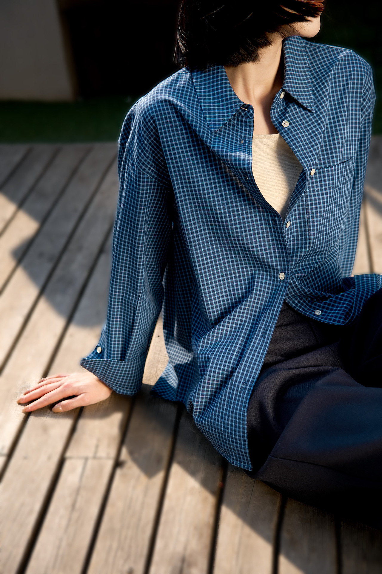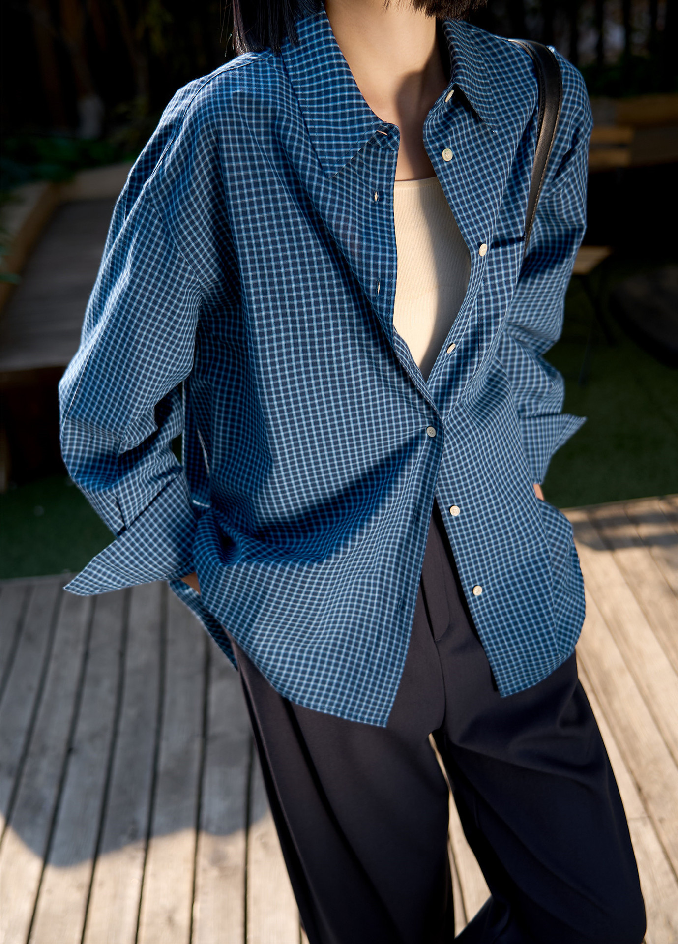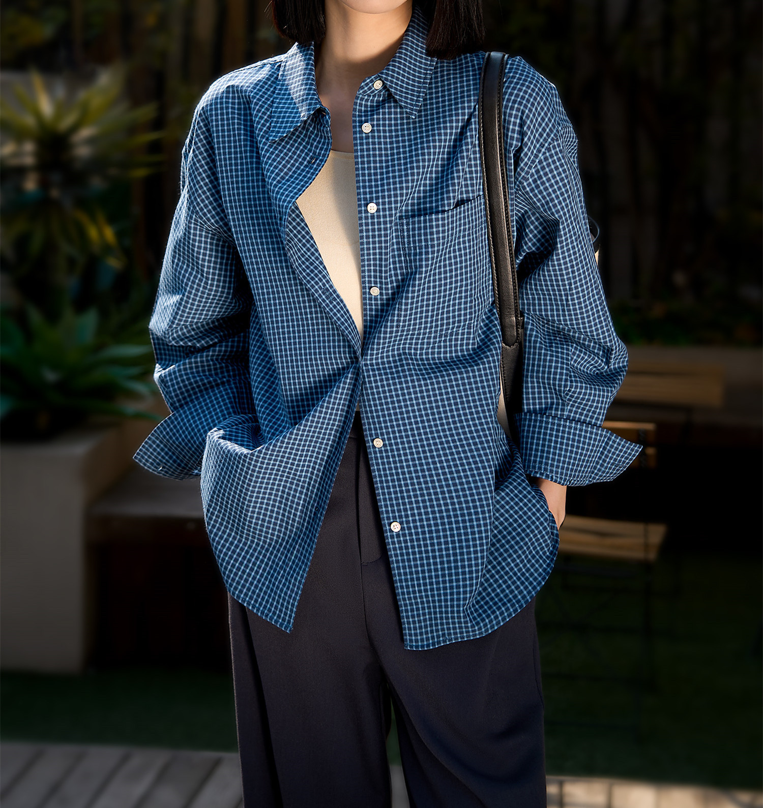 프랑스 스타일 레트로 블루와 화이트 격자 무늬 셔츠 여성용 봄 폴로 칼라 중간 길이의 느슨한 게으른 스타일 유행 긴팔 셔츠스토어 가기