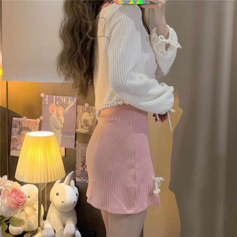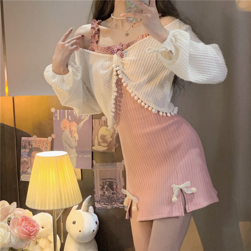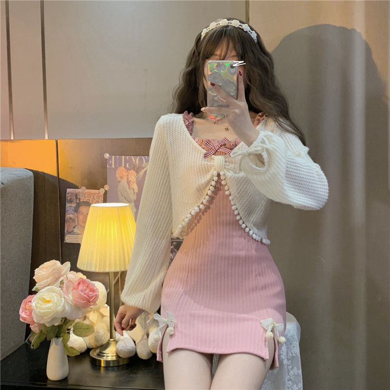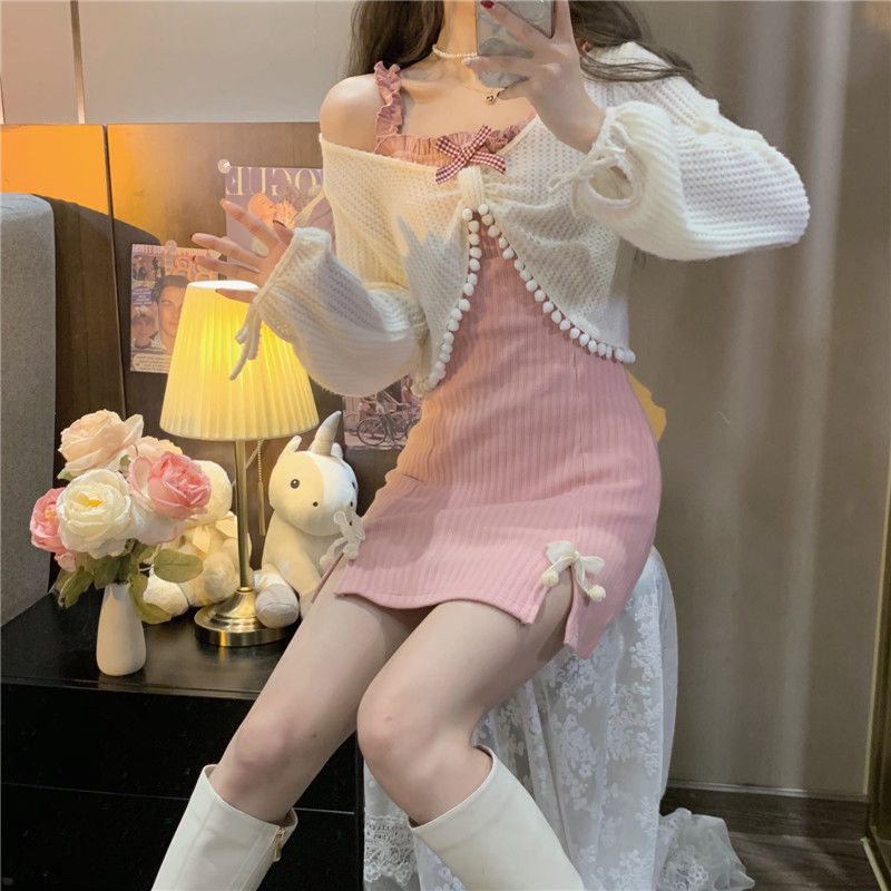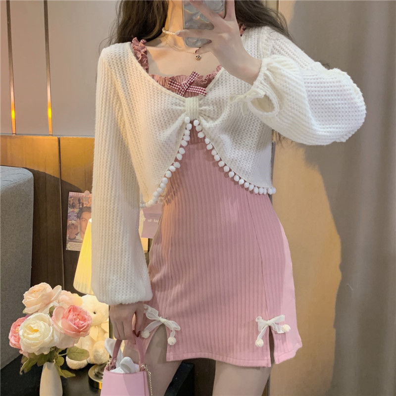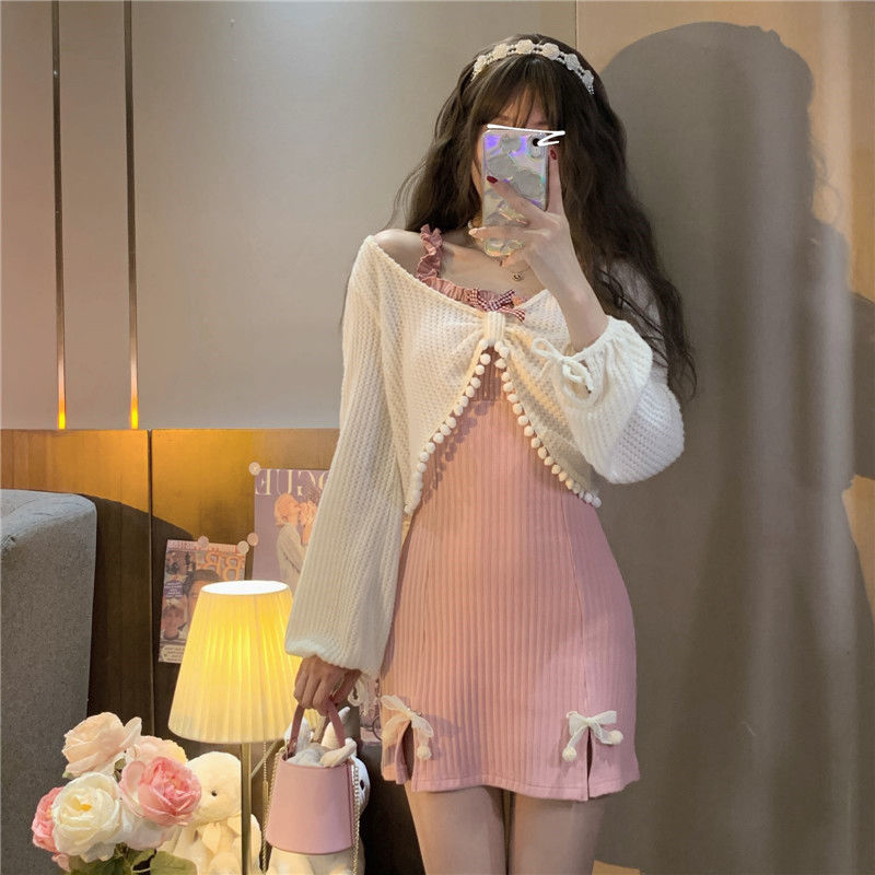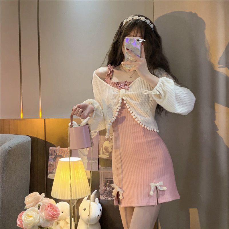 2025 년 봄 새로운 일본 달콤한 활 작은 슬링 짧은 원피스 카디건 투피스 세트