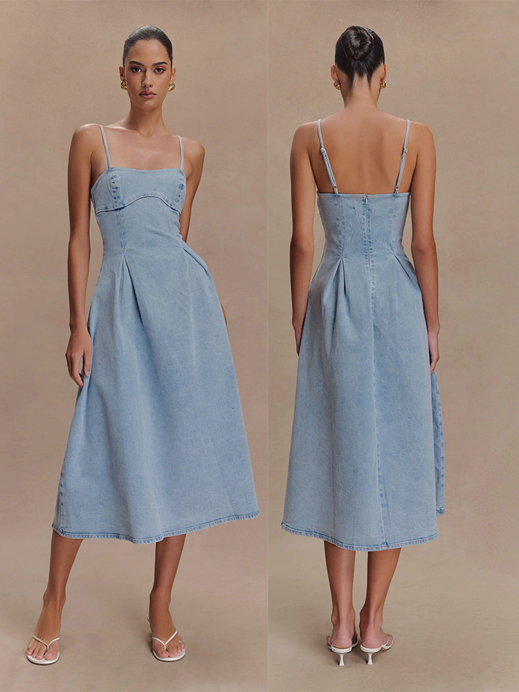 2025 유럽과 미국의 섹시한 여성 국경 여름 새로운 스트랩없는 솔리드 컬러 민소매 데님 슬링 원피스 8906