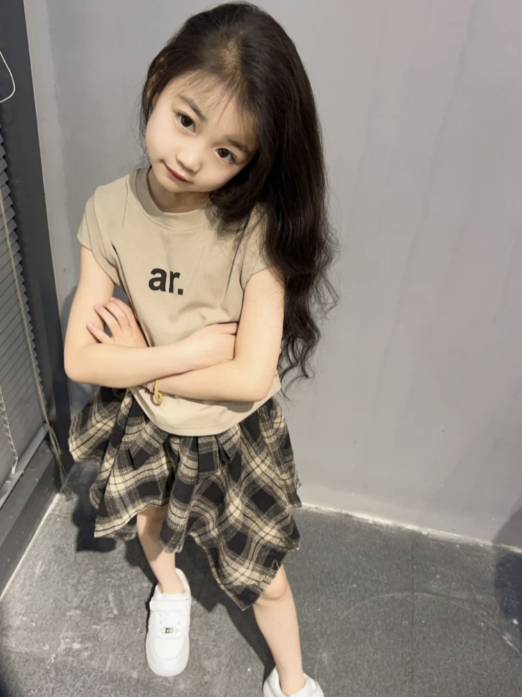 소녀 2025 캐주얼 새로운 투피스 인터넷-유명한 불규칙한 격자 무늬 스커트 여름 반팔 티셔츠 세트 한국식스토어 가기