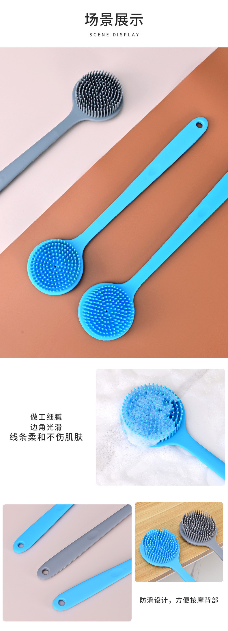 폭발은 긴 손잡이 부드러운 머리 목욕 브러시 양면 각질 제거 마사지 다시 문질러 게으른 목욕 유물을 증가시킵니다.
