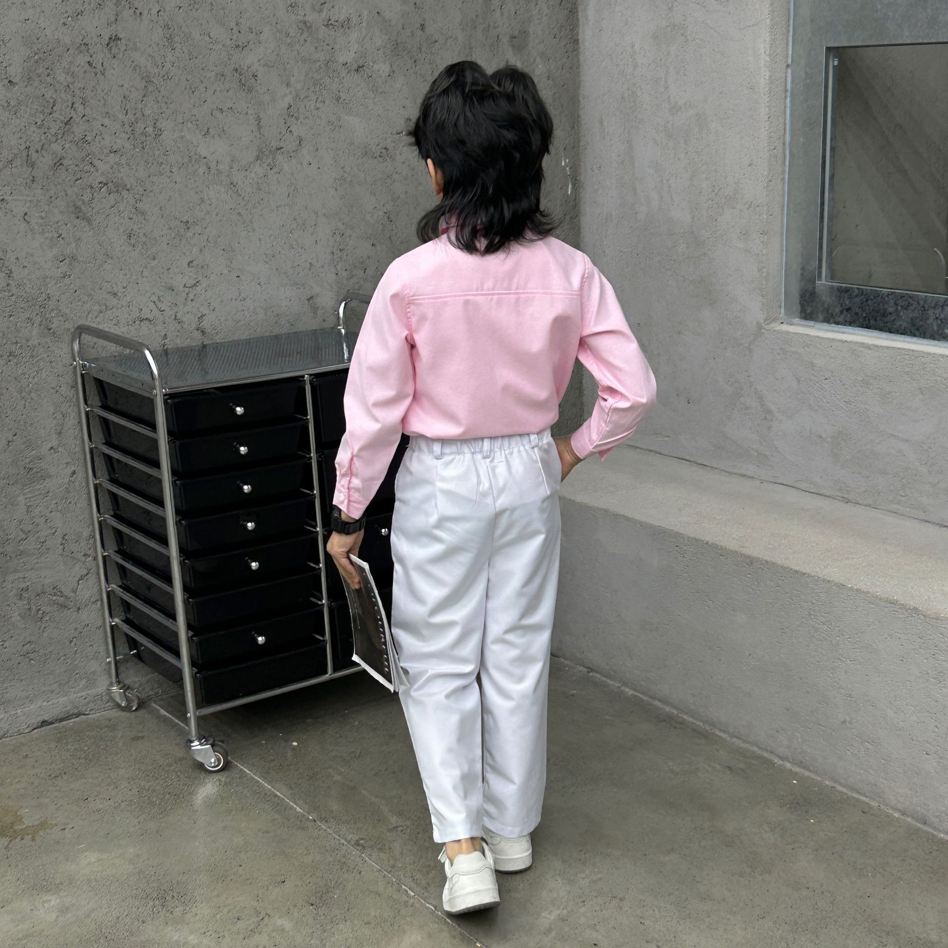 어린이 핑크 셔츠 2025 봄과 가을 새로운 소년과 소녀 단색 옷깃 셔츠 아기의 긴 소매 티셔츠 세트 바지스토어 가기