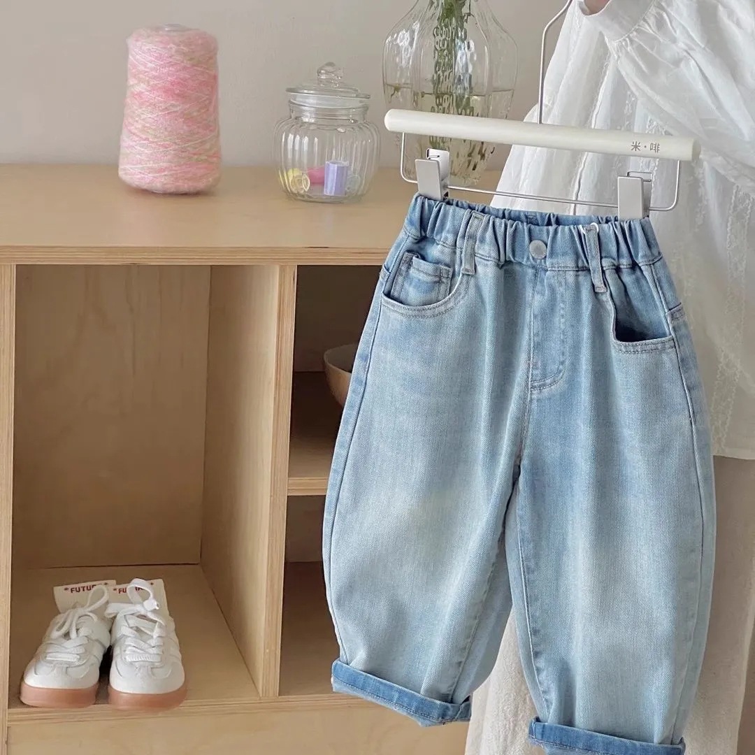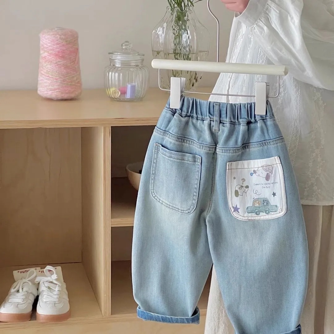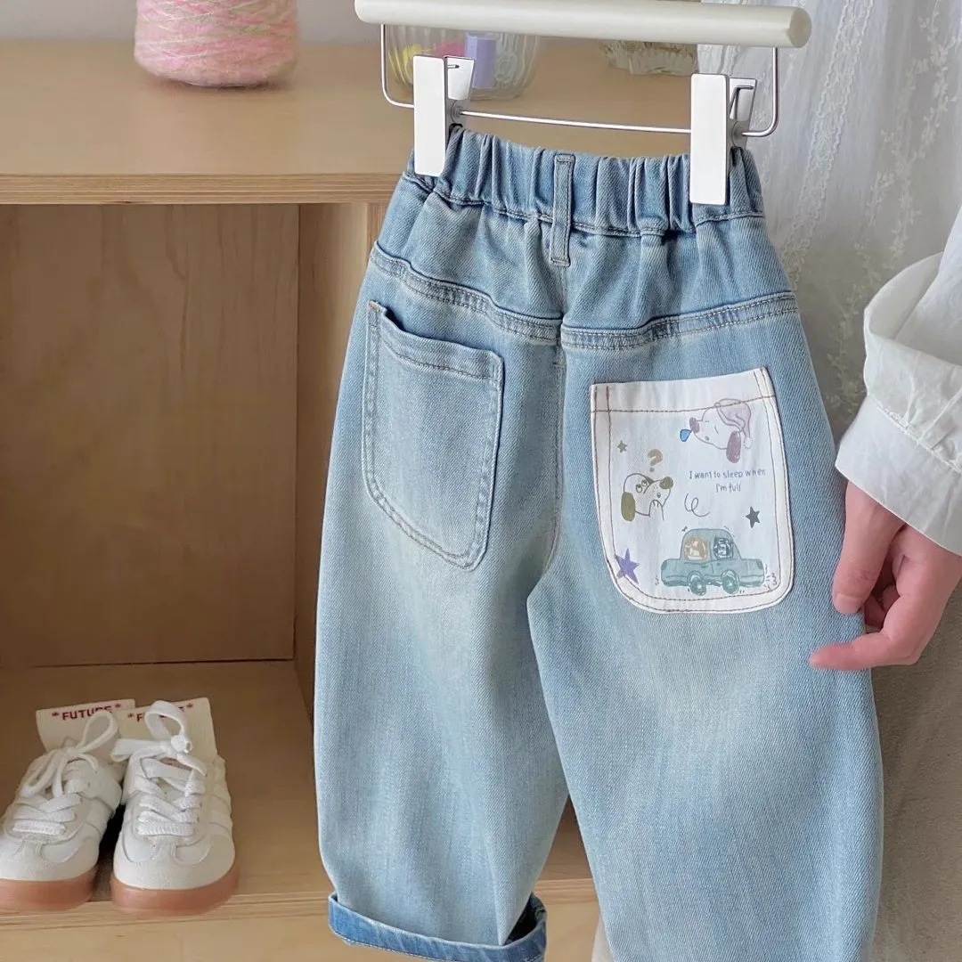 어린이 봄과 가을 2025 새로운 소년과 소녀 서양식 슈퍼 소프트 청바지 아기 만화 인쇄 캐주얼 바지스토어 가기