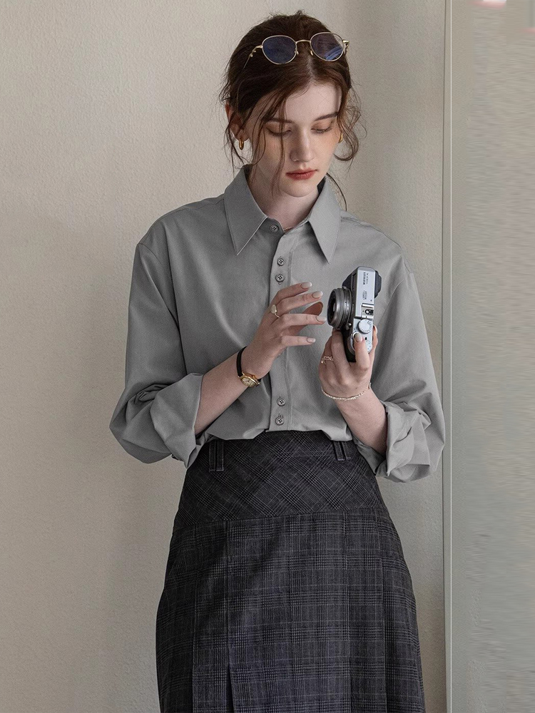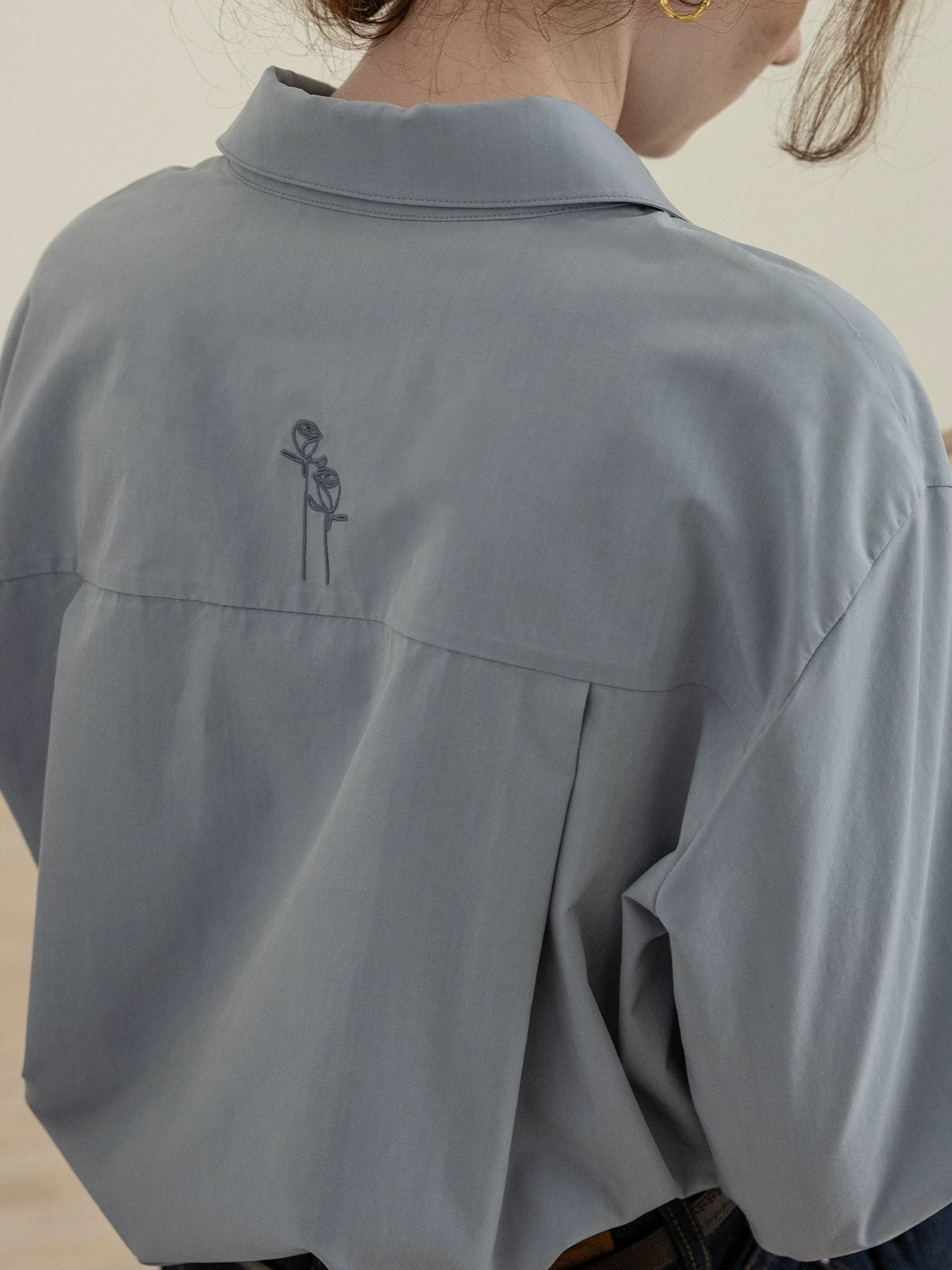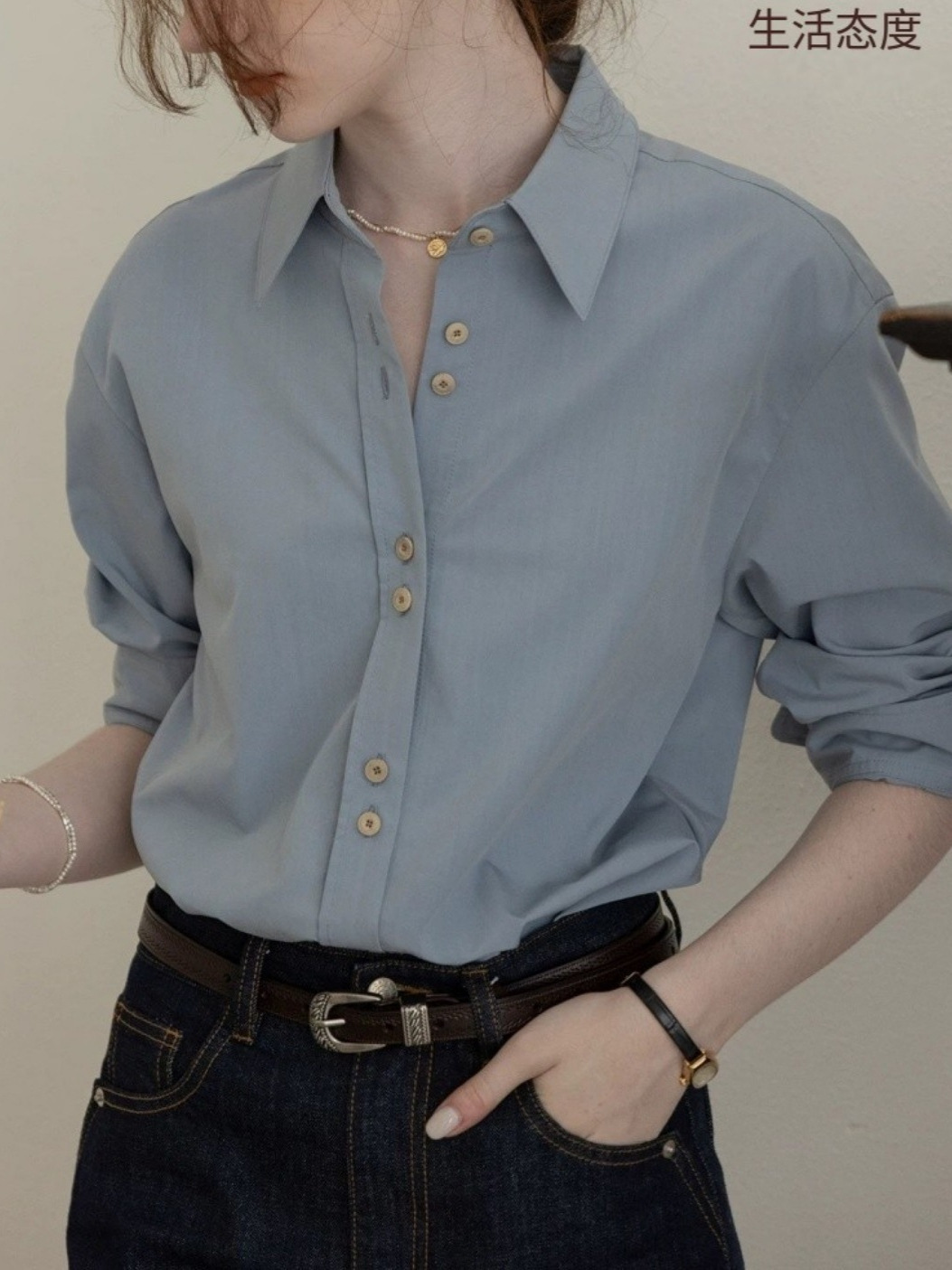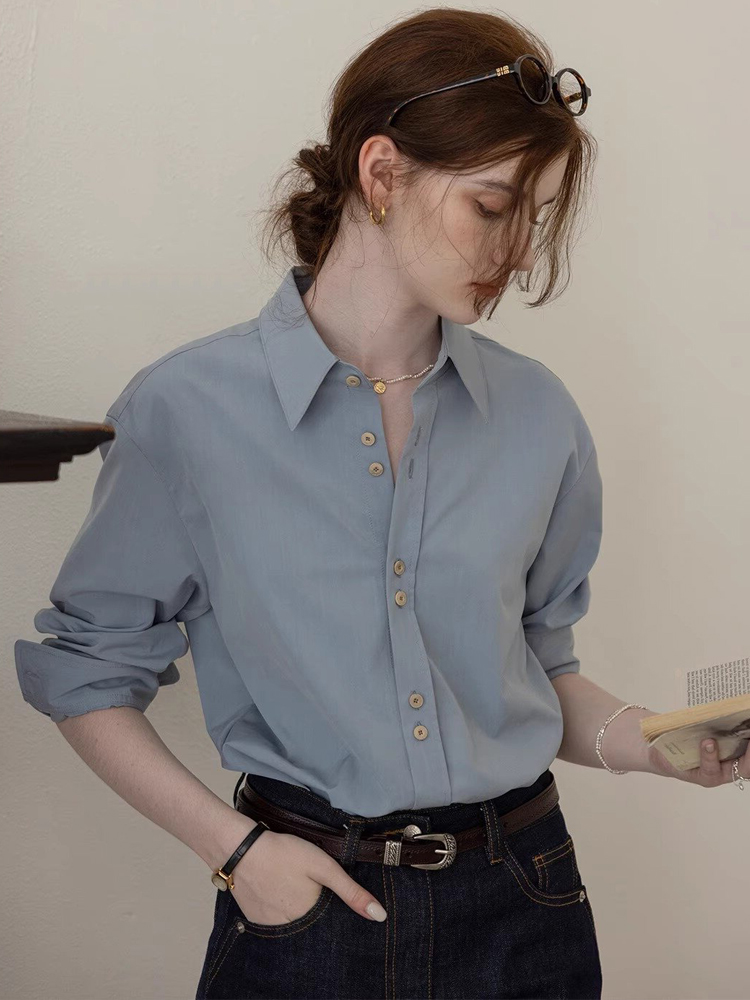 프랑스 스타일 간단한 통근 우아한 블루 셔츠 여성의 가을과 겨울 디자인 센스 백 자수 상단 내부 셔츠스토어 가기