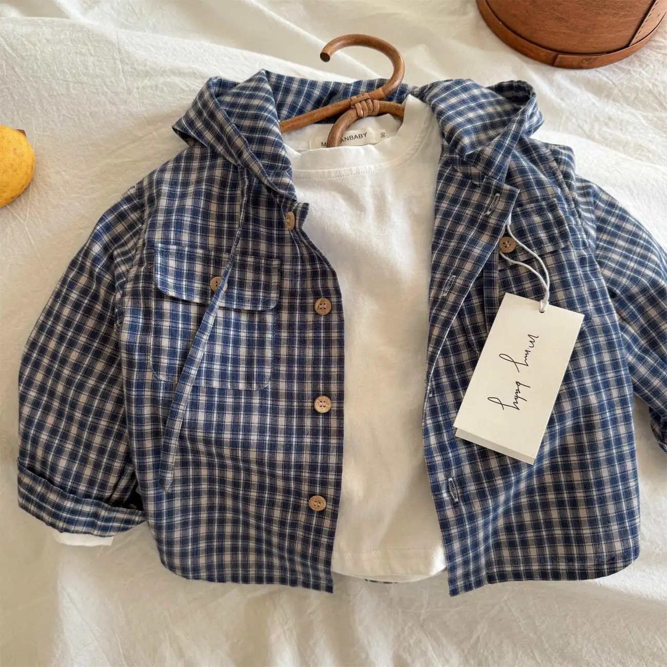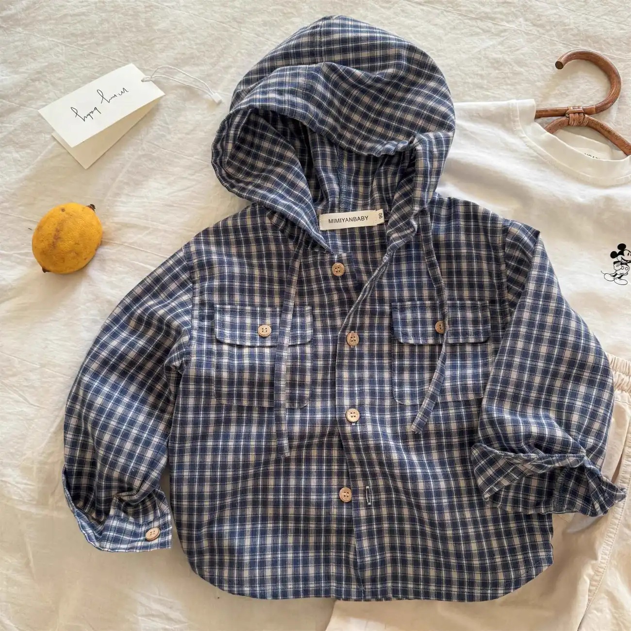 어린이 코트 2025 봄과 가을 일본식 후드 체크 셔츠 어린이 아기 유행 캐주얼 탑스토어 가기