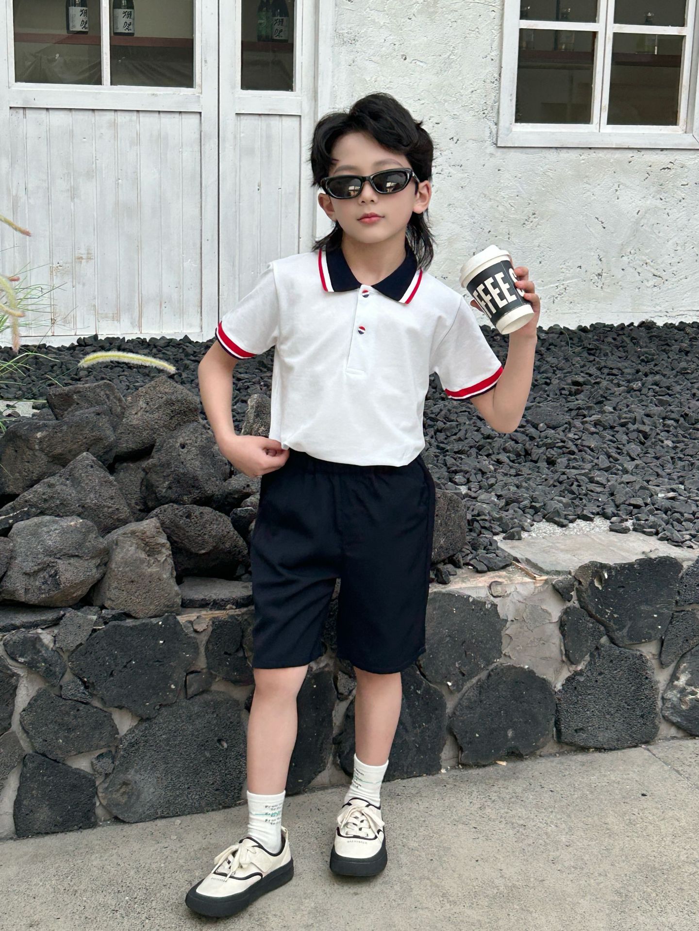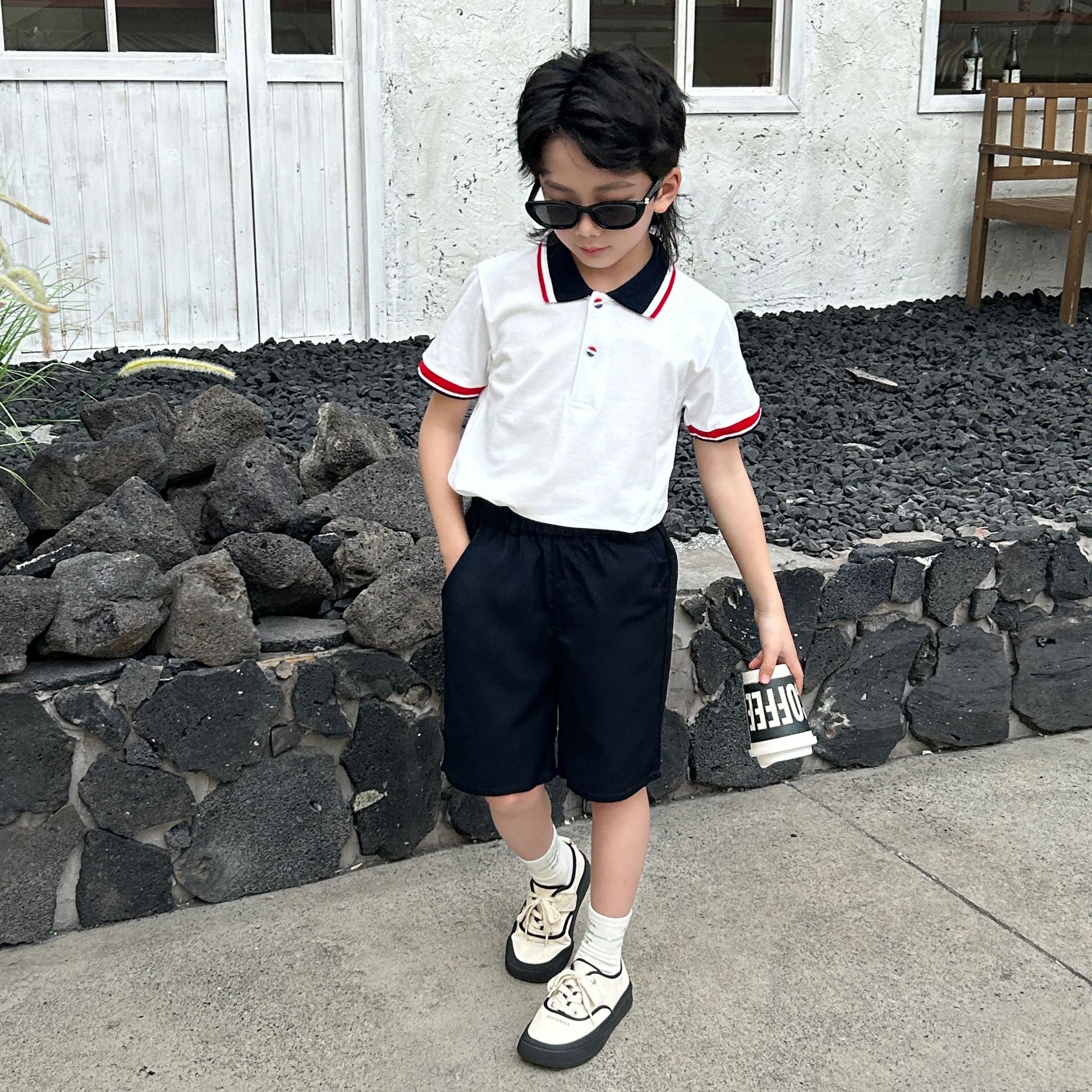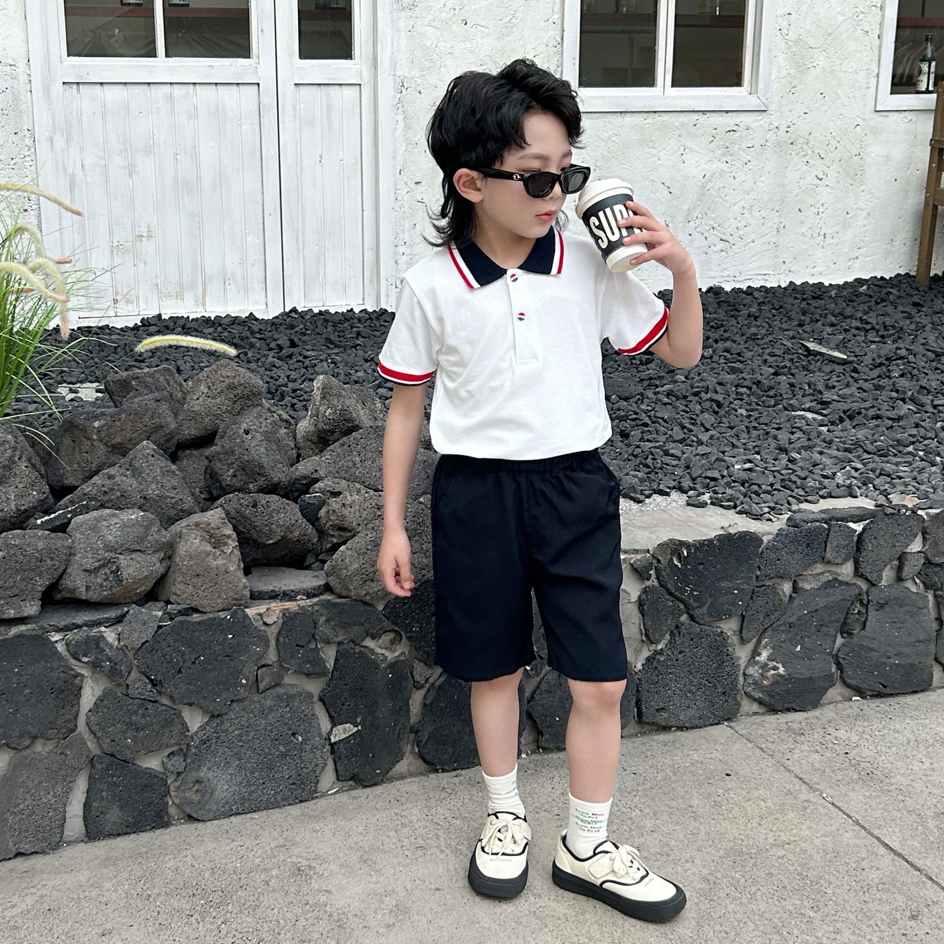 아동복 소년 폴로 셔츠 여름 새로운 패션 영국 잘 생긴 짧은 소매 폴로 셔츠 세트 반바지 세트스토어 가기