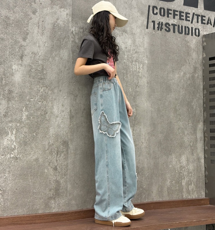 소녀 2025 봄 데님 넓은 다리 바지 어린이 청바지 얇은 직선 다리 바지 높은 허리 부드럽고 편안한