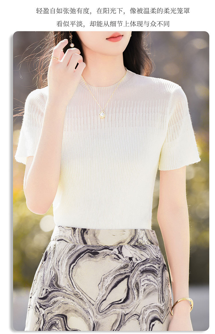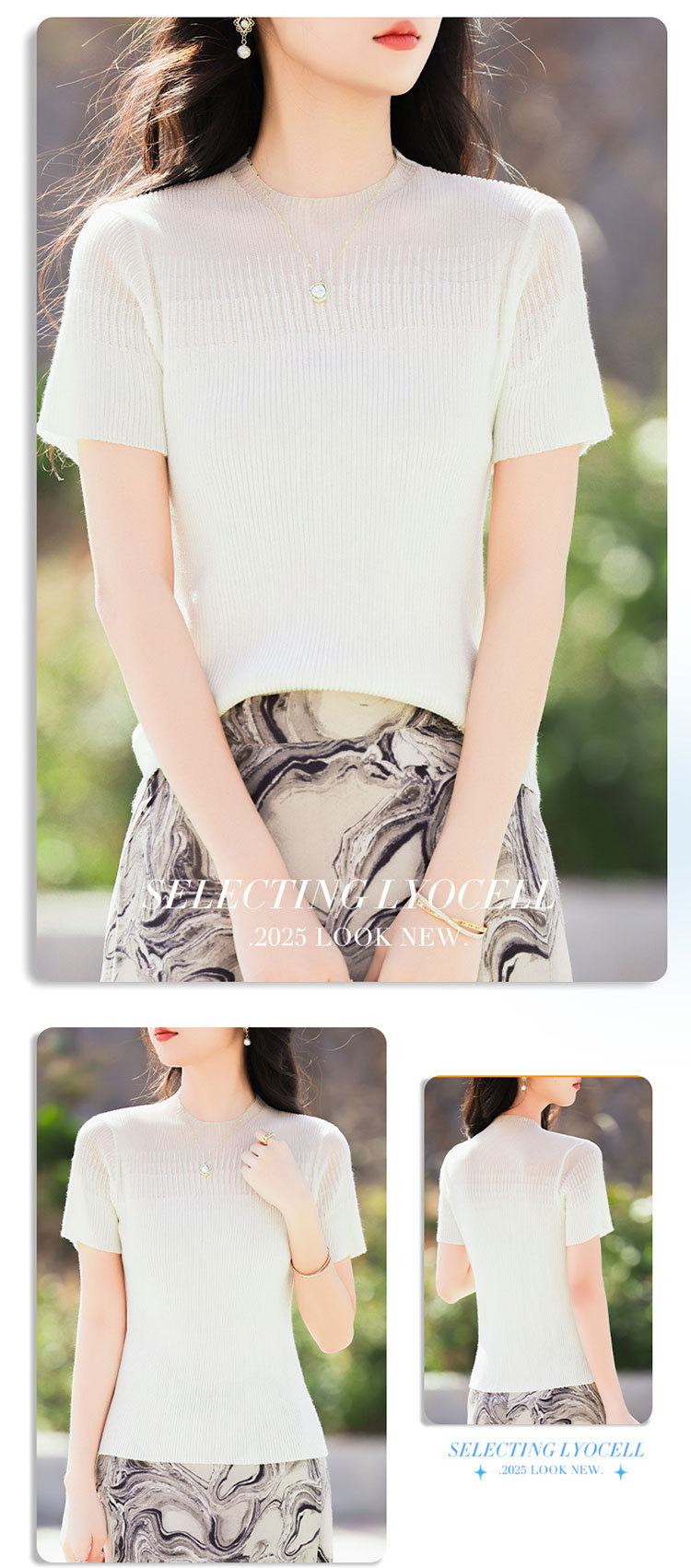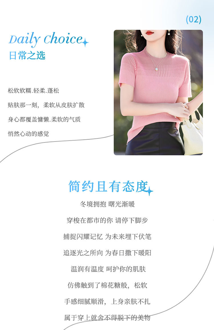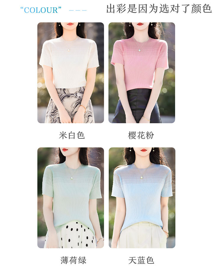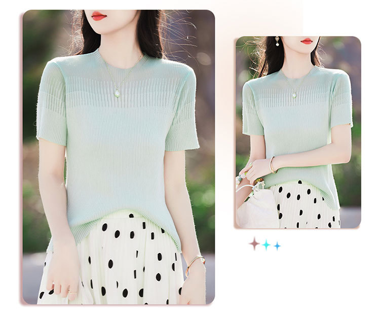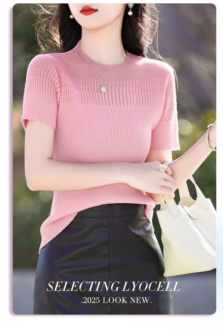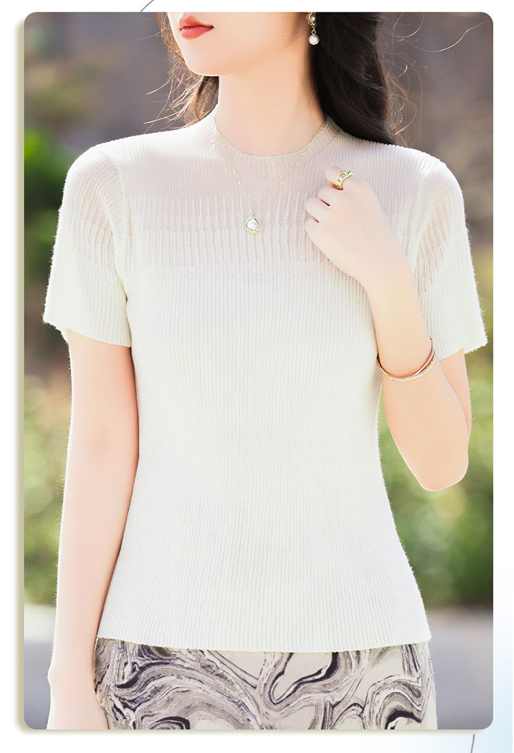 2025 년 여름 실크 울 오간자 밝은 실크 반팔 새 반팔 터틀넥 스티칭 니트 베이스 여성용 슬림 핏 티셔츠스토어 가기