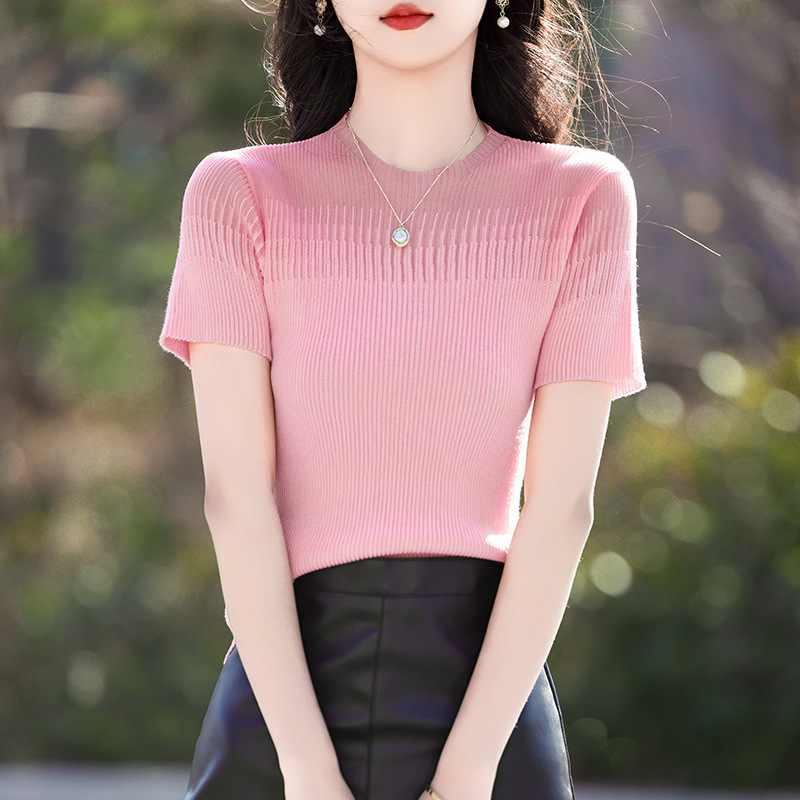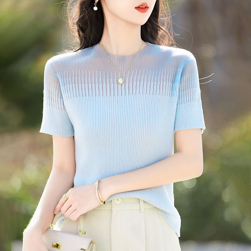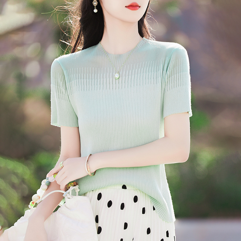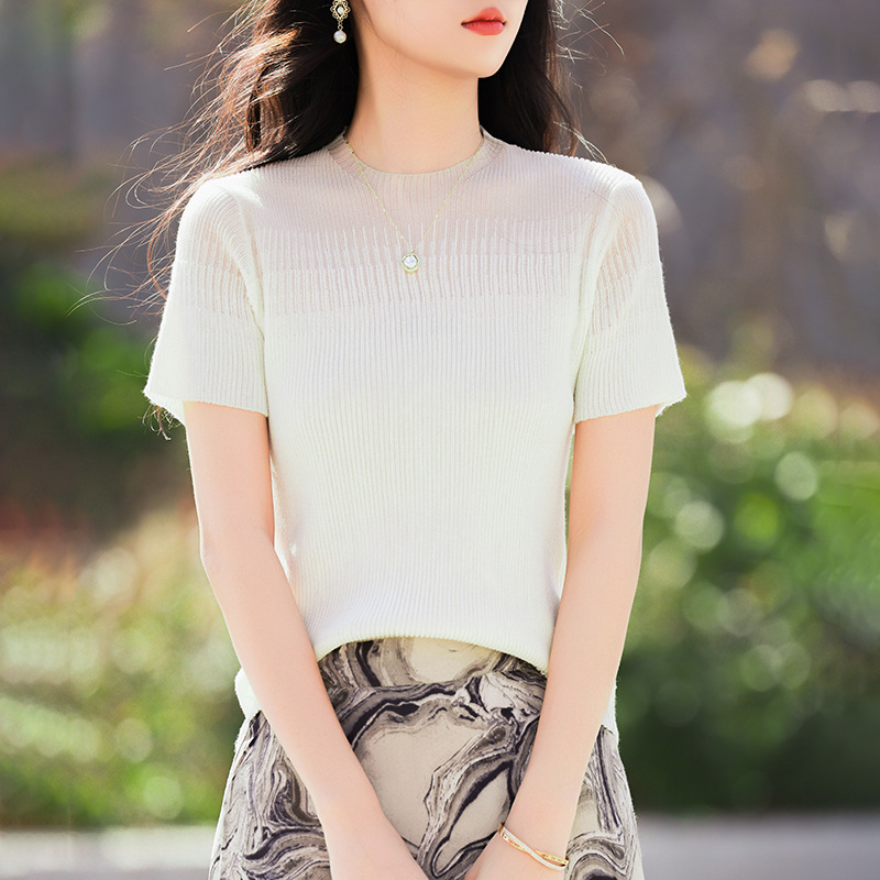 2025 년 여름 실크 울 오간자 밝은 실크 반팔 새 반팔 터틀넥 스티칭 니트 베이스 여성용 슬림 핏 티셔츠