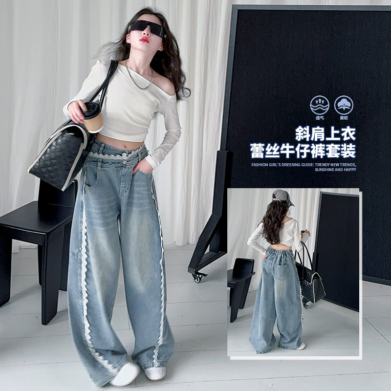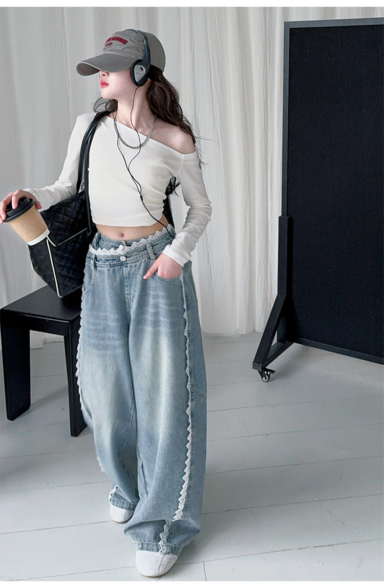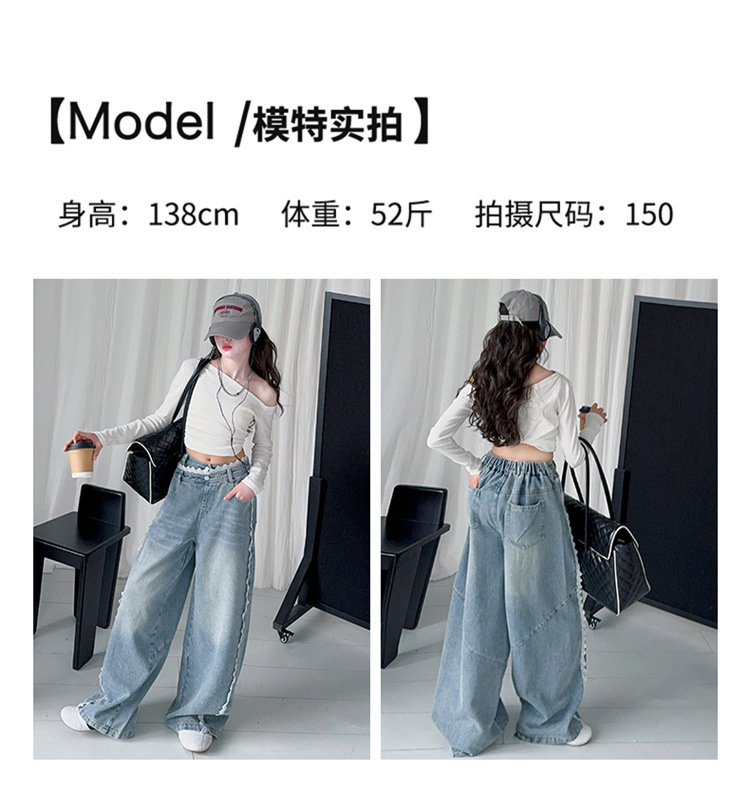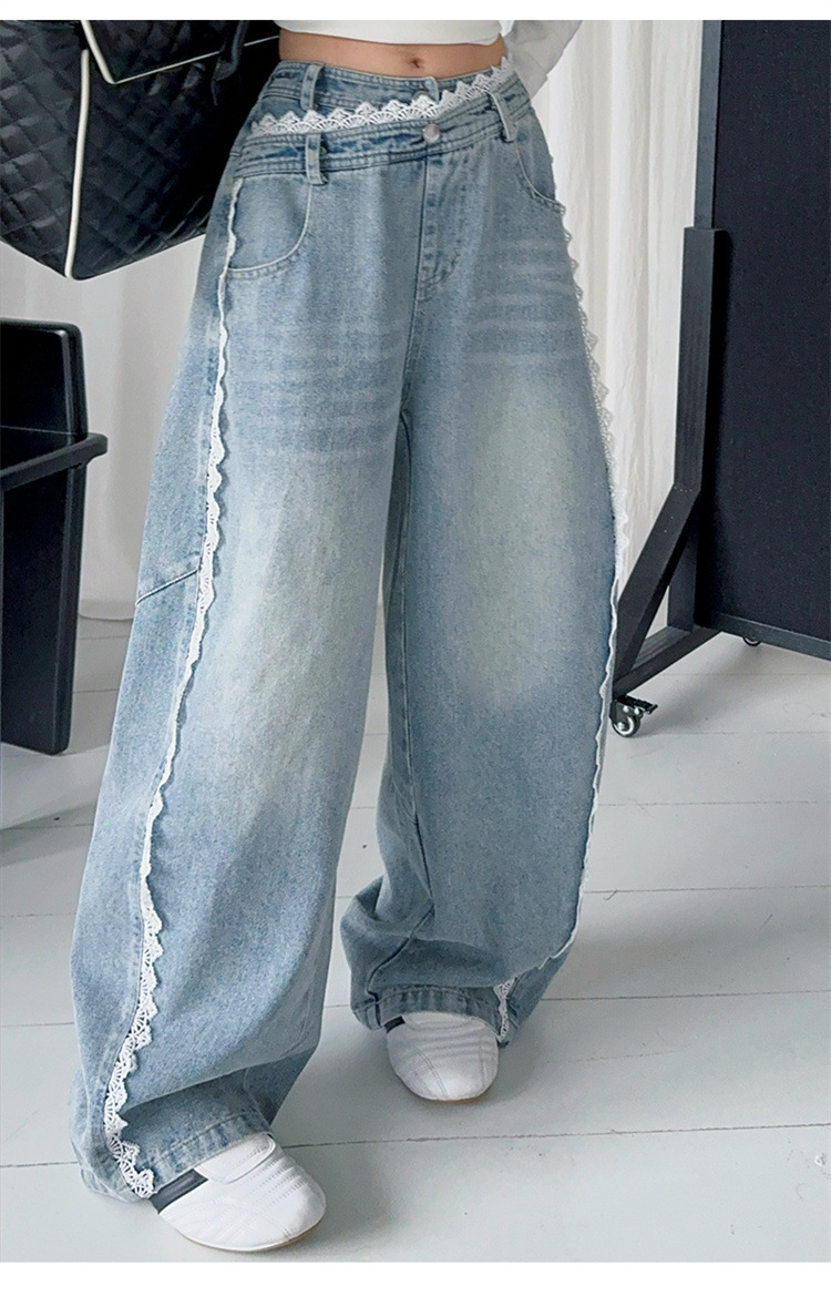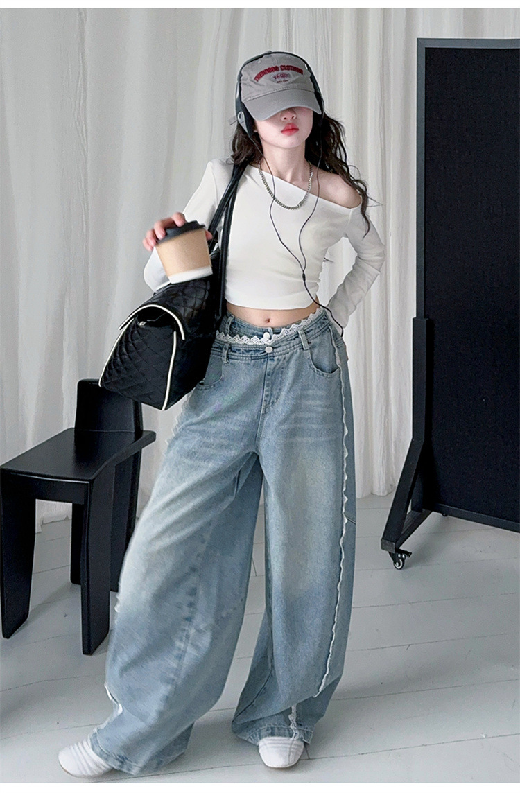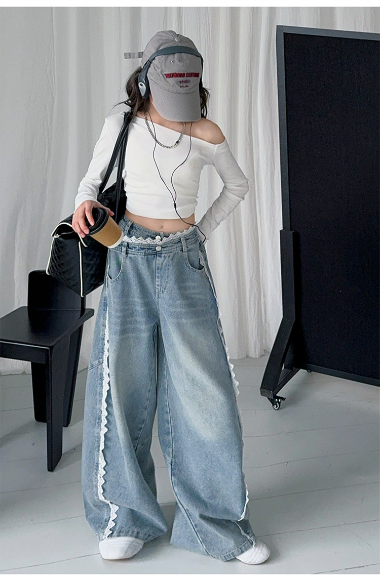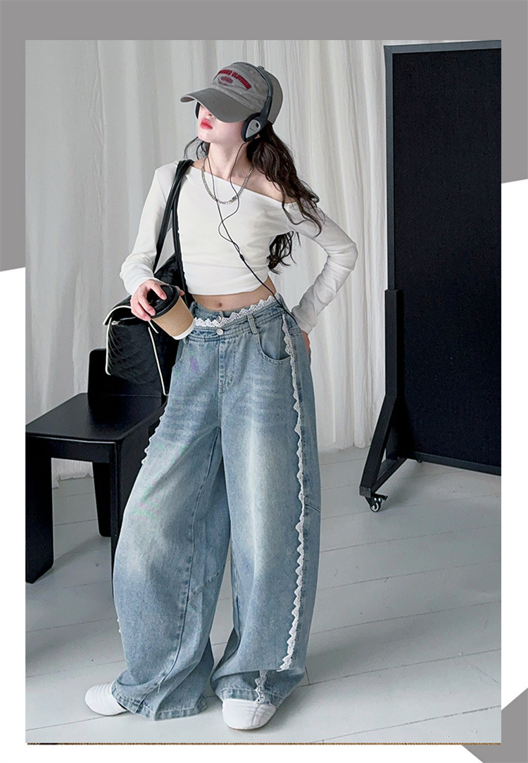 소녀 2025 봄과 가을 한국 스타일 디자인 센스 우아한 스트레이트 다리 청바지 새로운 느슨한 넓은 다리 트렌디 후행 바지스토어 가기