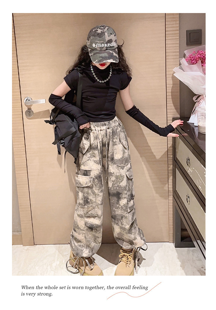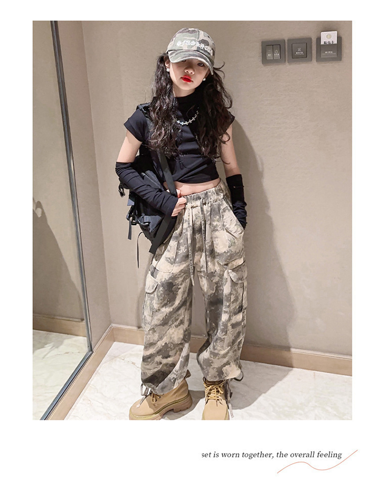 어린이 위장 바지 2023 봄과 가을 새로운 서양식 소녀 크레인 바지 인터넷 기념 거리 댄스 중 큰 어린이 캐주얼 와이드 레그 바지