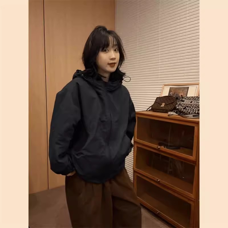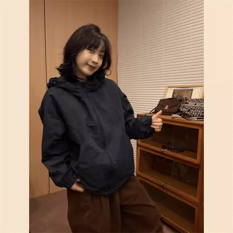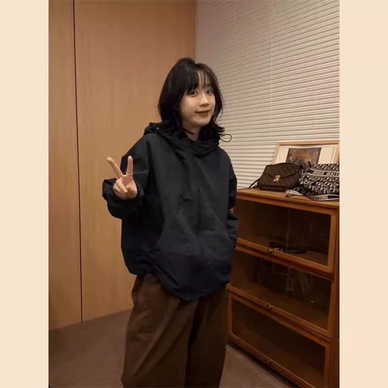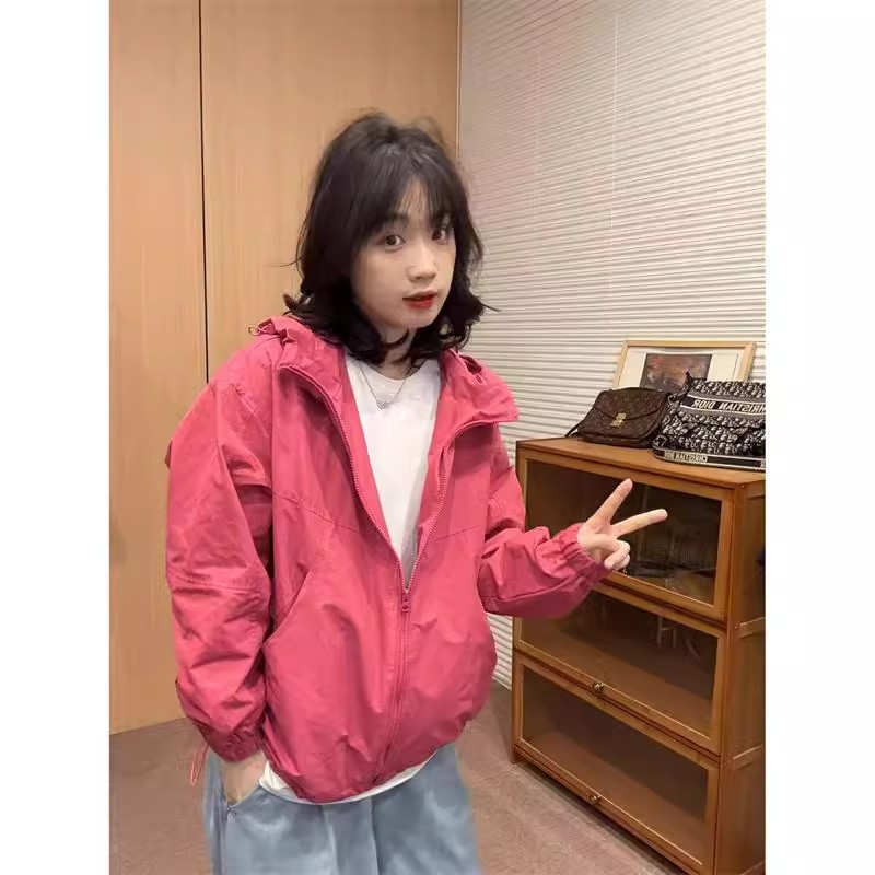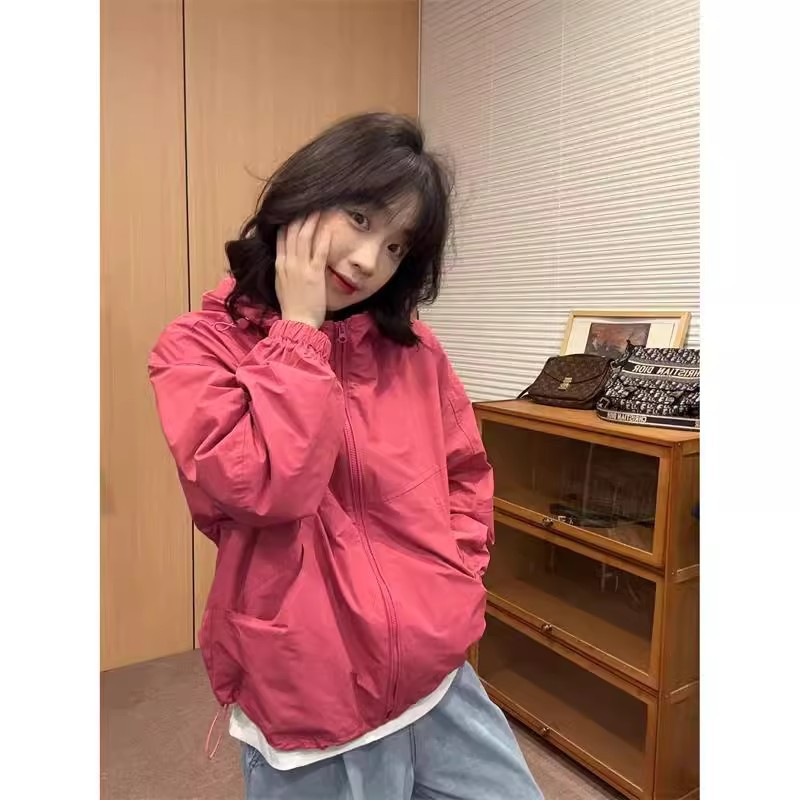 2025 새로운 로즈 레드 후드 지퍼 재킷 디자인 느슨한 태양 보호 작업 재킷 여성용스토어 가기