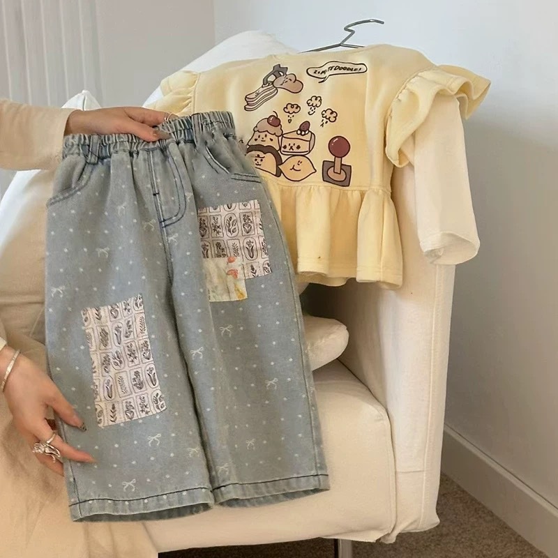 한국 아동복 소녀 봄 바지 2025 새로운 세련된 어린이 유행 패드 청바지 아기의 넓은 다리 바지스토어 가기