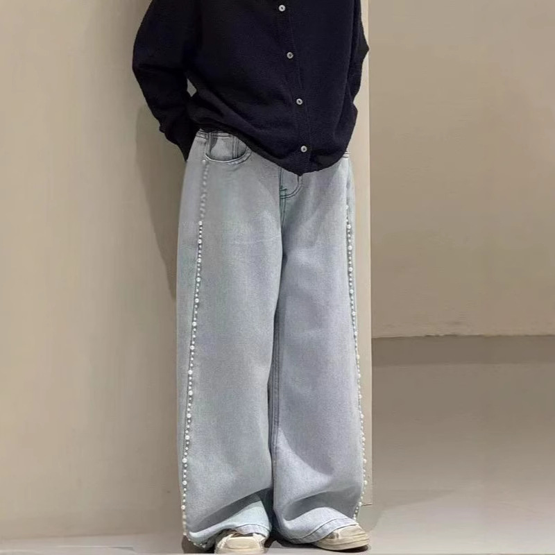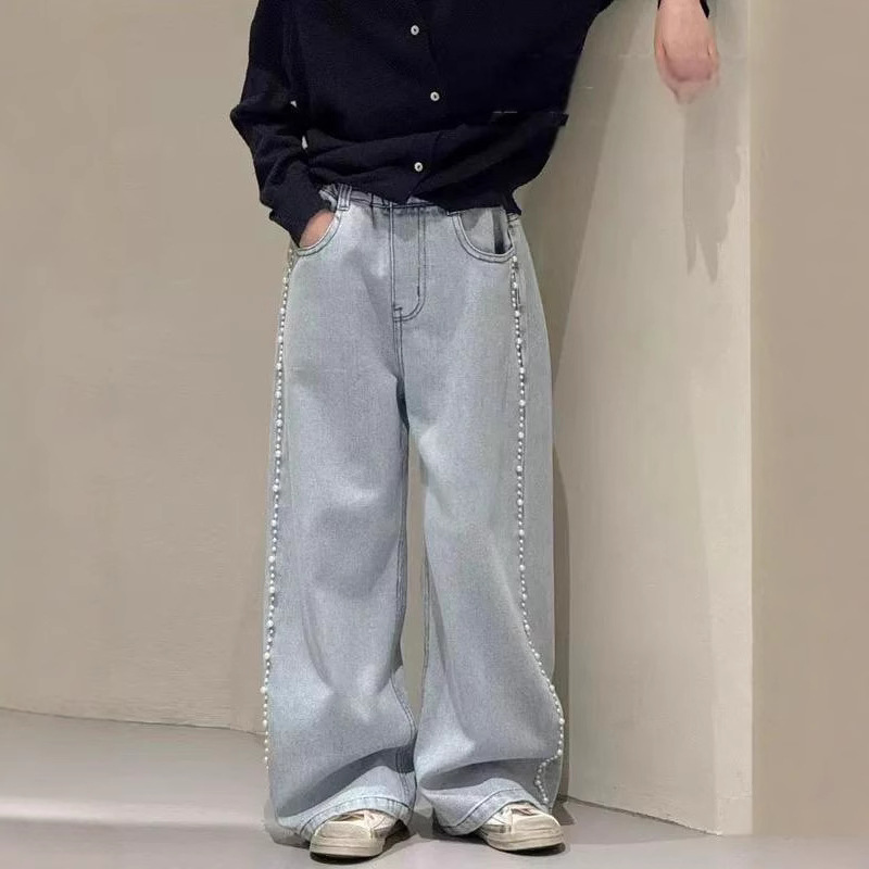 소녀 청바지 봄과 가을 스트레이트 다리 바지 2025 봄 신식 소녀 네일 펄 바지 어린이 좁은 넓은 다리 바지