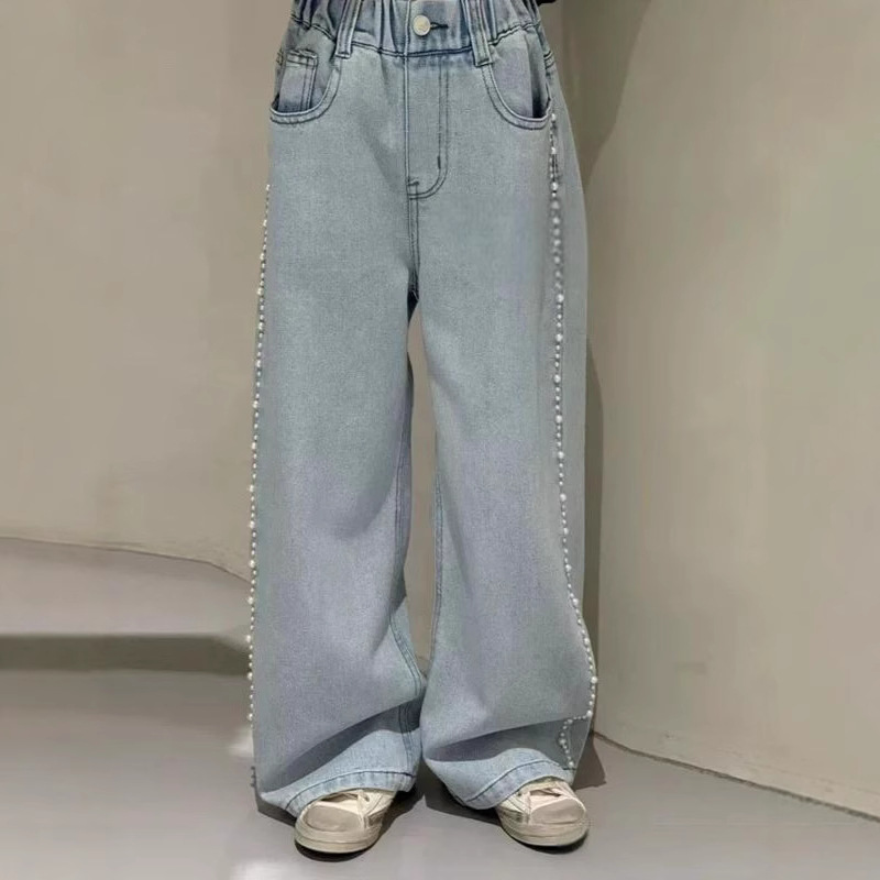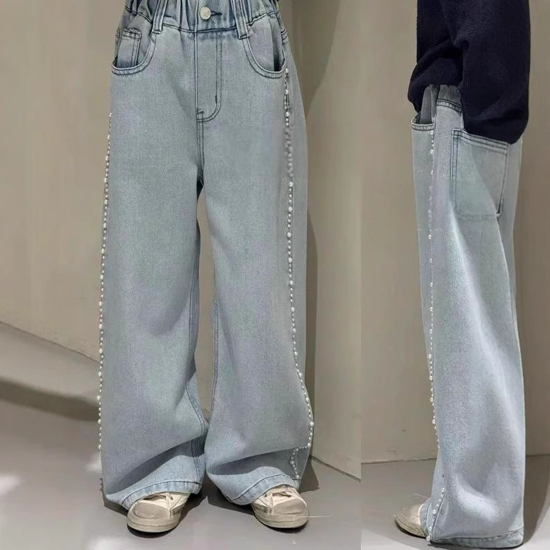 소녀 청바지 봄과 가을 스트레이트 다리 바지 2025 봄 신식 소녀 네일 펄 바지 어린이 좁은 넓은 다리 바지스토어 가기
