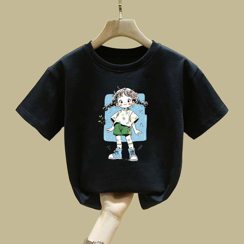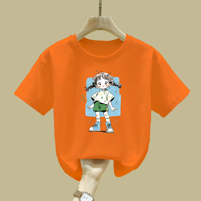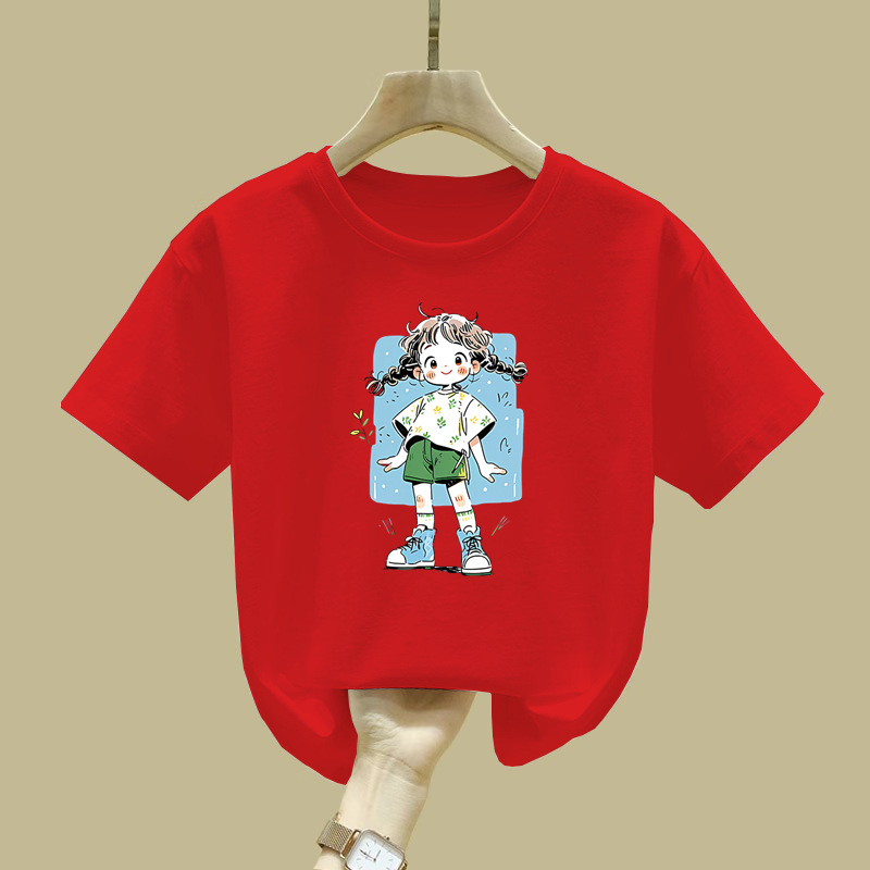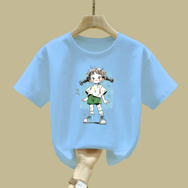 2456 # 핑크 반소매 여자 티셔츠 퓨어 코튼 뉴 스타일 중대형 어린이 라운드 넥 반소매 여름 어린이 탑 티셔츠