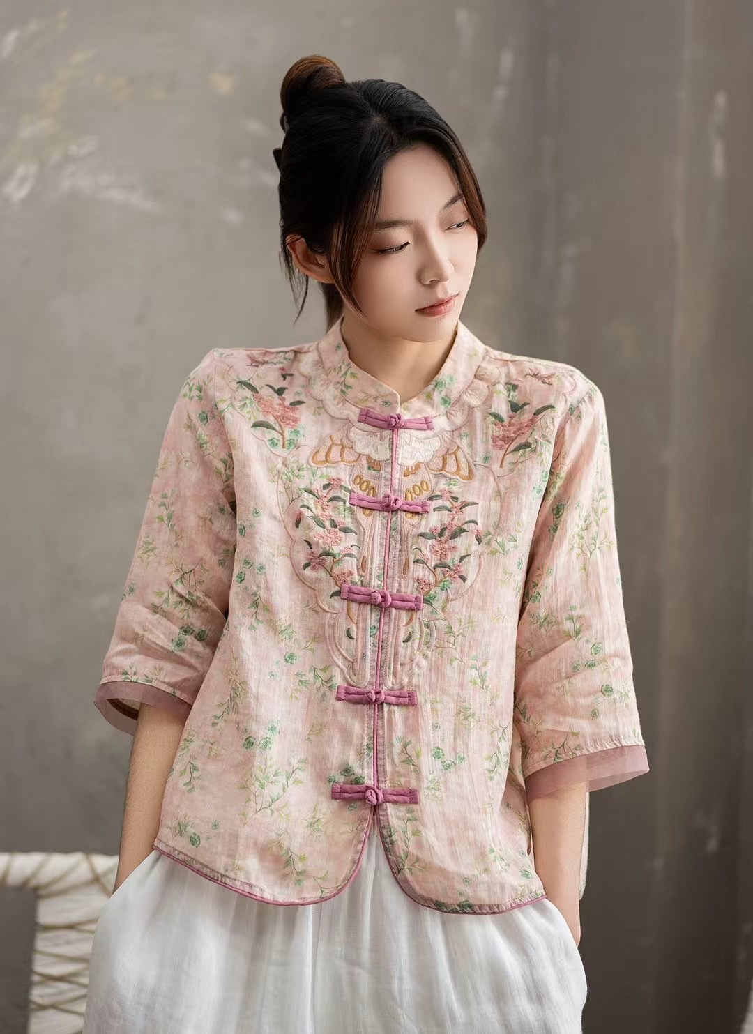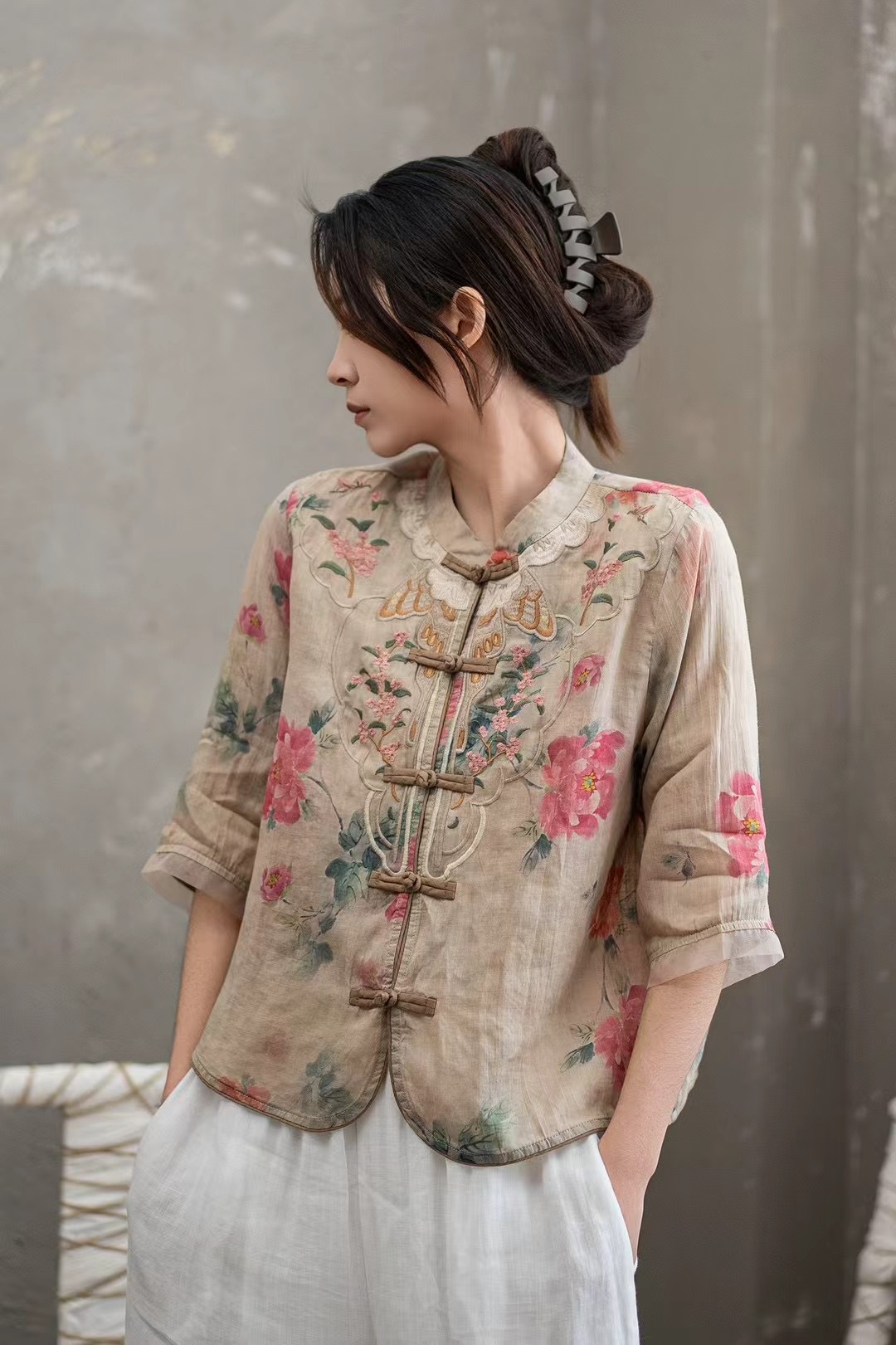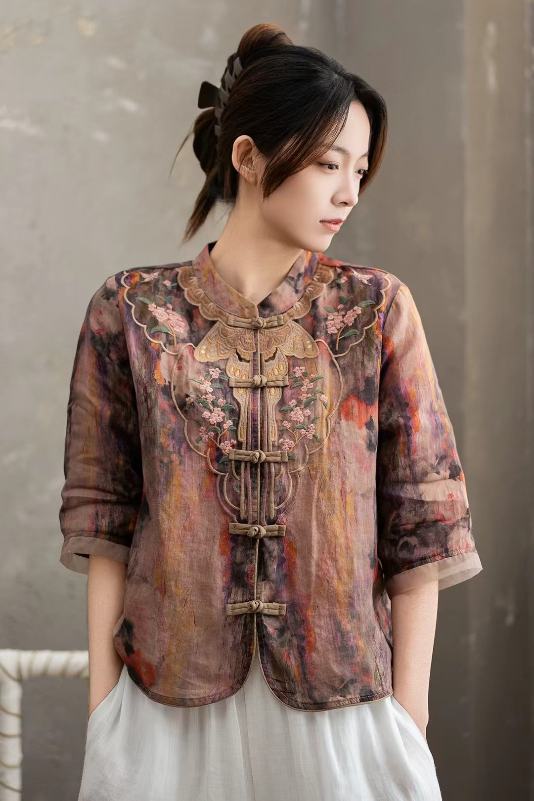 자수 라미 인쇄 셔츠 2025 여름 새로운 예술적 새로운 중국 스타일 버튼 국가 스타일 대비 색상 7 소매 셔츠