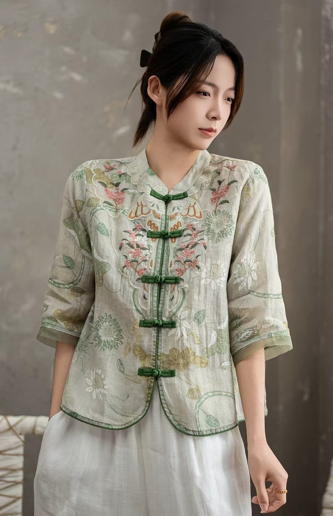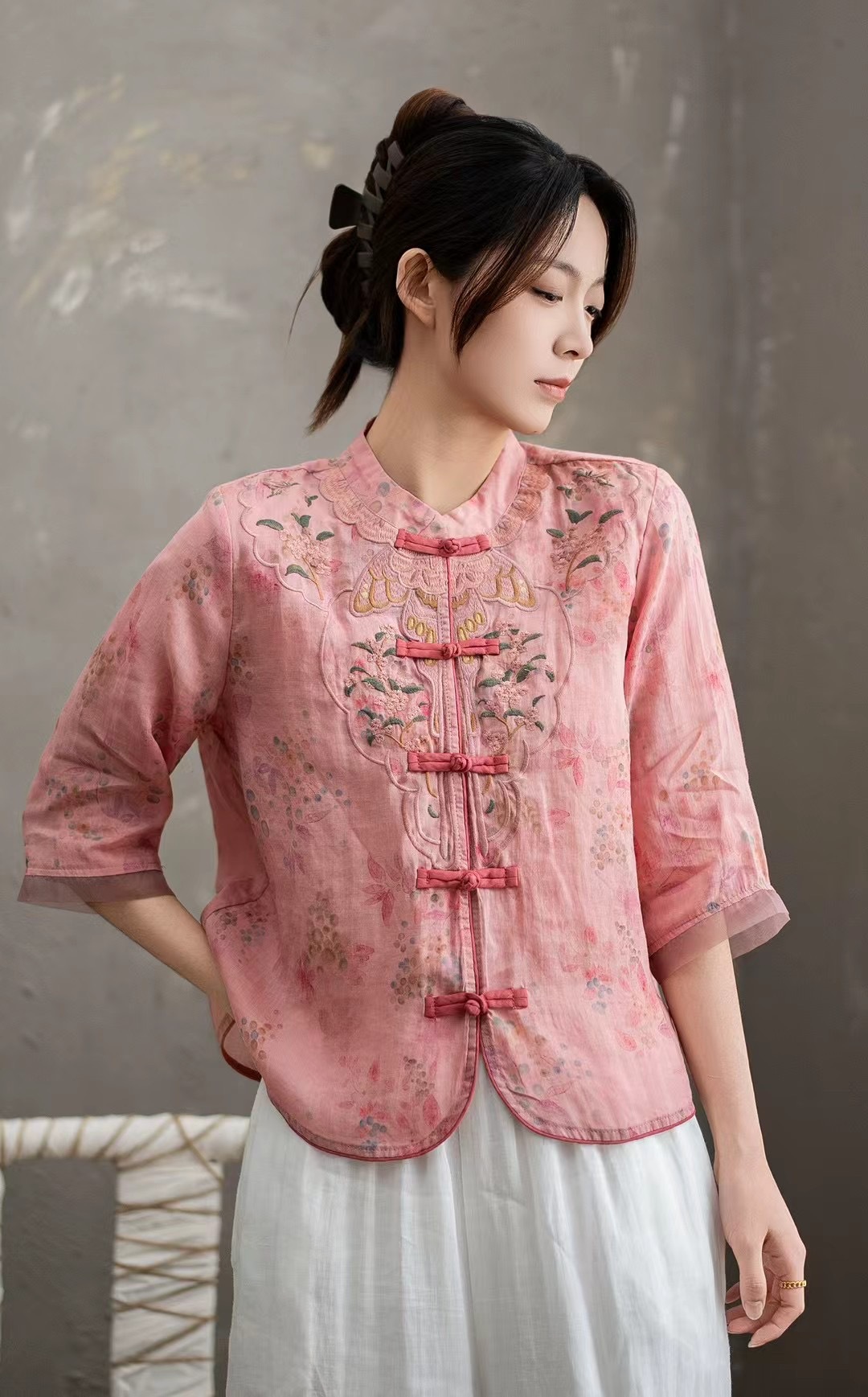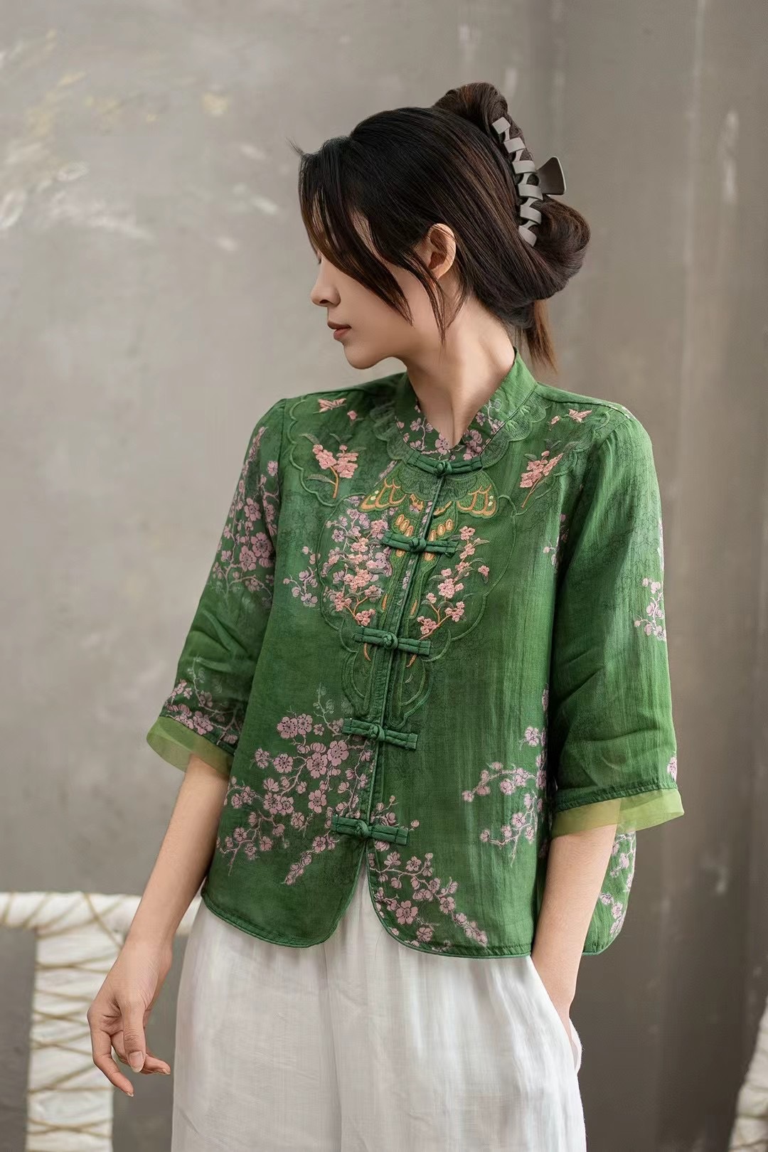 자수 라미 인쇄 셔츠 2025 여름 새로운 예술적 새로운 중국 스타일 버튼 국가 스타일 대비 색상 7 소매 셔츠
