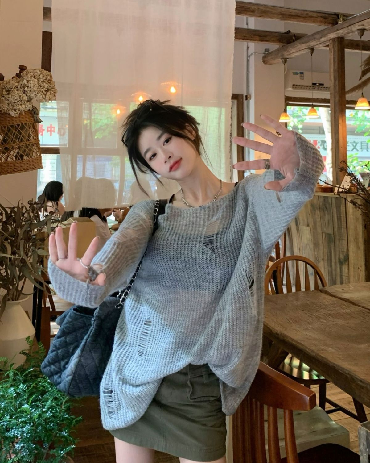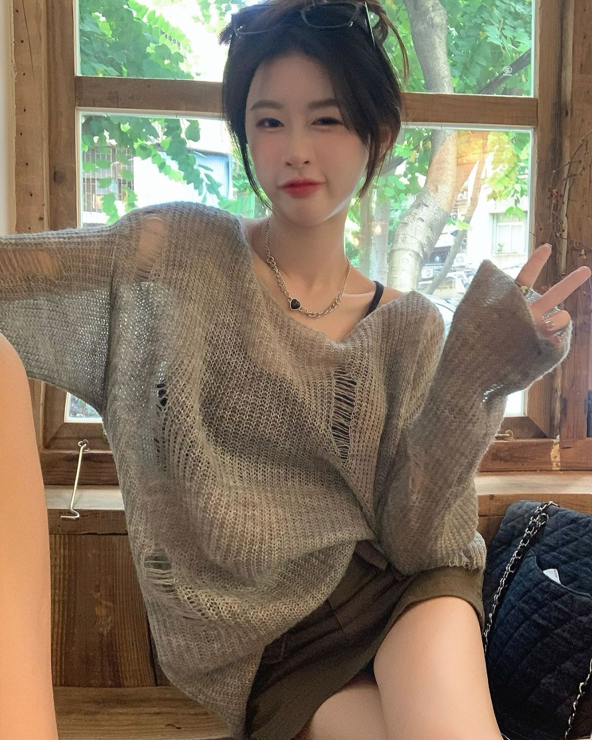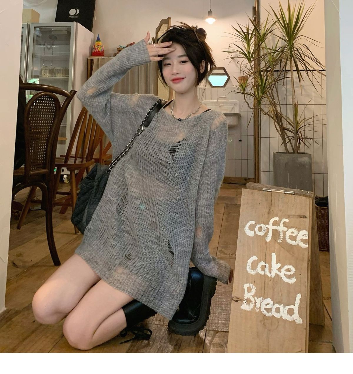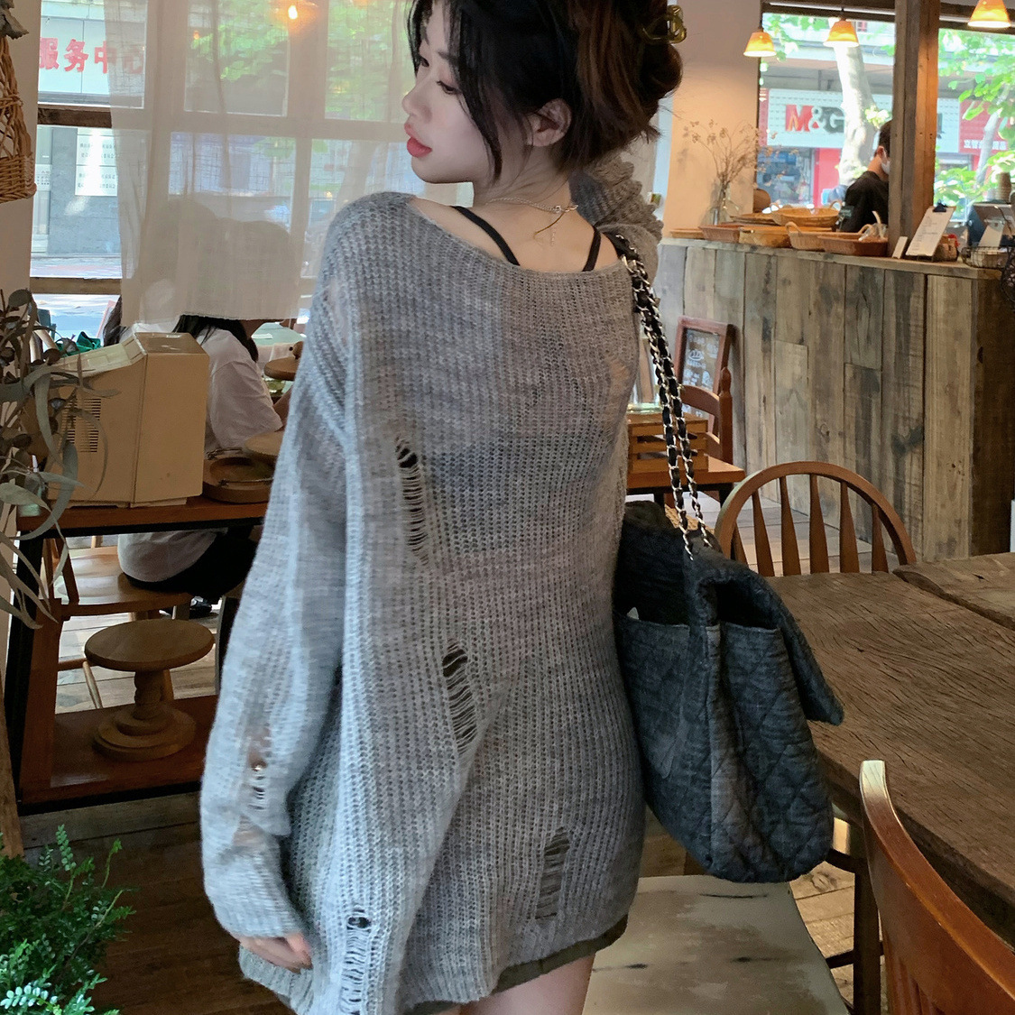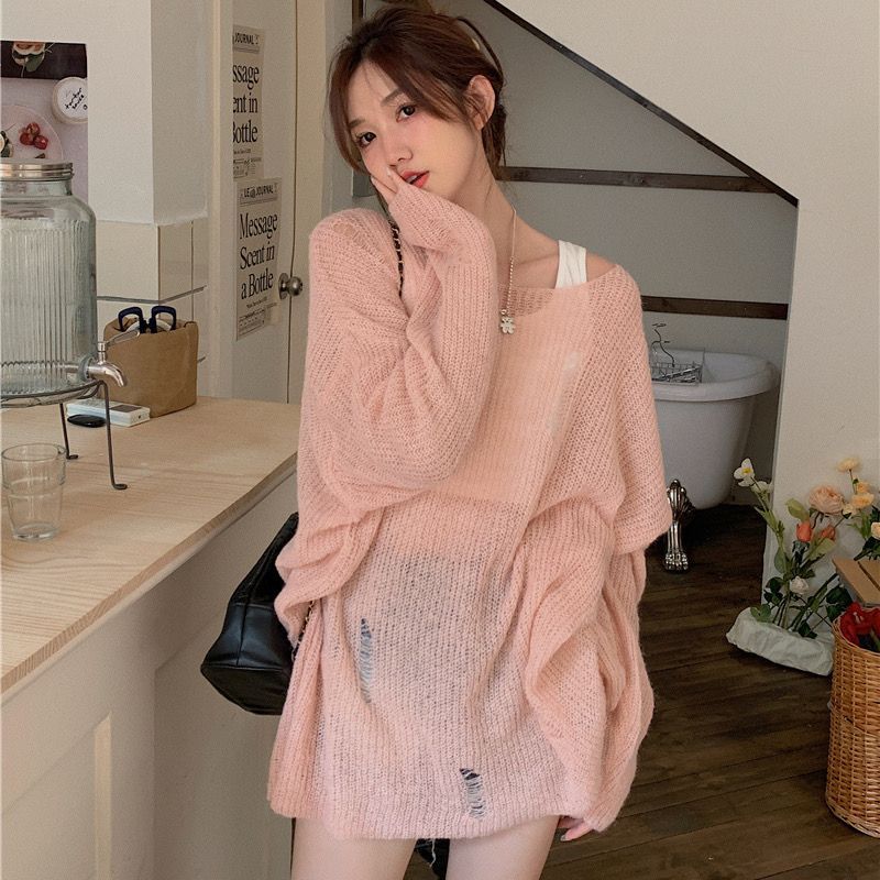 봄과 여름 새로운 한국 스타일 할로우 니트 선스크린 셔츠 여성의 얇은 외부 에어컨 셔츠 프랑스베이스 섹시 탑스토어 가기