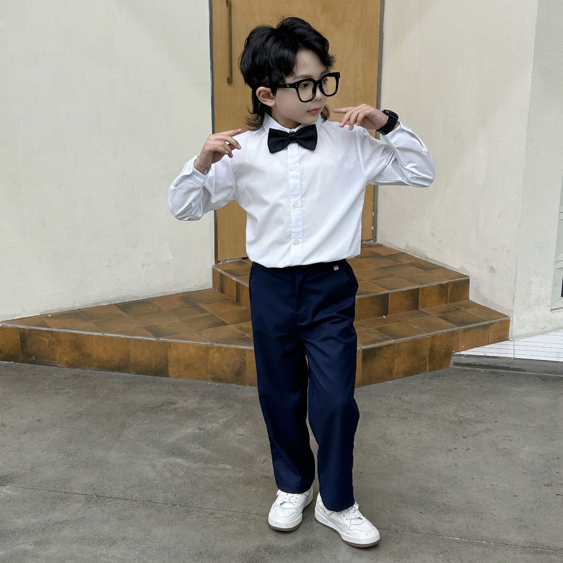 어린이 긴팔 셔츠 2025 새 가을 소년 단색 옷깃 최고 어린이 공연 셔츠 바지 세트