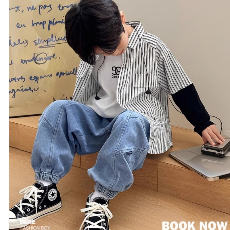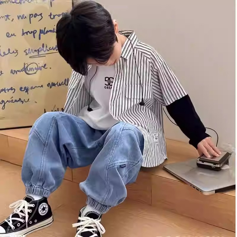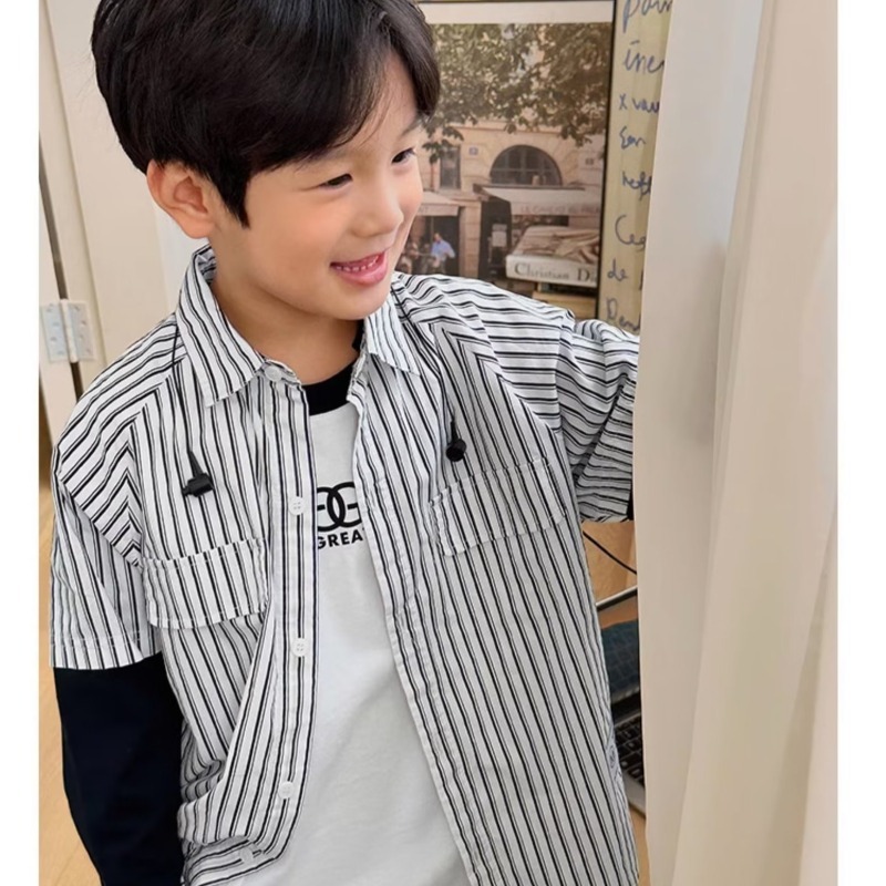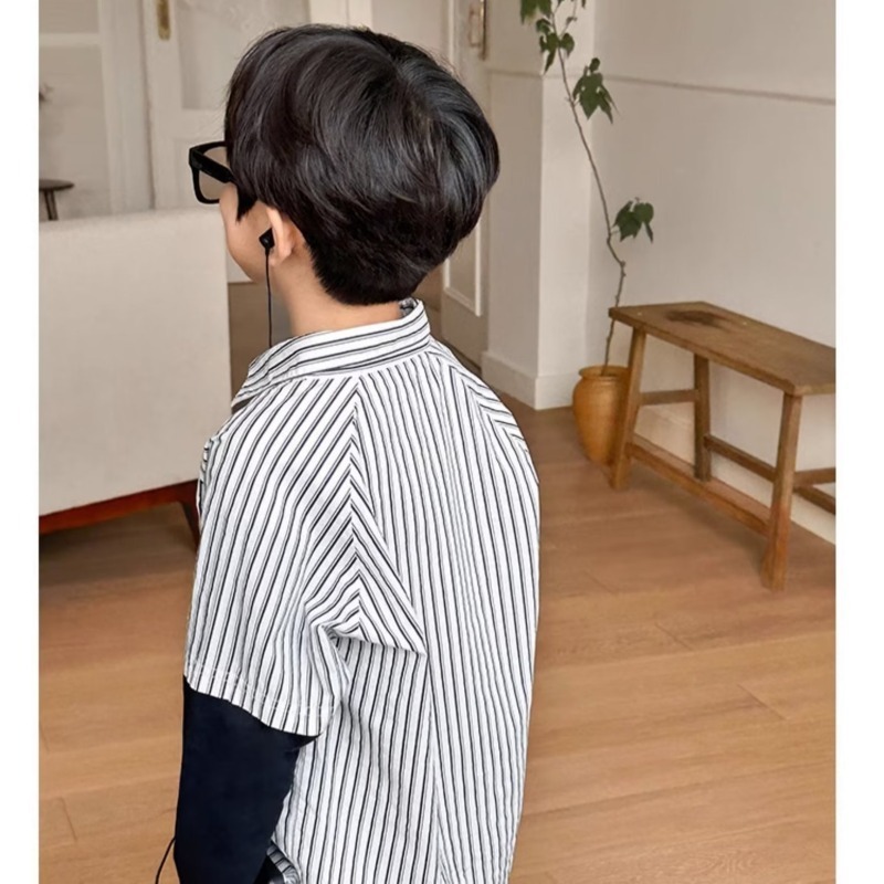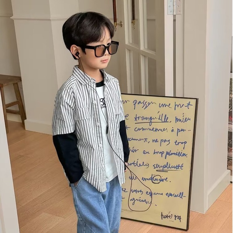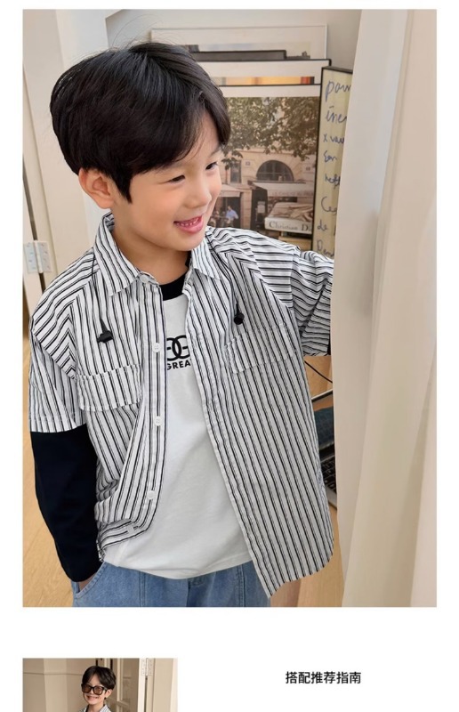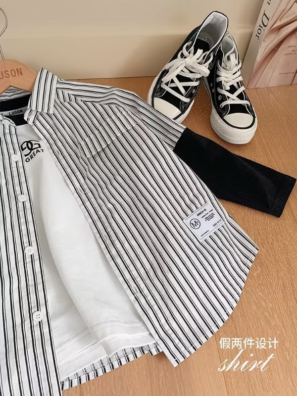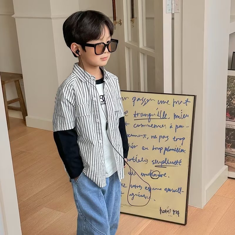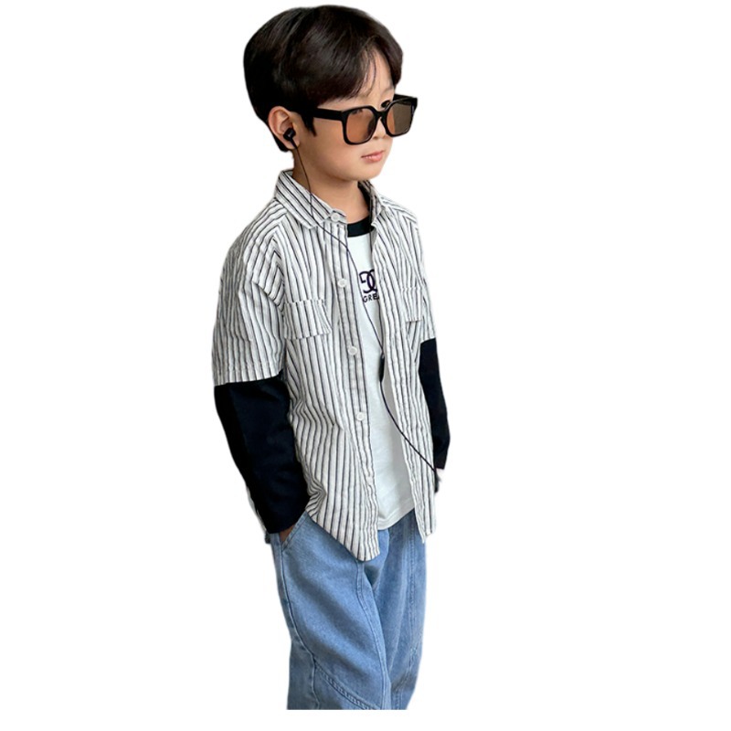 남자들의 가짜 투피스 스트라이프 셔츠 긴팔 2025 가을 신식 어린이 루즈드 세련된 유행 셔츠스토어 가기