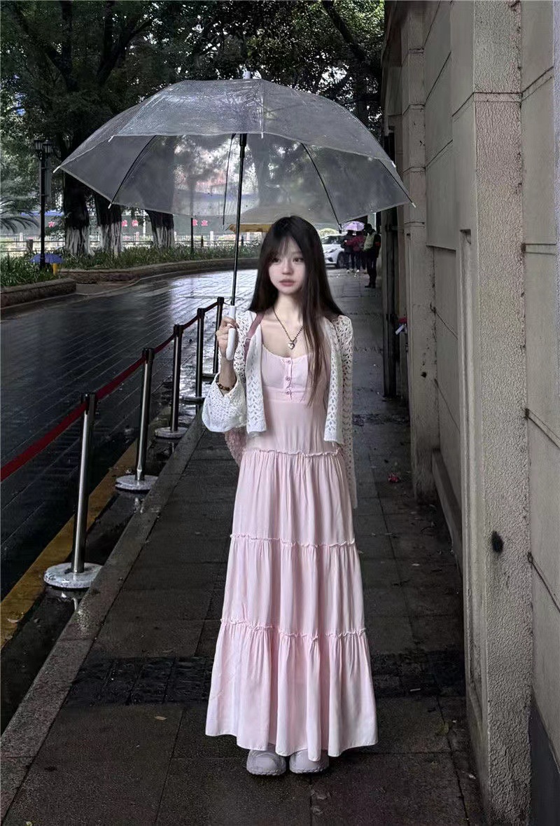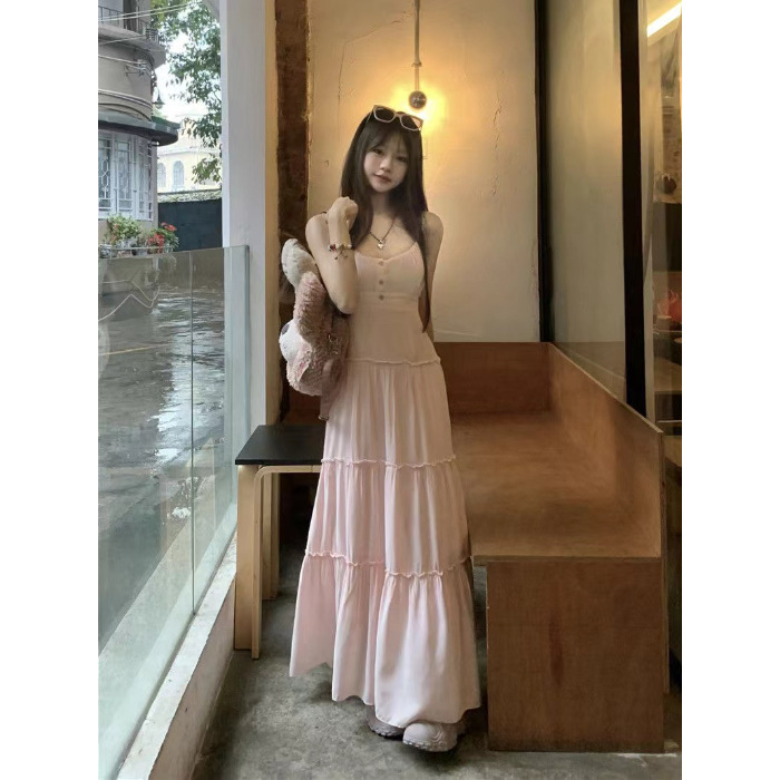 슈퍼 페어리 슈퍼 잘 생긴 작은 핑크 원피스 2025 여름 로맨틱 홀리데이 분위기 미니멀리스트 우아한 허리 슬링 원피스스토어 가기
