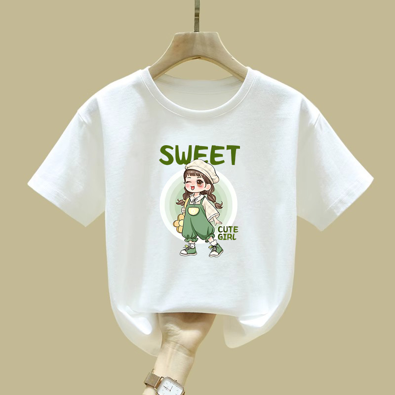2528 # 반팔 여자 티셔츠 면 여름 새로운 어린이 승무원 목 반팔 티셔츠 중형 및 대형 어린이 서양식 옷