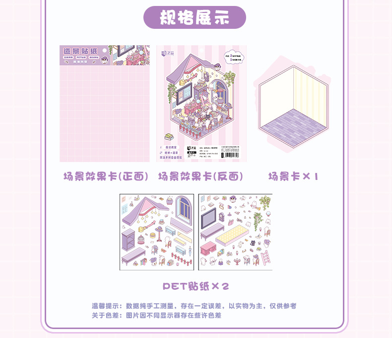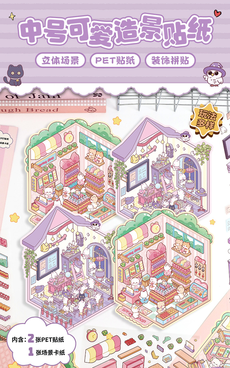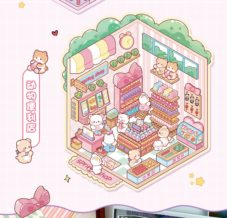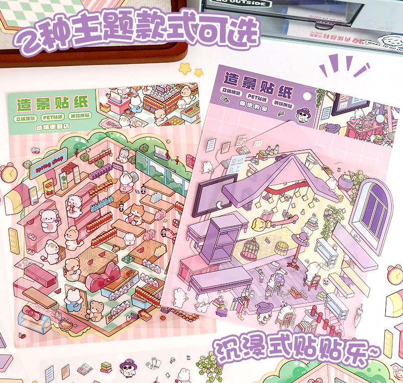 귀여운 토끼 풍경 스티커 만화 3D 입체 오두막 핸드북 스티커 귀여운 관리 게임 마이크로 수축 장면스토어 가기