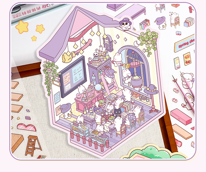 귀여운 토끼 풍경 스티커 만화 3D 입체 오두막 핸드북 스티커 귀여운 관리 게임 마이크로 수축 장면