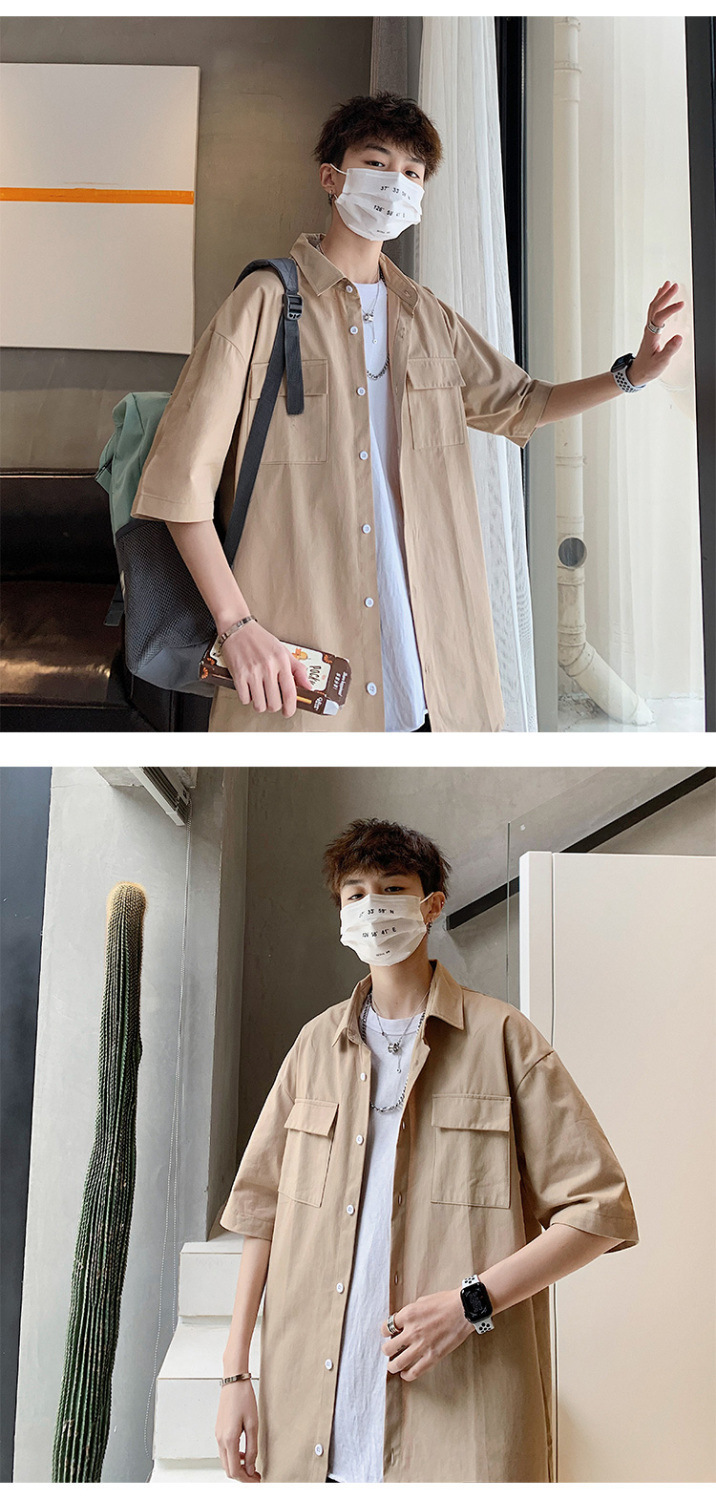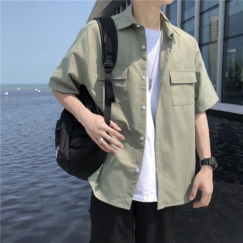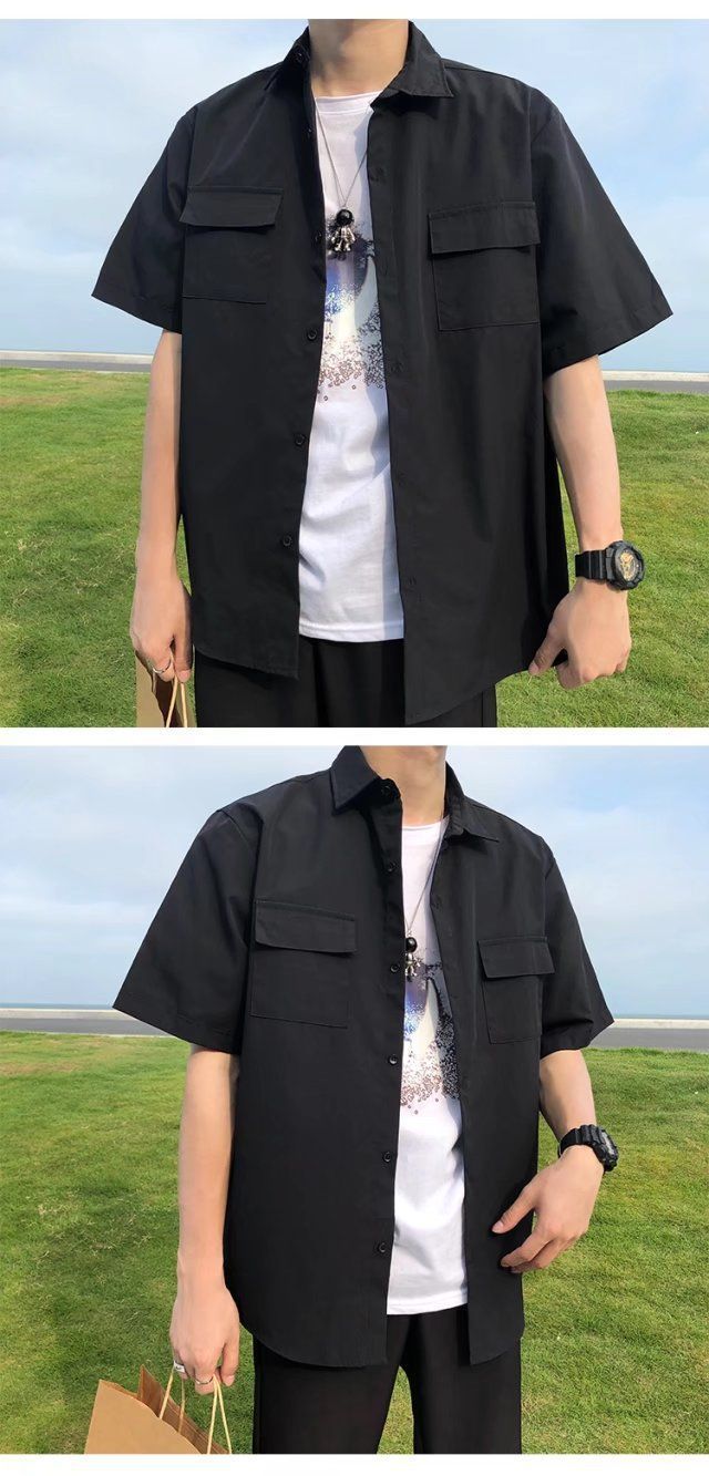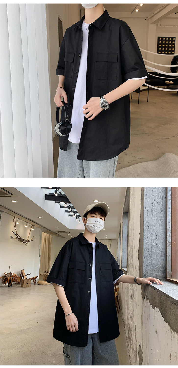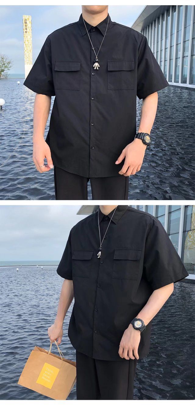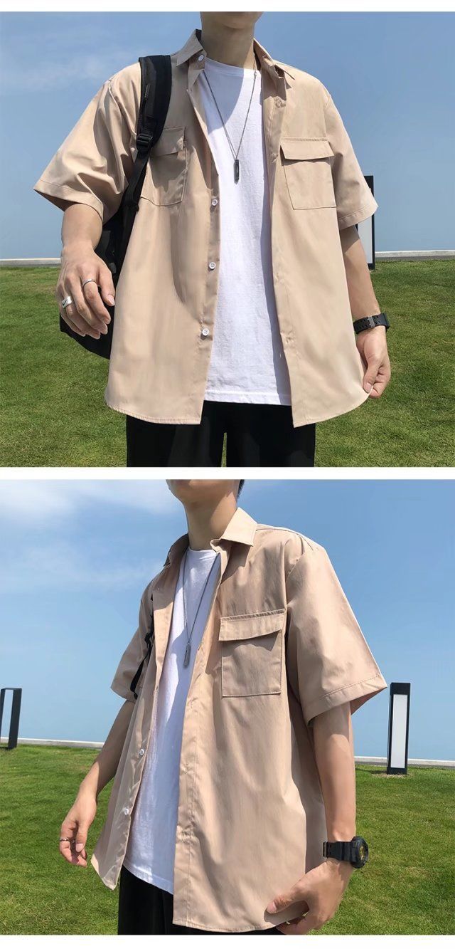 툴링 스타일 셔츠 남자 반팔 여름 느슨한 홍콩 스타일 트렌디 인 올 매치 솔리드 컬러 얇은 포켓 반소매 탑스토어 가기