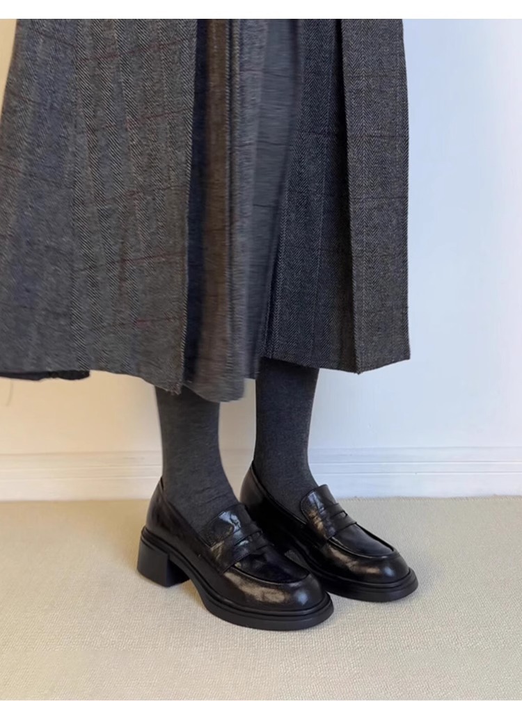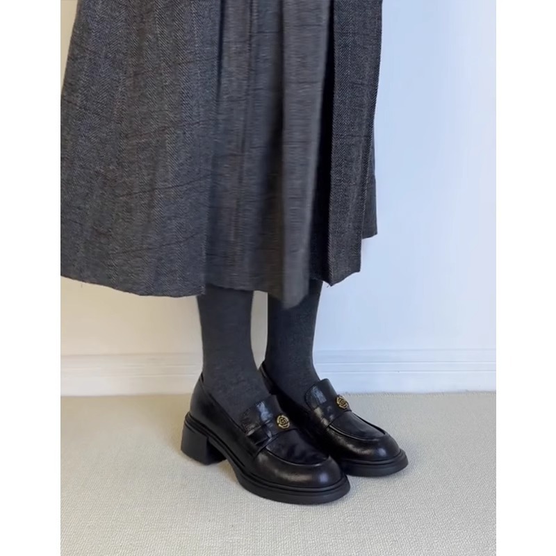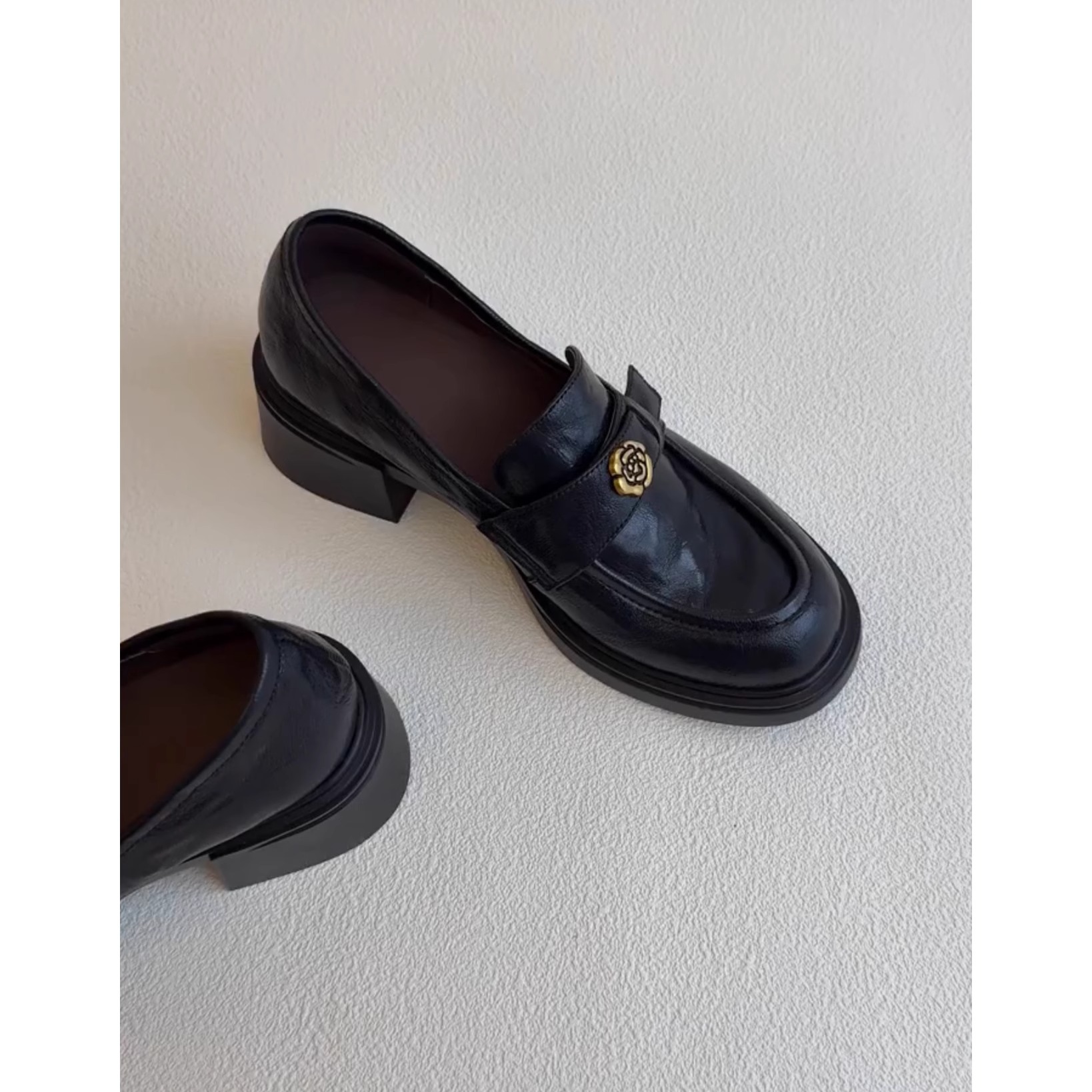 Cowhide Edition ~ 가죽 두꺼운 힐 영국 스타일 동백 라운드 헤드 슬립 온 로퍼 여성 레트로 작은 가죽 신발 싱글 레이어 신발스토어 가기