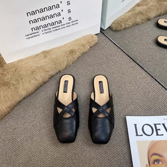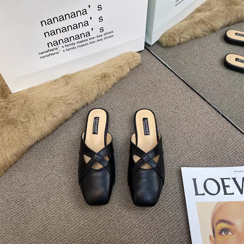 여자 아우터웨어 레트로 올매치 스퀘어 토를위한 프랑스 스타일 오픈 발가락 샌들 한국식 크로스 벨트 얕은 오픈 홀 오픈 토 하프 드래그스토어 가기