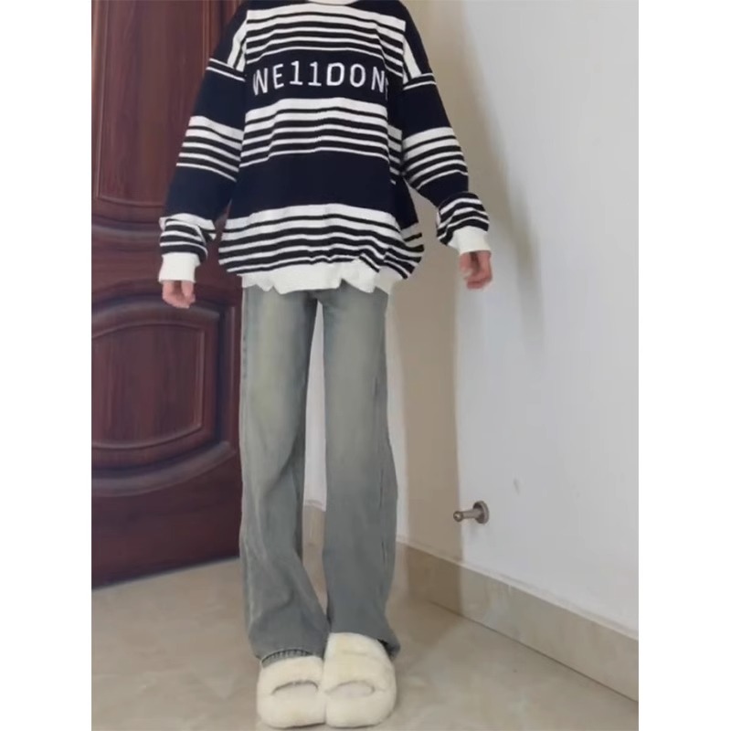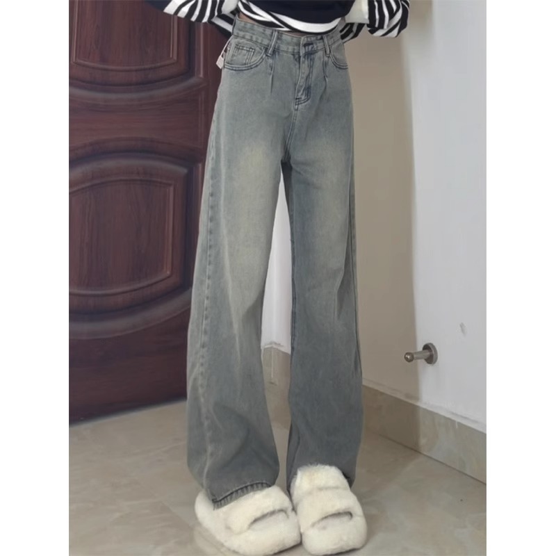 플러스 사이즈 통통녀 높은 허리 넓은 다리 청바지 여성의 봄과 가을 새로운 틈새 디자인 센스 스트레이트 루즈 트렌디 한 걸레 바지스토어 가기