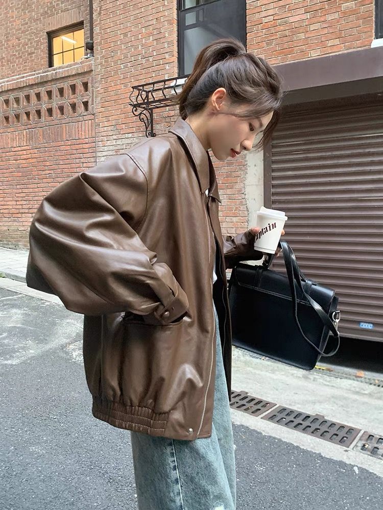 레트로 브라운 가죽 자켓 여성용 숏 스타일 2025 가을용 한국 스타일 루즈핏 가죽 자켓 멋진 바이커 자켓스토어 가기