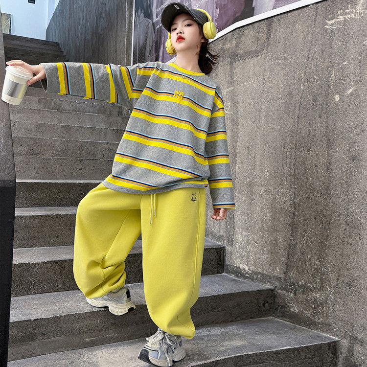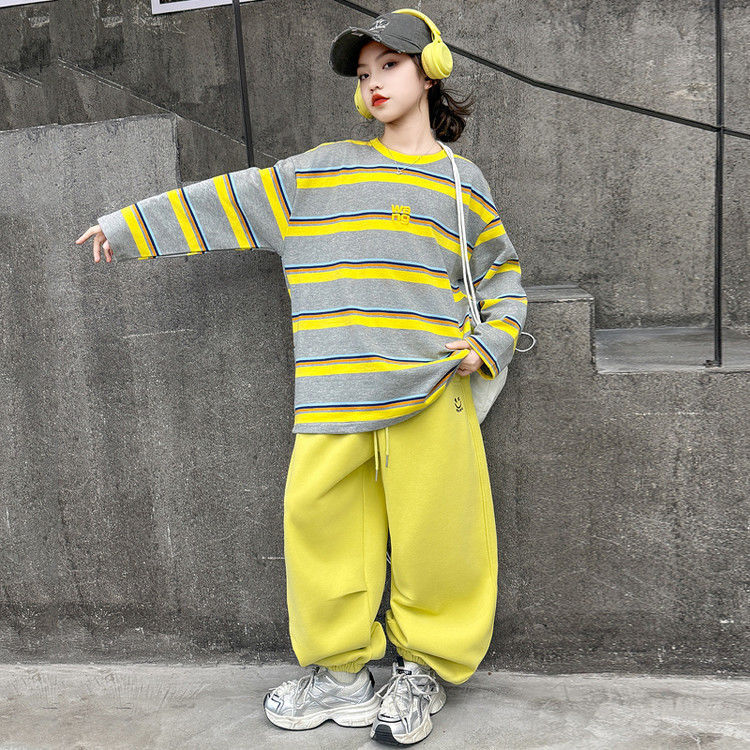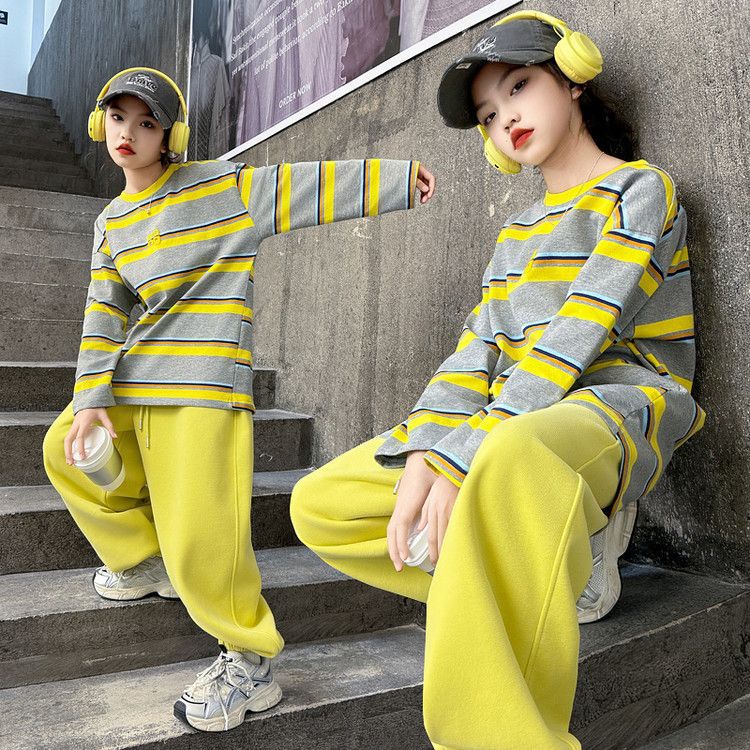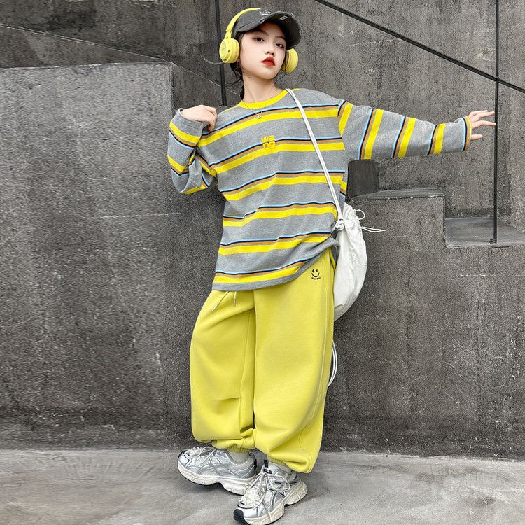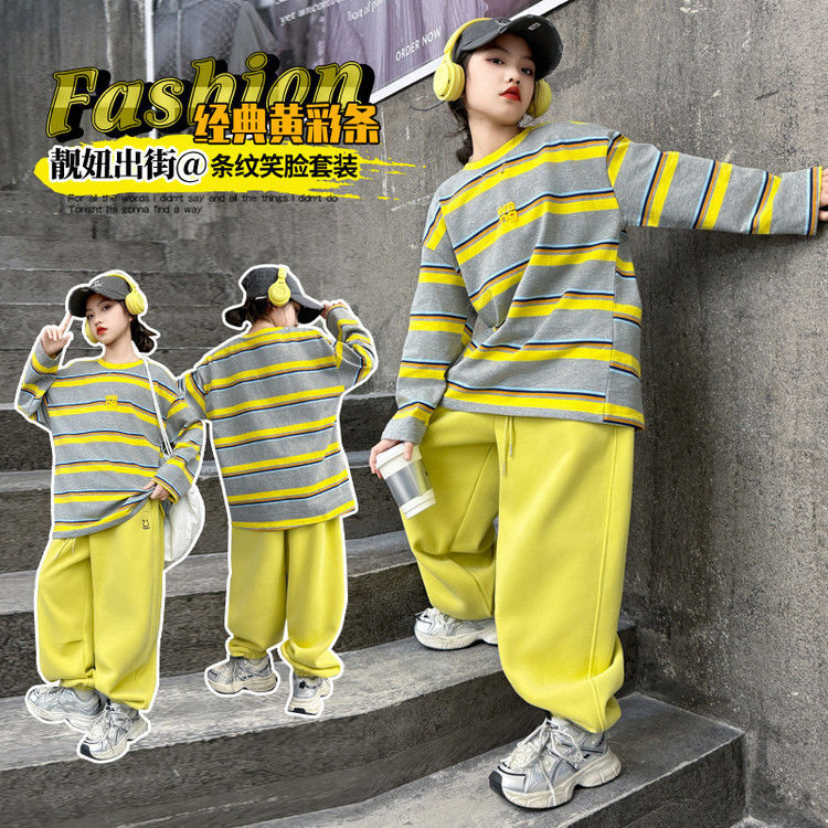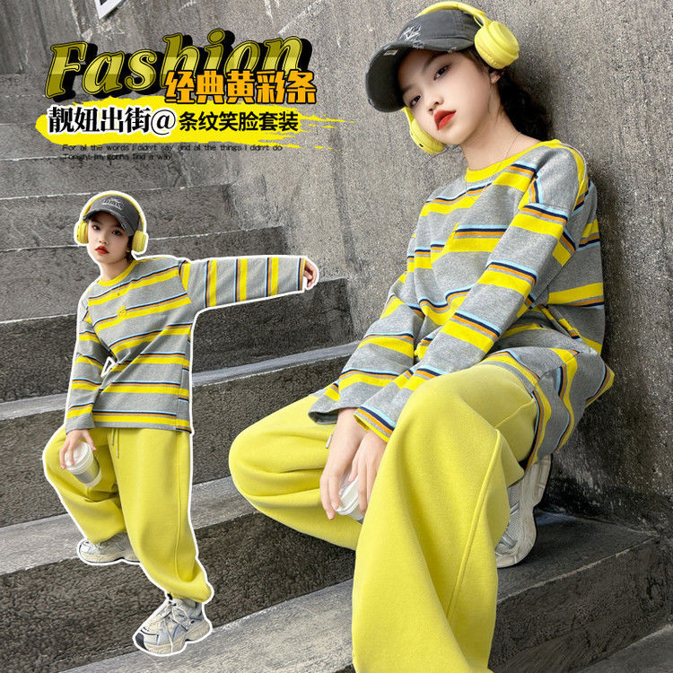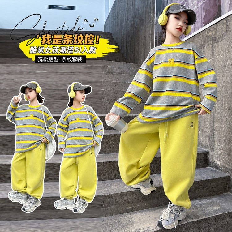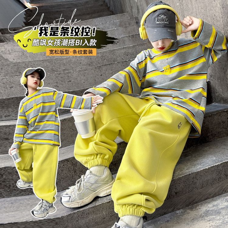 여자 서양식 줄무늬 세트 2025 새로운 어린이 루즈 스포츠 프라이팬 스트리트 미들 및 빅 어린이 풀오버 스웨트 셔츠 투피스 세트스토어 가기