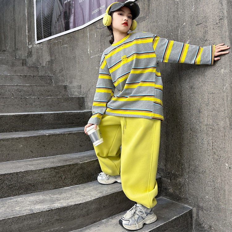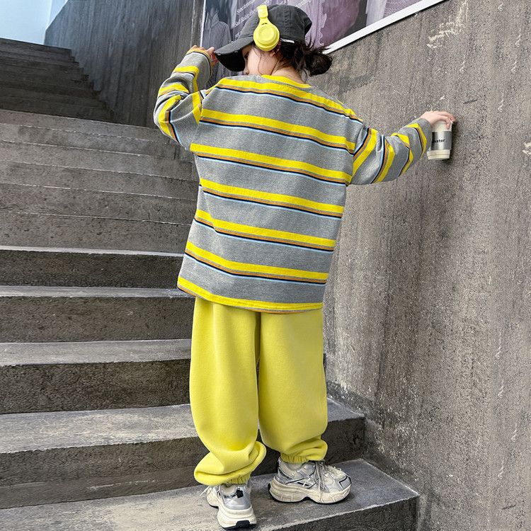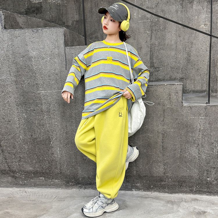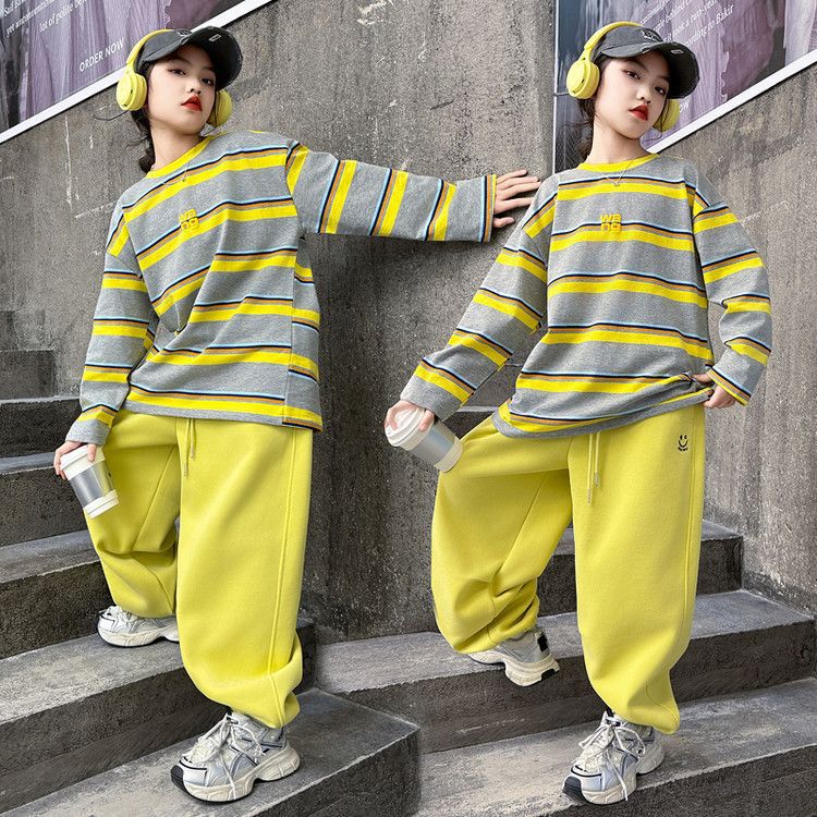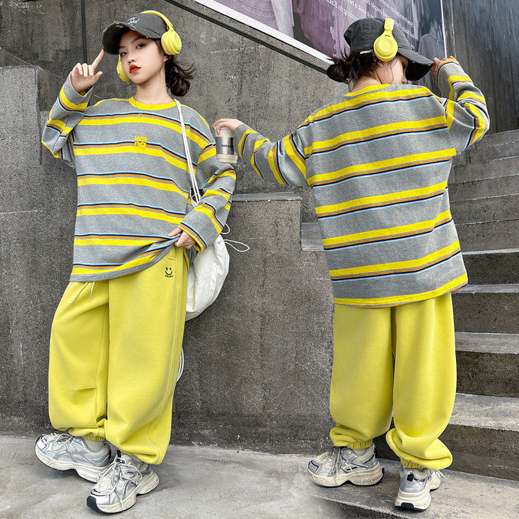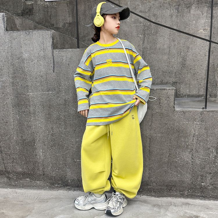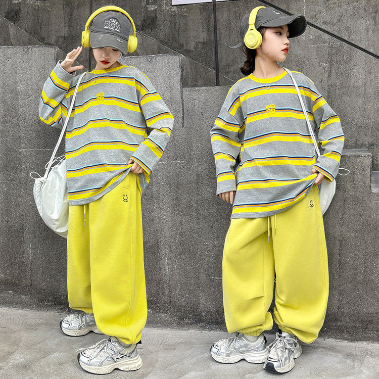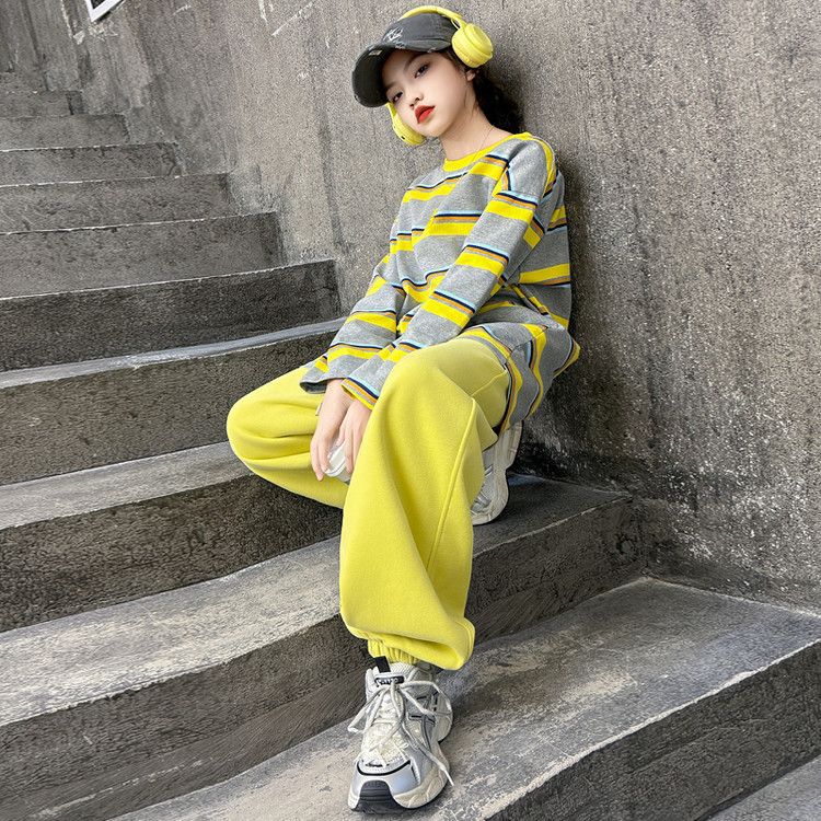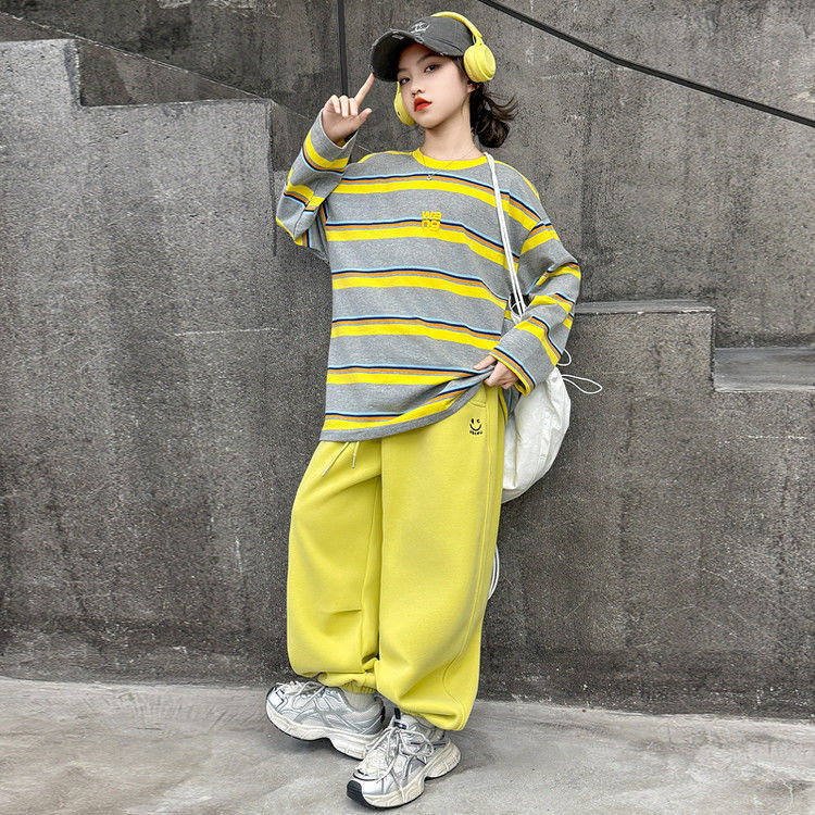 여자 서양식 줄무늬 세트 2025 새로운 어린이 루즈 스포츠 프라이팬 스트리트 미들 및 빅 어린이 풀오버 스웨트 셔츠 투피스 세트스토어 가기