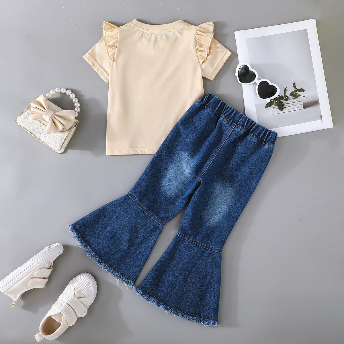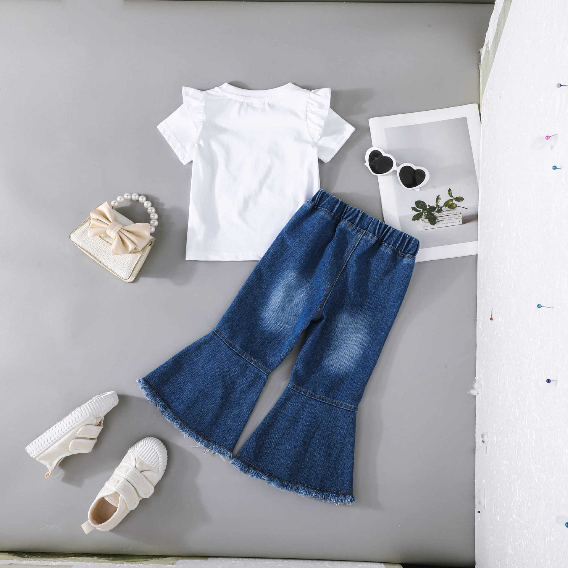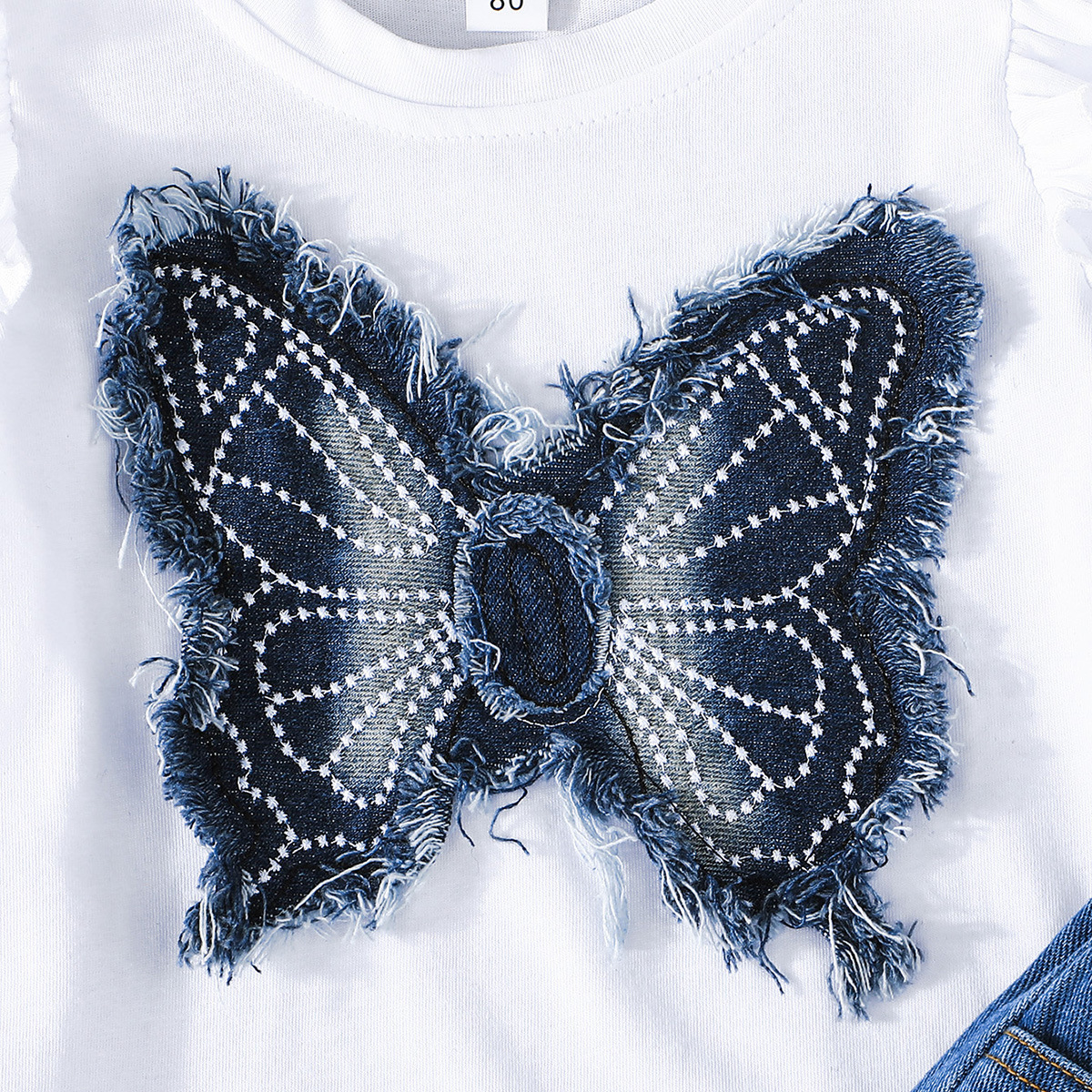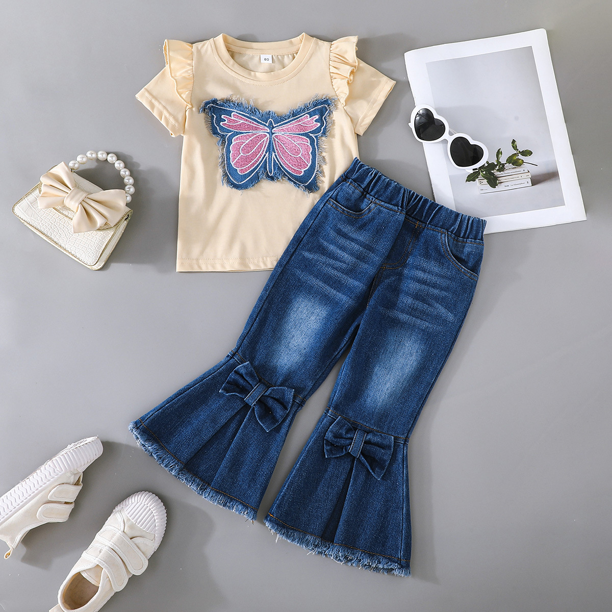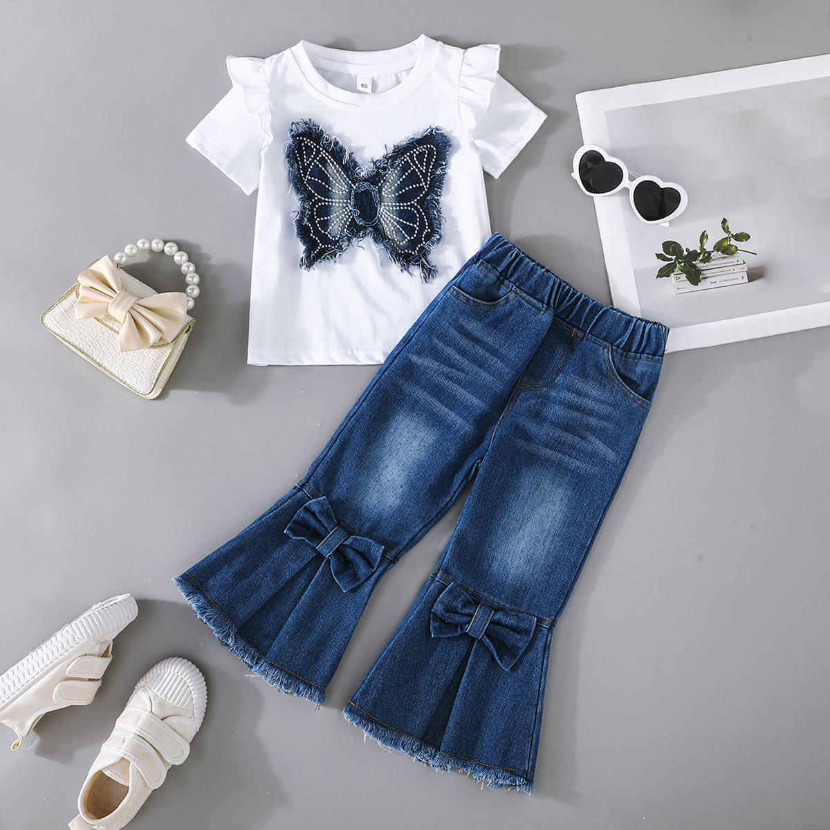 2025 여름 소녀 캐주얼 나비 인쇄 짧은 소매 재킷 데님 나비 장식 플레어 바지 세트 머리카락스토어 가기