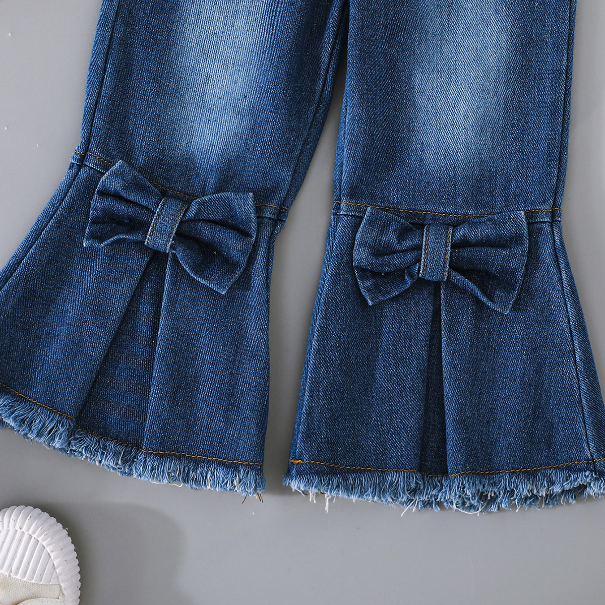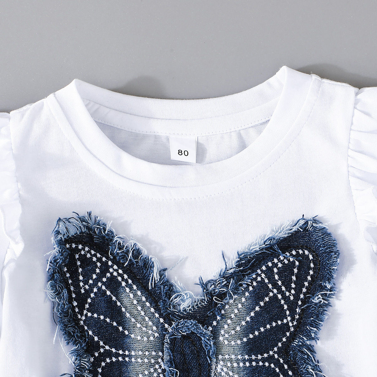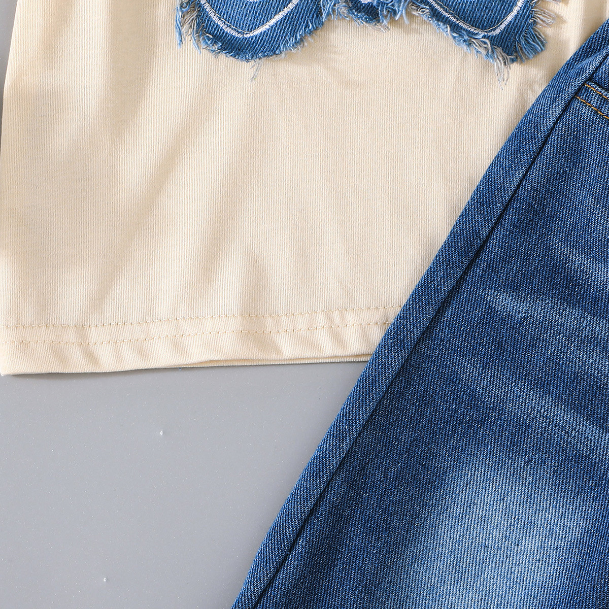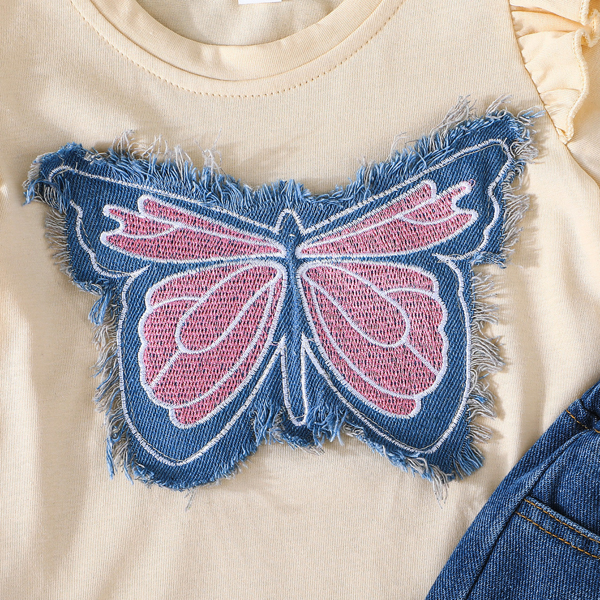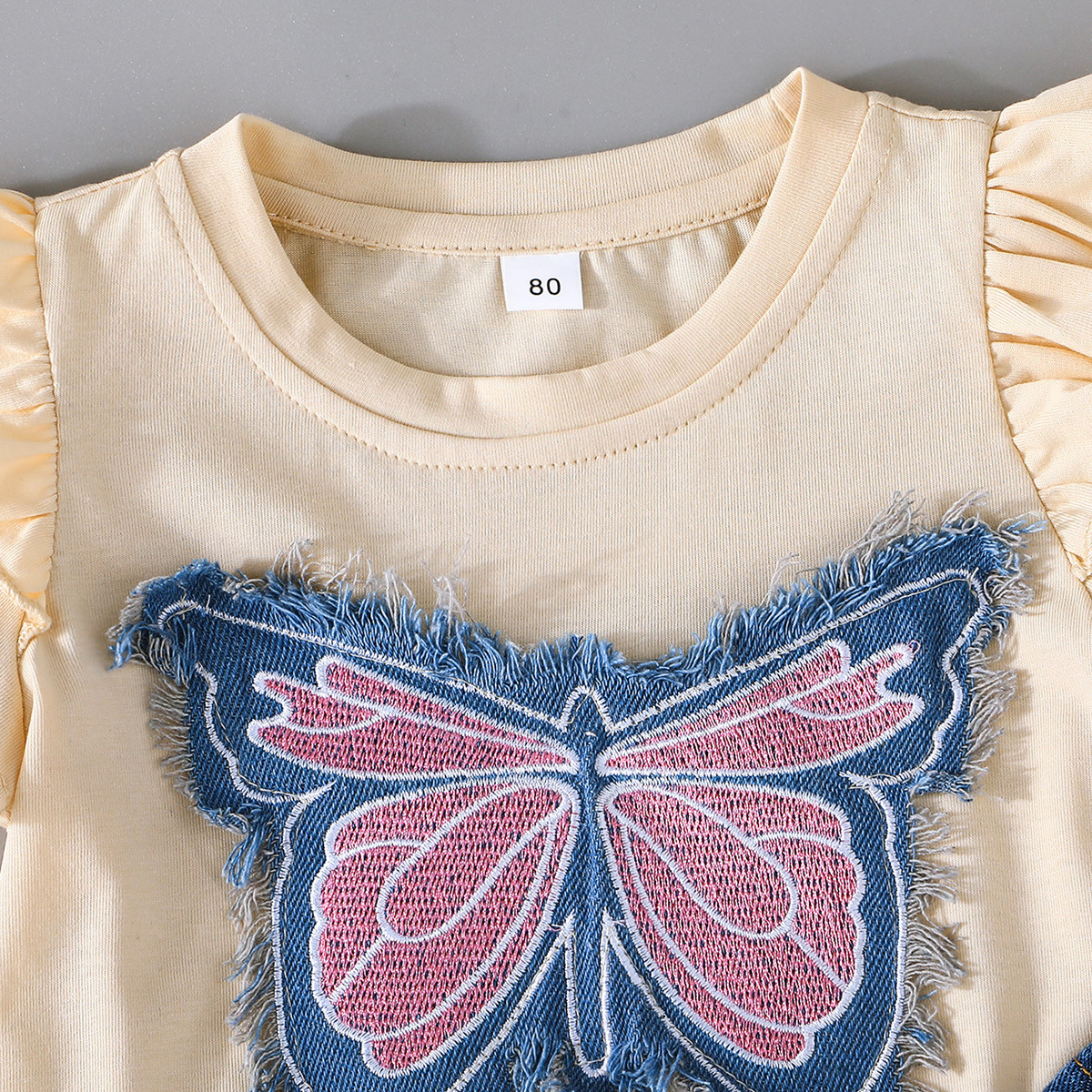 2025 여름 소녀 캐주얼 나비 인쇄 짧은 소매 재킷 데님 나비 장식 플레어 바지 세트 머리카락스토어 가기