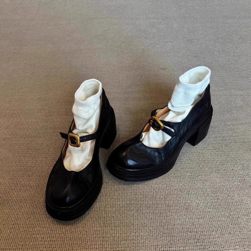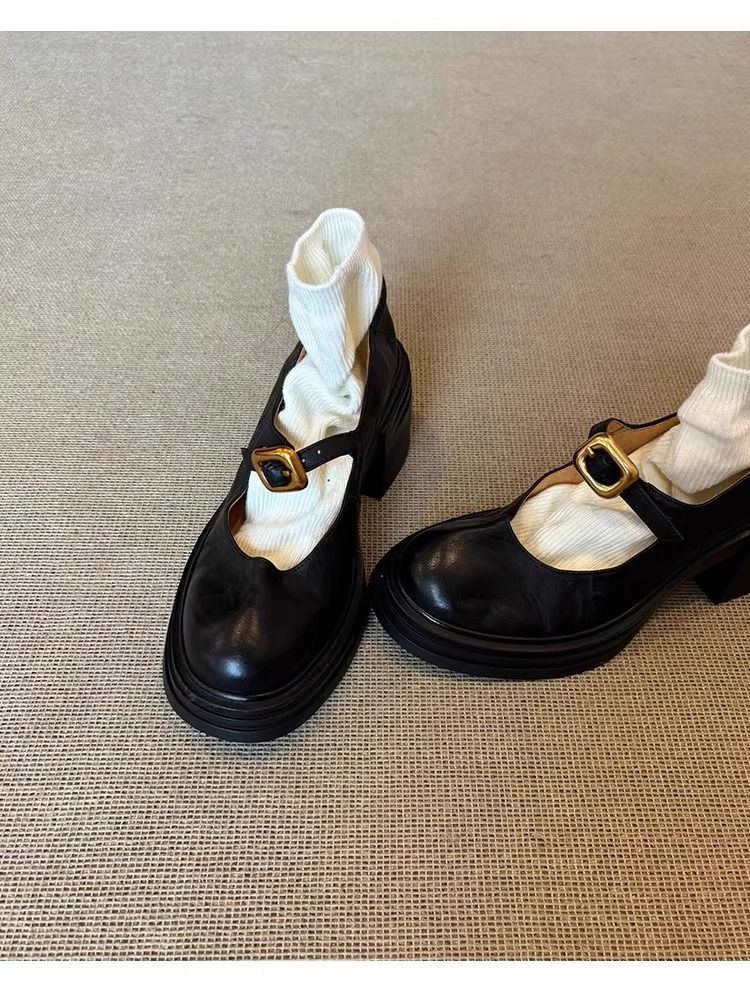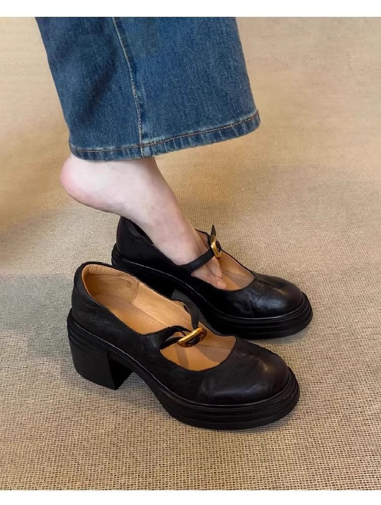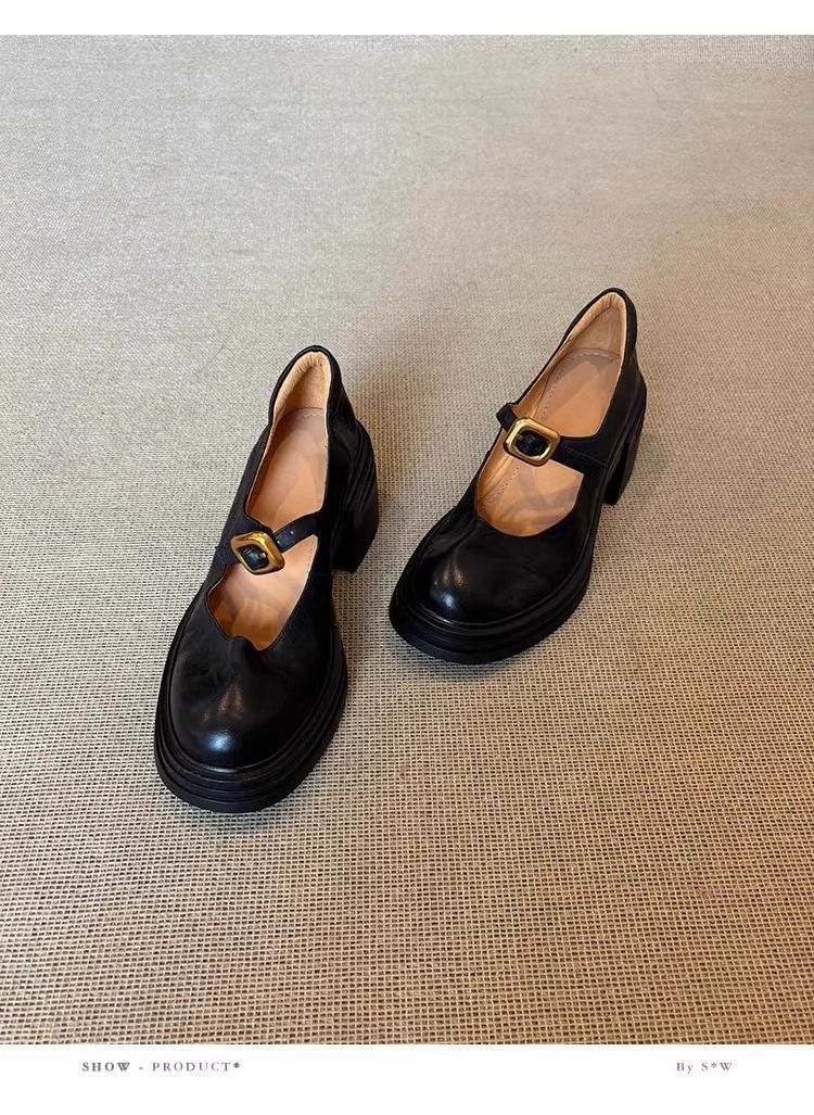 프랑스 복고풍 둥근 발가락 두꺼운 바닥 가죽 신발 여성의 2025 가을 겨울 새로운 영국 얕은 컷 힐 하이힐 메리 제인 신발스토어 가기