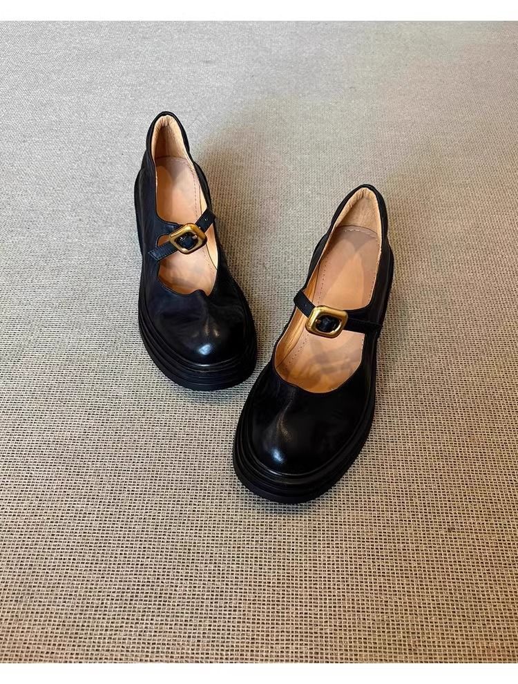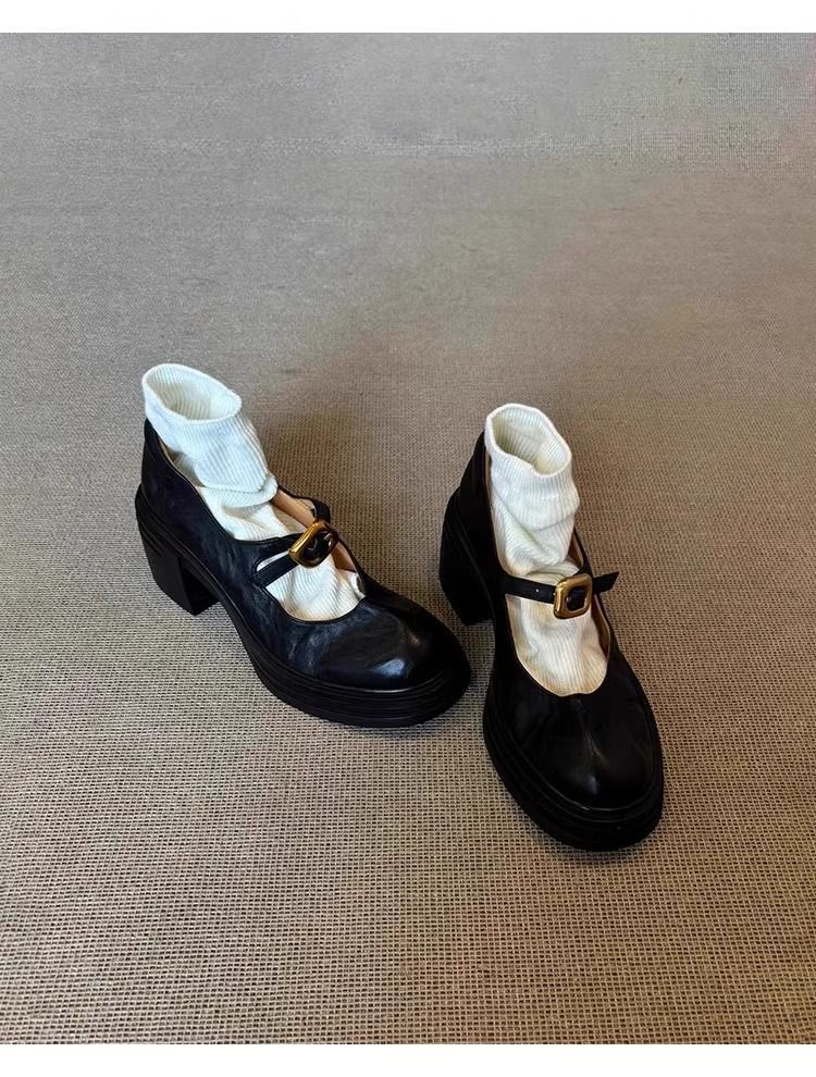 프랑스 복고풍 둥근 발가락 두꺼운 바닥 가죽 신발 여성의 2025 가을 겨울 새로운 영국 얕은 컷 힐 하이힐 메리 제인 신발