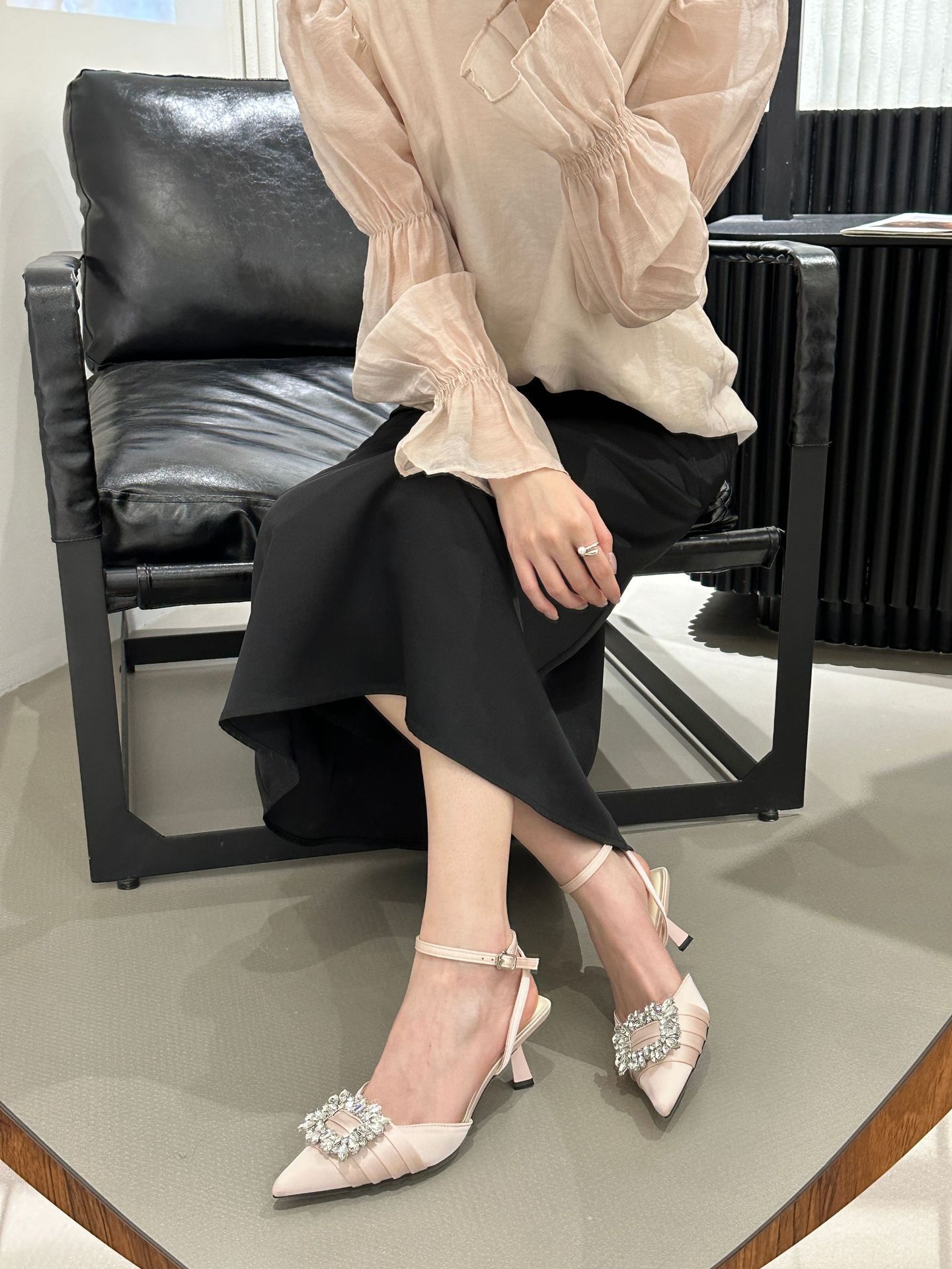 프랑스 스타일 우아한 라인스톤 발가락 샌들 2025 새로운 스틸레토 힐 뾰족한 하이힐 숙녀 뒷여행 얕은 입 신발스토어 가기