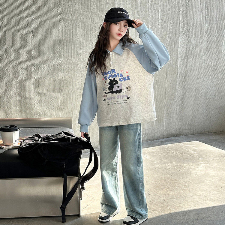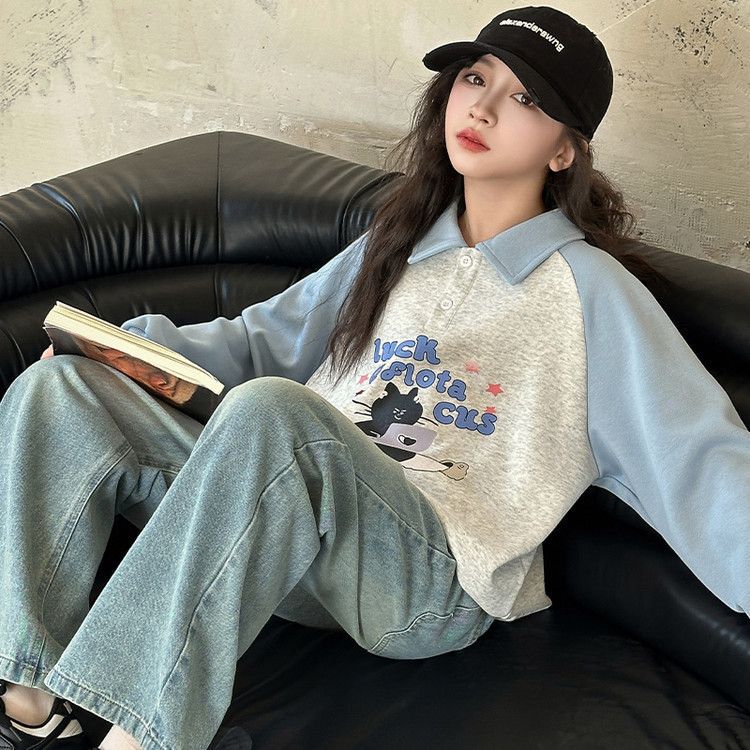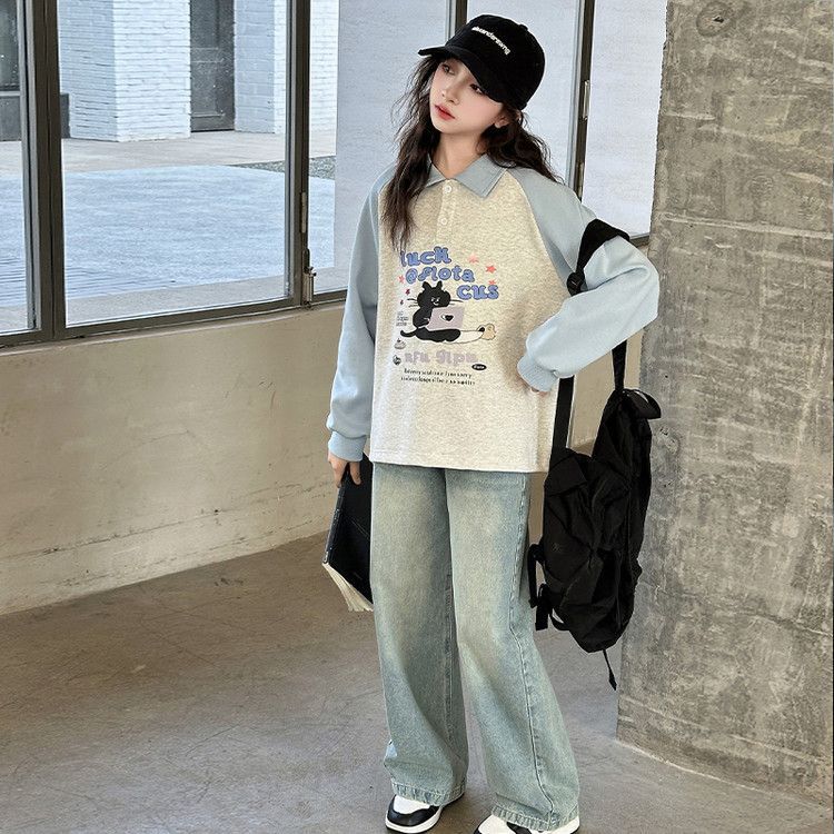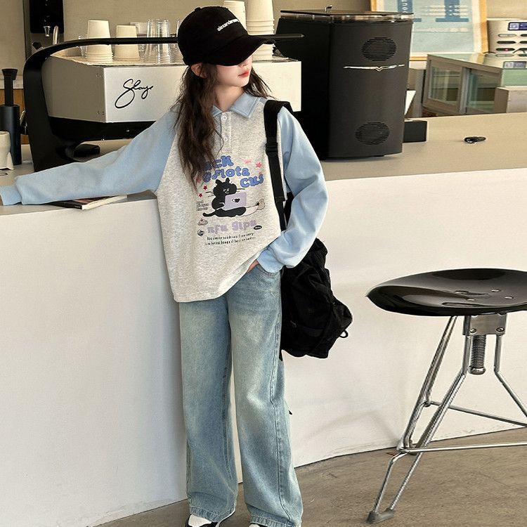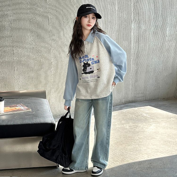 소녀 폴로 칼라 스웨트 셔츠 봄과 가을 2025 새로운 어린이 서양식 인터넷 연예인 거리 최고 소녀의 봄 세트스토어 가기