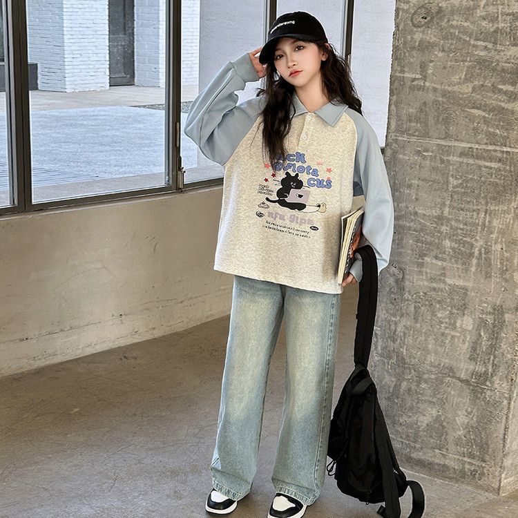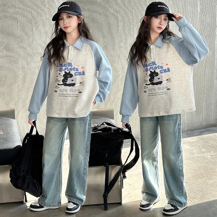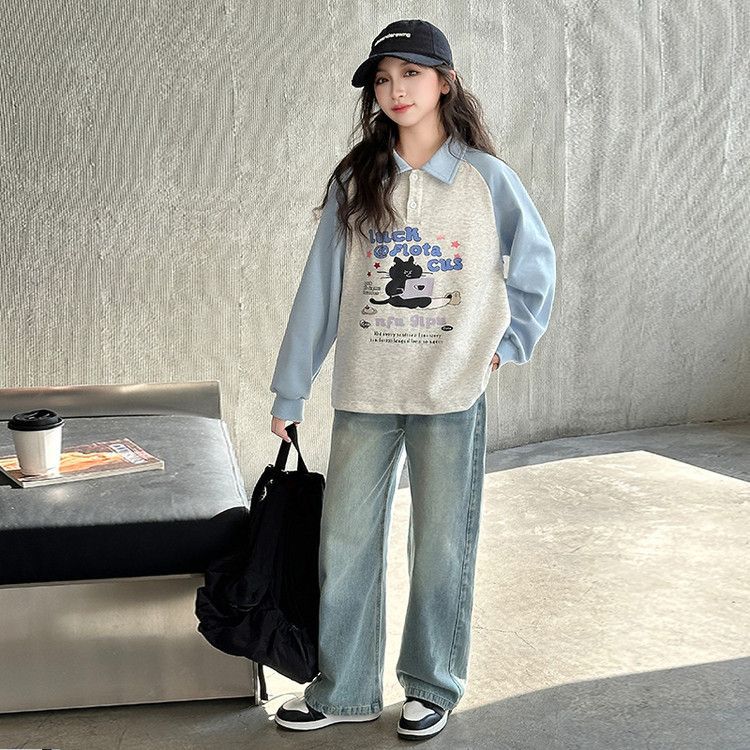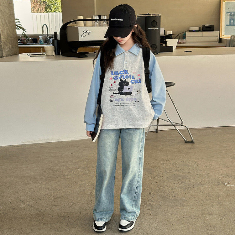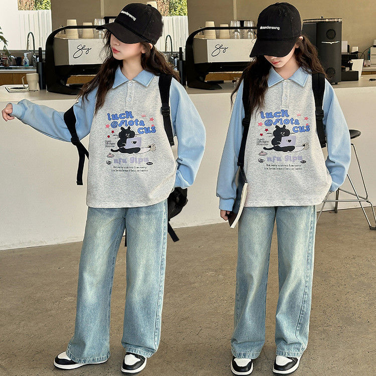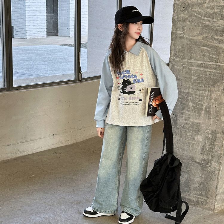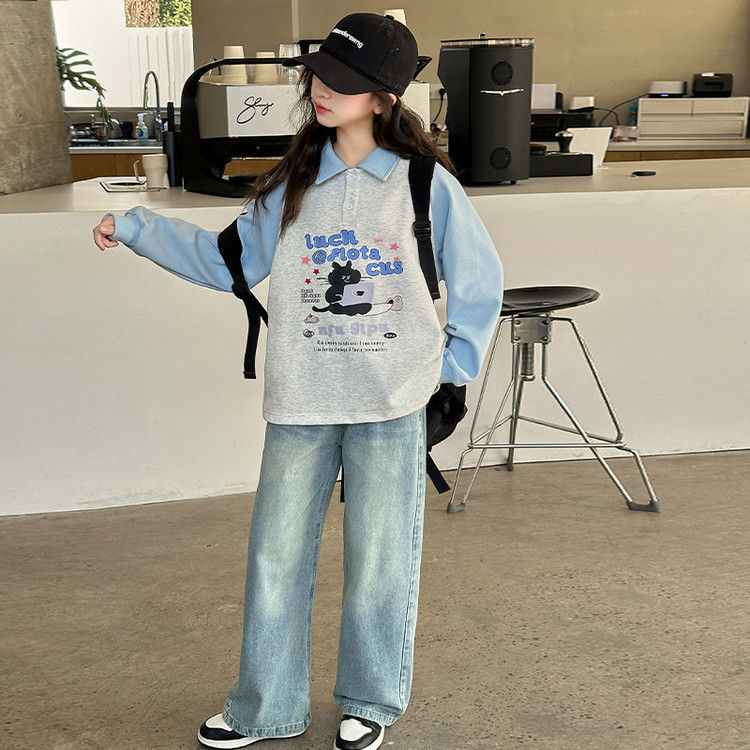 소녀 폴로 칼라 스웨트 셔츠 봄과 가을 2025 새로운 어린이 서양식 인터넷 연예인 거리 최고 소녀의 봄 세트