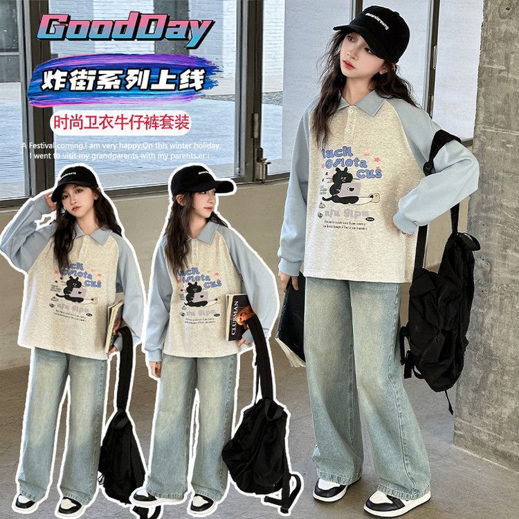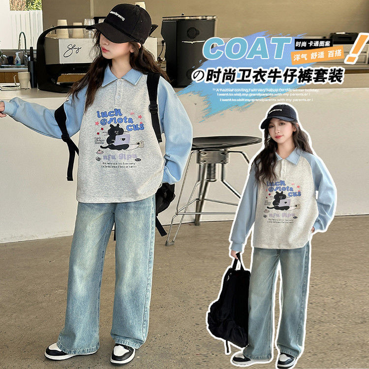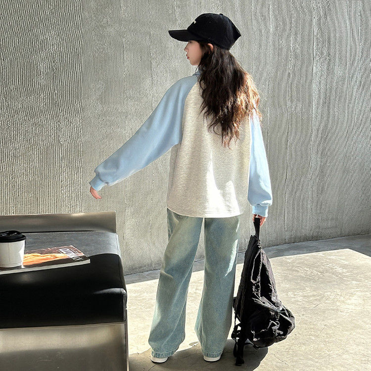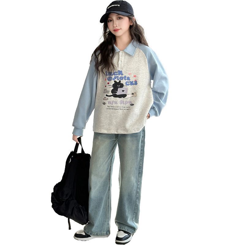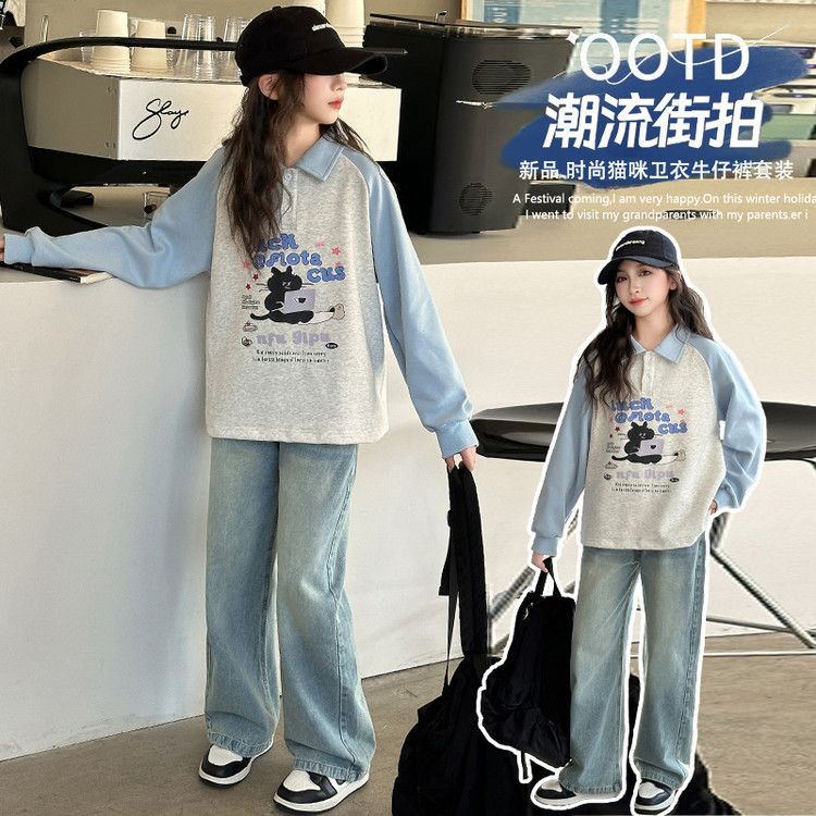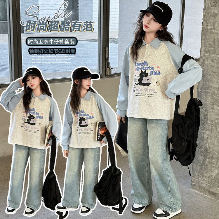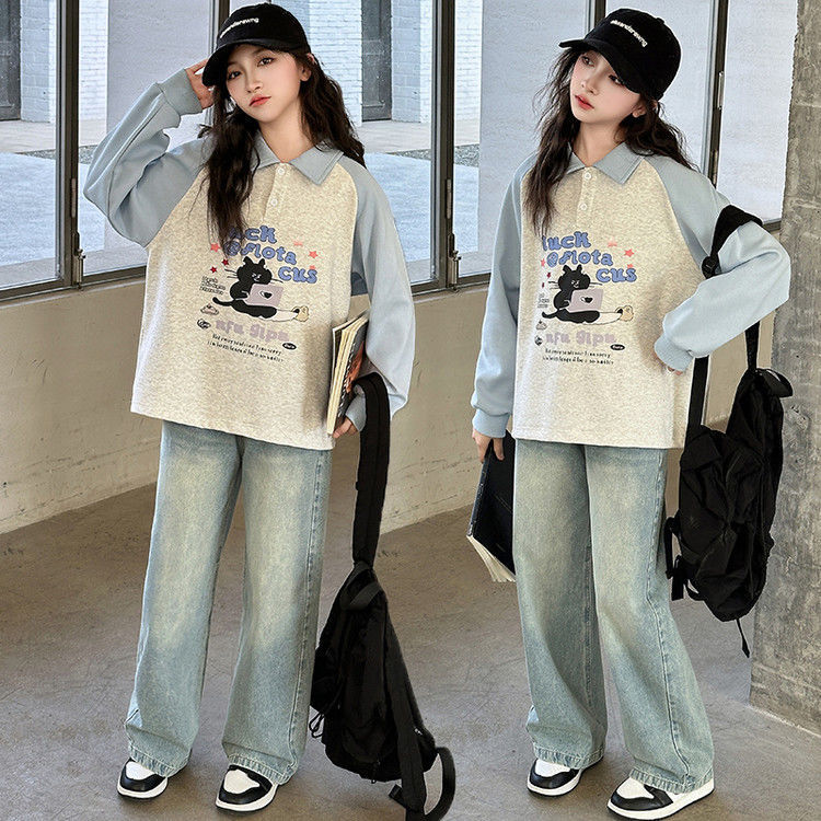 소녀 폴로 칼라 스웨트 셔츠 봄과 가을 2025 새로운 어린이 서양식 인터넷 연예인 거리 최고 소녀의 봄 세트