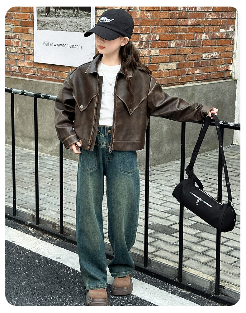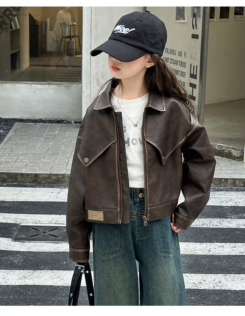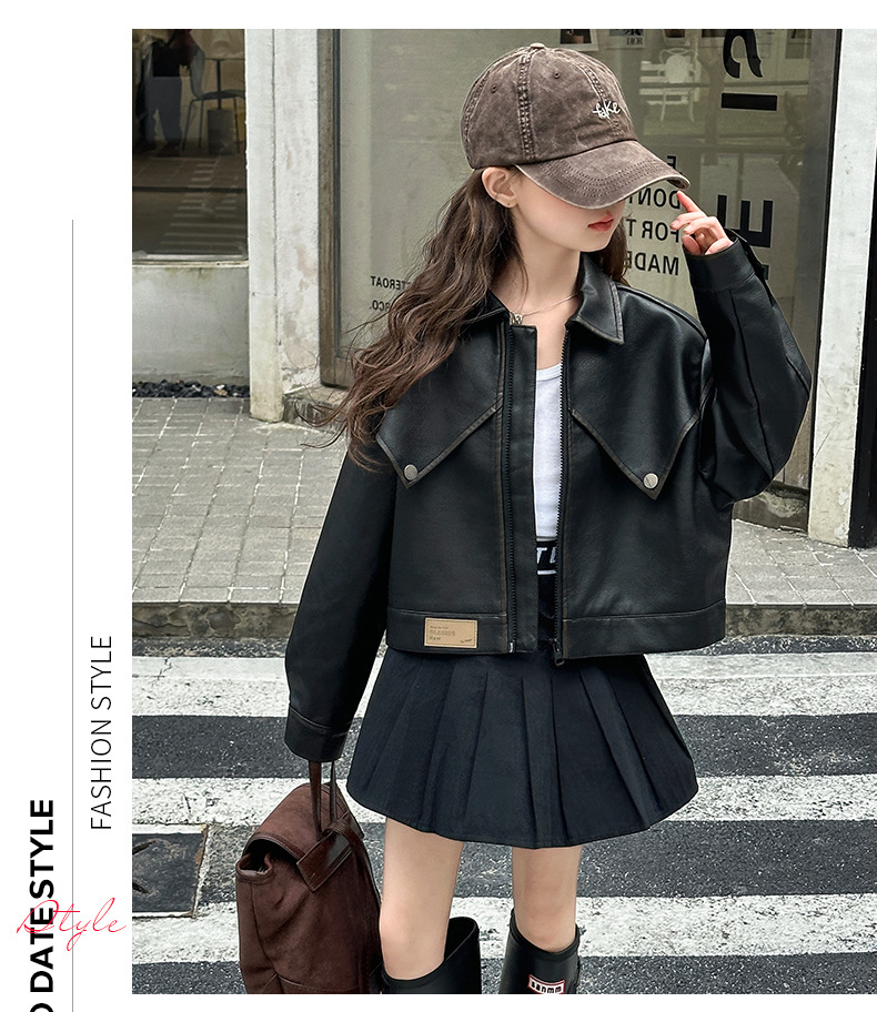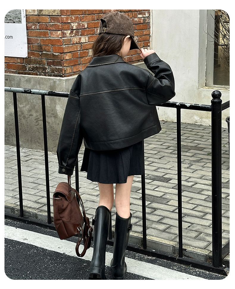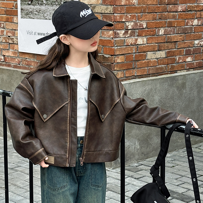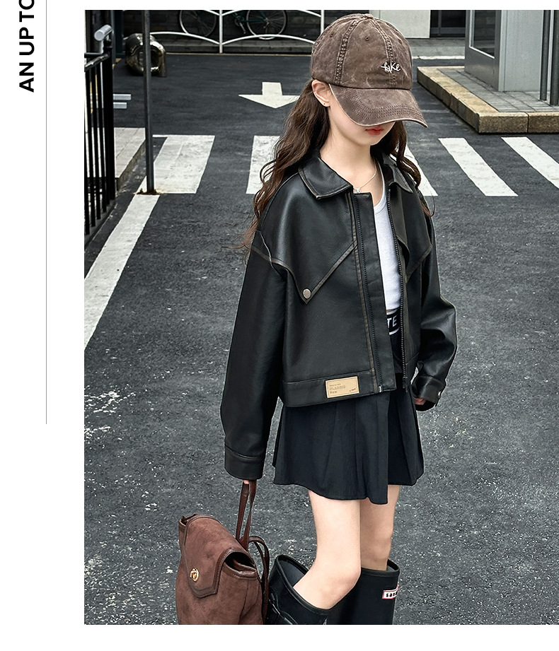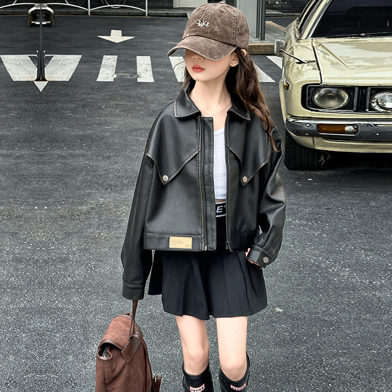 소녀 옷깃 가죽 자켓 봄 2025 새로운 소녀 패션 가죽 자켓 어린이 캐주얼 짧은 pu 가죽 코트 트렌디스토어 가기