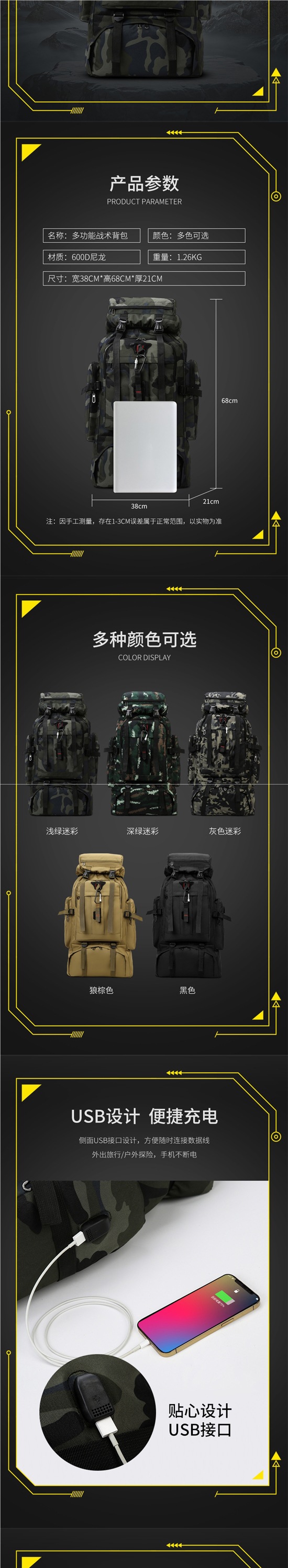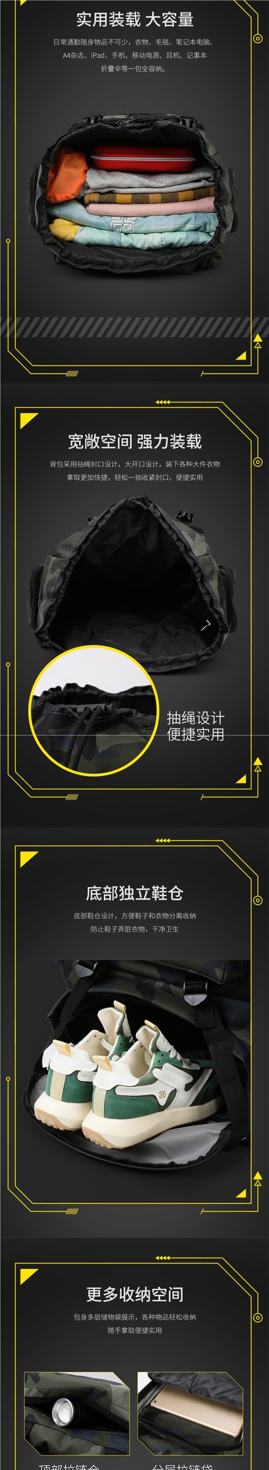 • [모델] 황포 위장 색상 [독립 신발 수납공간/3D 통기성 백팩/업그레이드된 USB 인터페이스/나노 방수 원단]